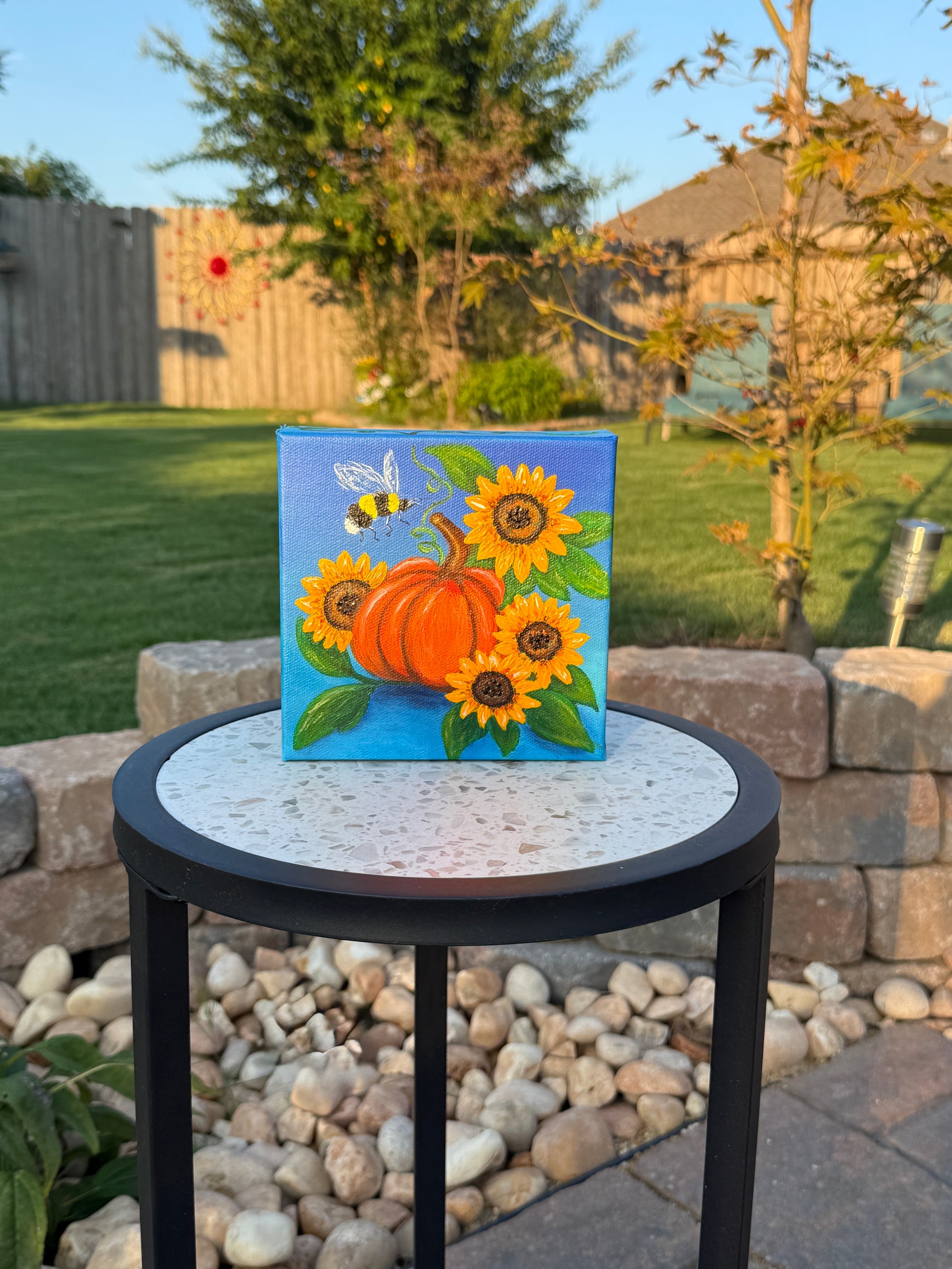 Celebrate the cozy charm of fall with this playful 6x6 acrylic painting featuring a bright pumpkin, cheerful sunflowers, and a busy bumblebee. Perfect as shelf art, it adds a splash of autumn joy to any space, inviting a warm and whimsical touch to your décor.