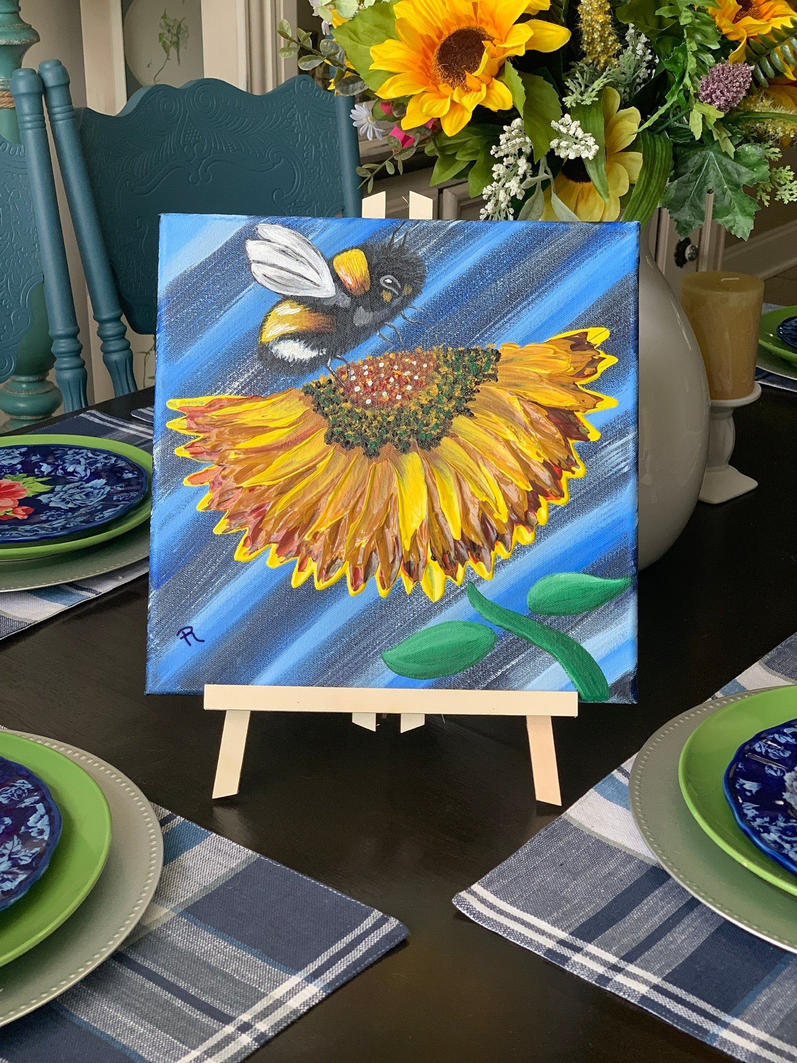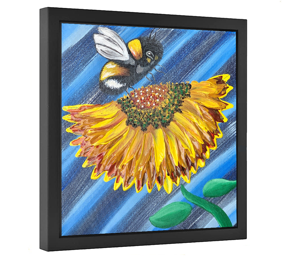 Bring the beauty of nature to your home with this Bee-Utiful Sunflower Acrylic Painting. This stunning piece features an expertly painted image of half a sunflower and a bee flying above the flower on a backdrop of alternating blue hues. Perfect for any room of your home.