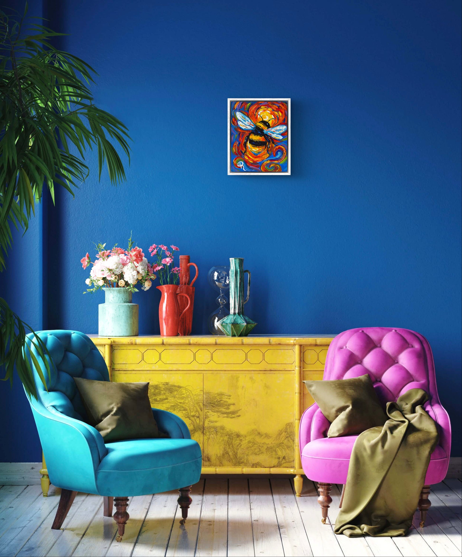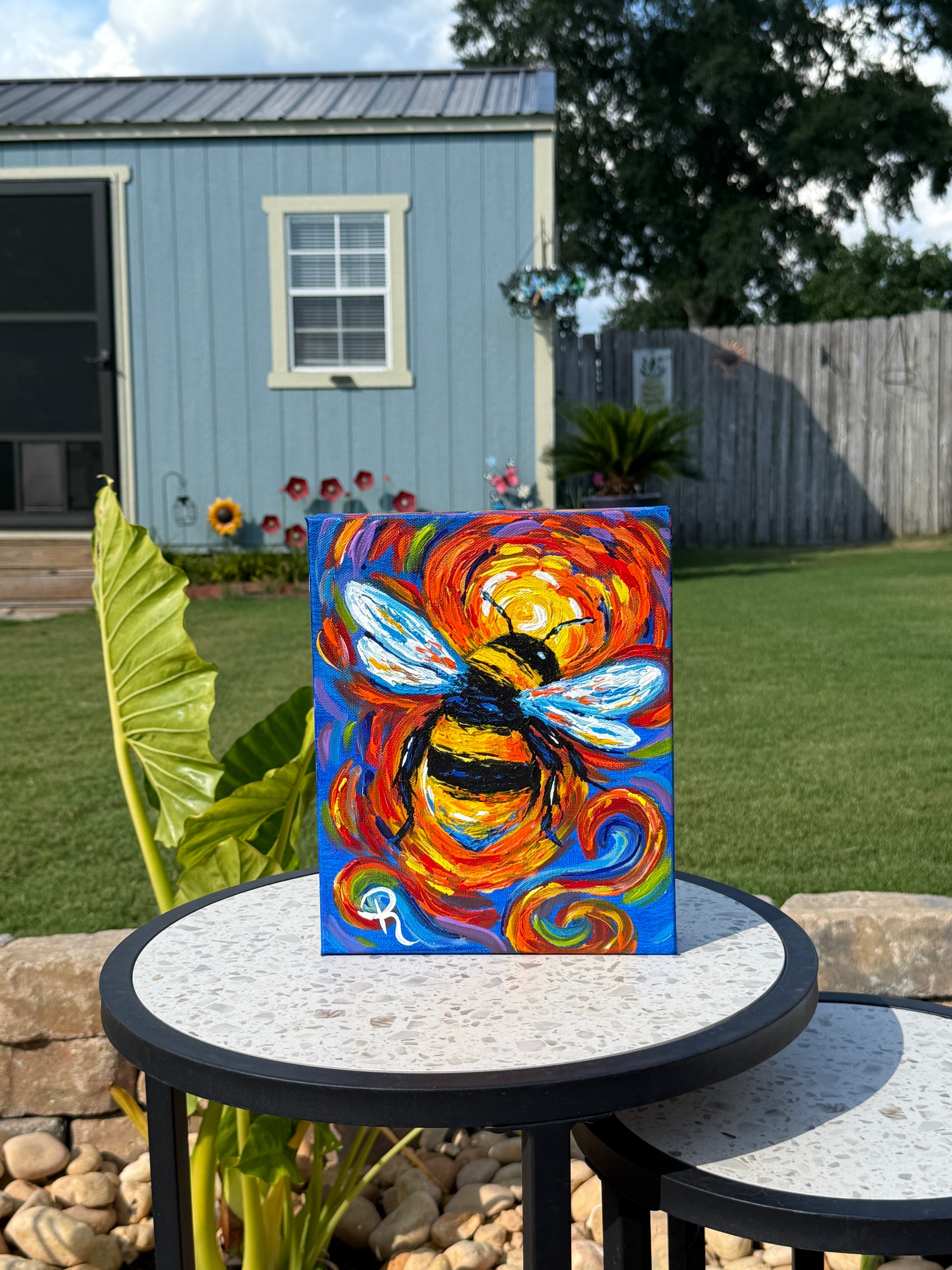 Bring a buzz of energy to your space with this playful Bee Zing Acrylic Painting. Featuring a vibrant bumble bee captured in swirling, vivid colors, this artwork adds a lively and whimsical touch to any room. Perfect for brightening your walls with a splash of motion and cheer.