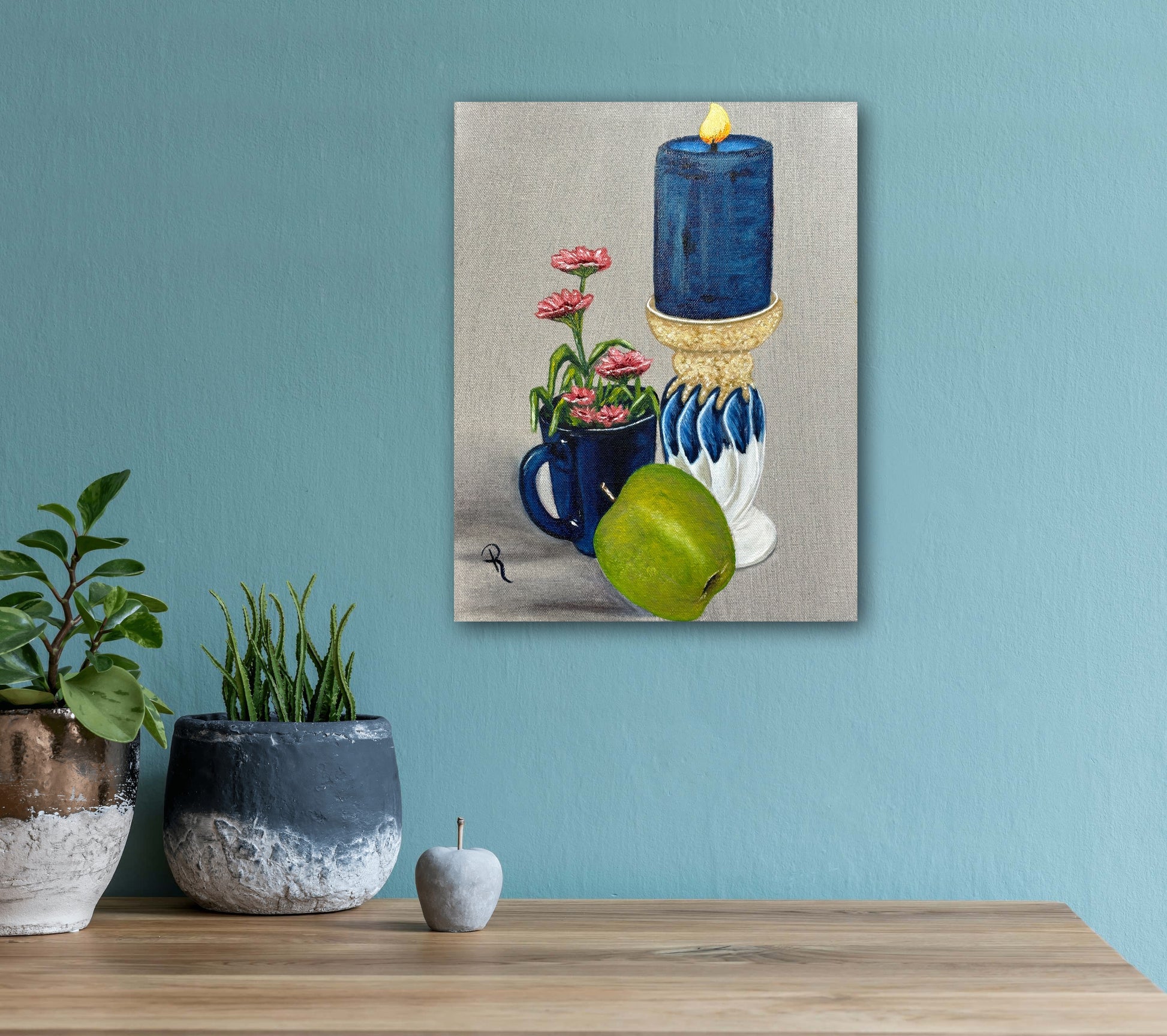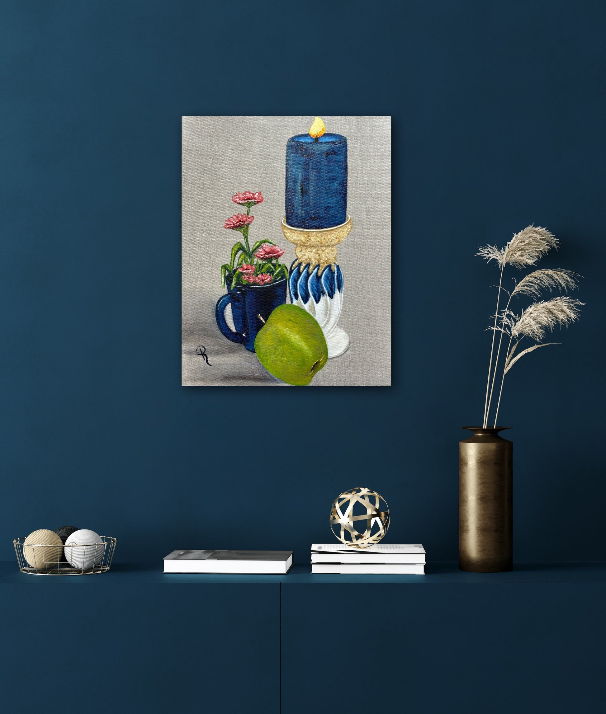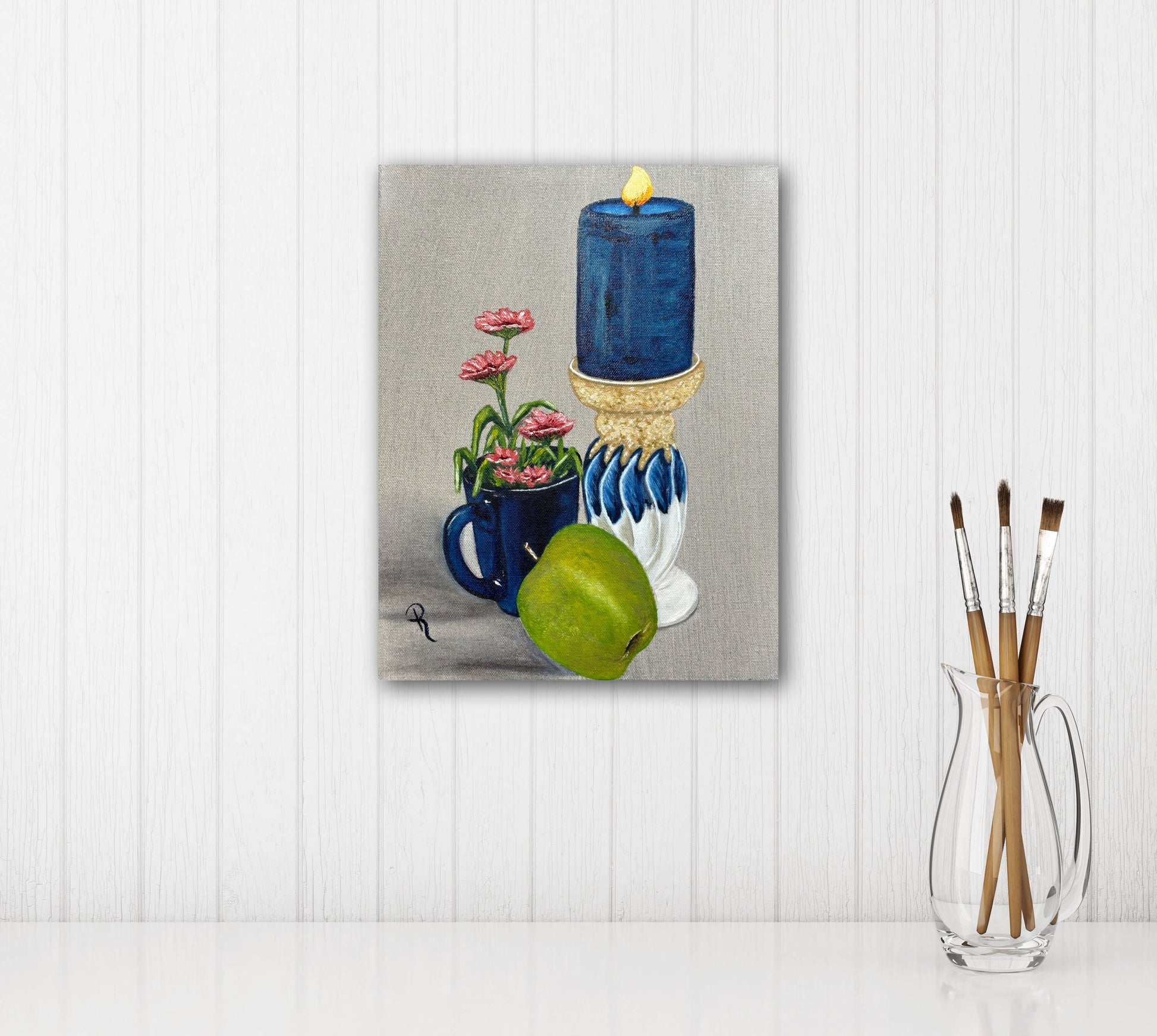 Experience serenity and balance with our Blue and Green Harmony painting. Featuring a blue candle, a pink flower-filled coffee mug, and a crisp green apple, this still life piece brings calmness to any room. Painted with a neutral acrylic background, it adds a touch of sophisticated elegance to your space.