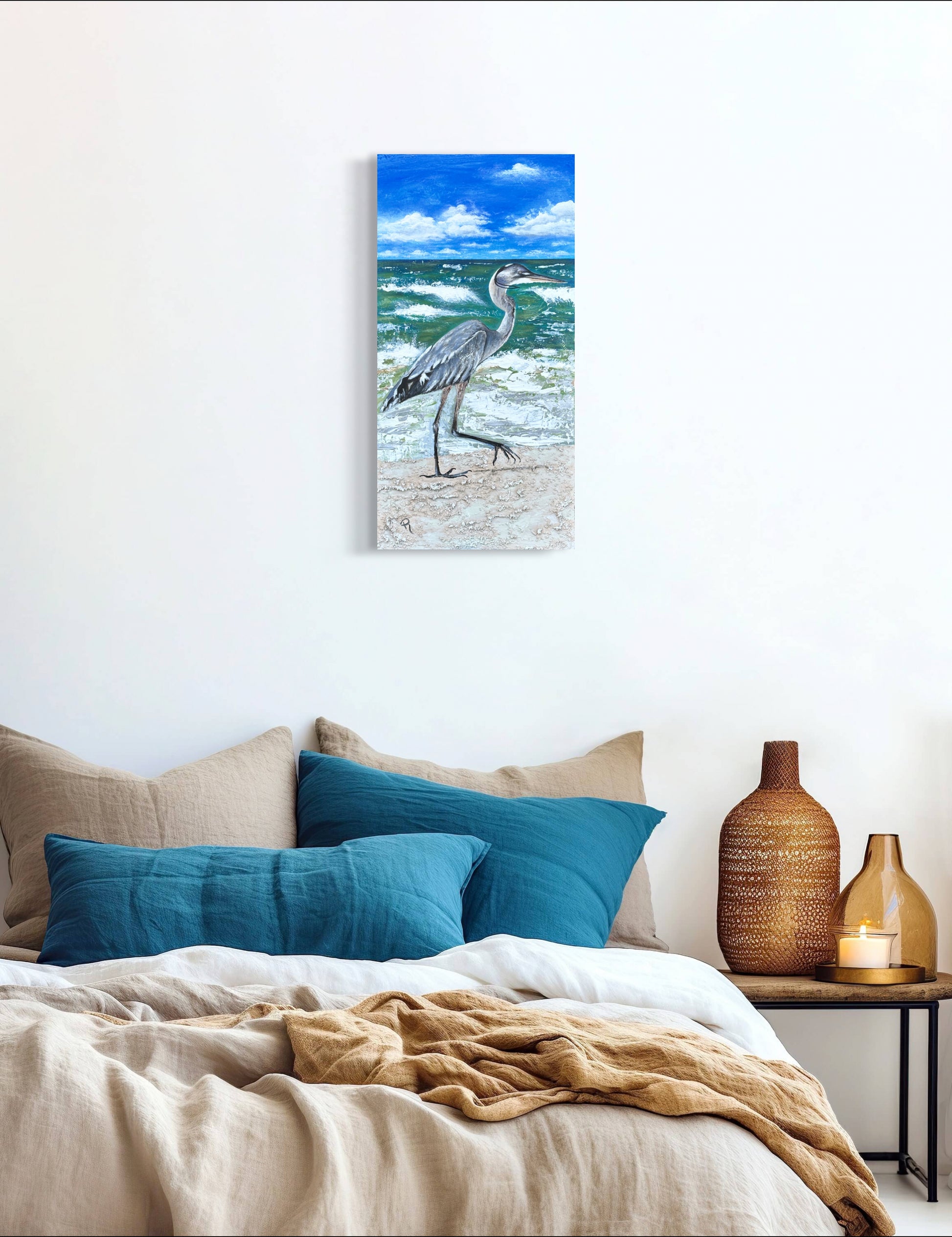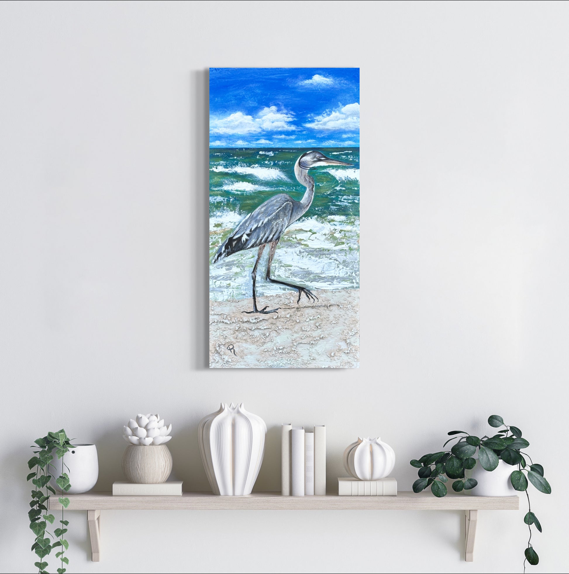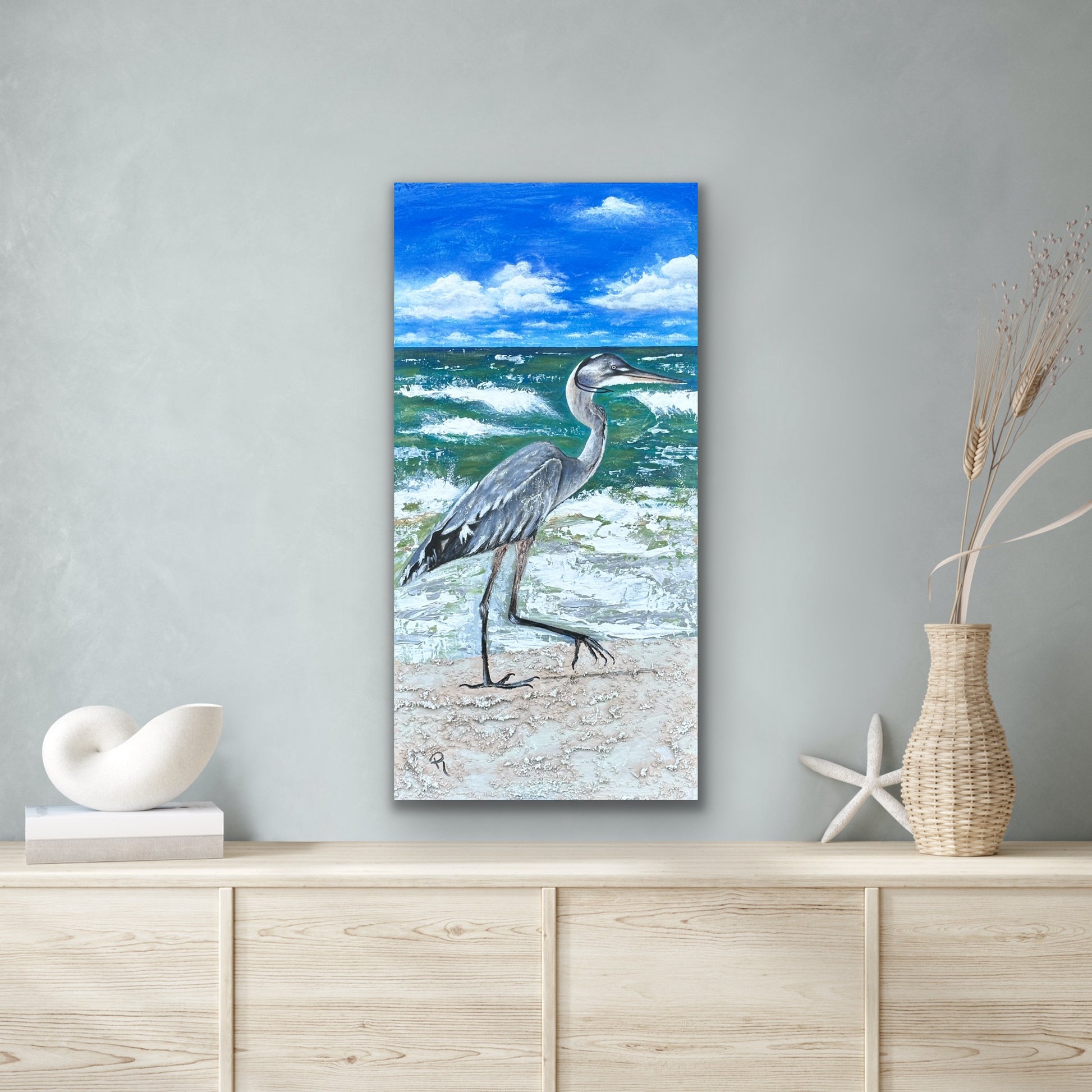 Experience the beauty of nature with our Blue Heron Strut Mixed Media Painting. Featuring a Great Blue Heron gracefully strolling along the beach shoreline, this textured piece will bring a touch of serenity and elegance to any space. Add it to your collection today!