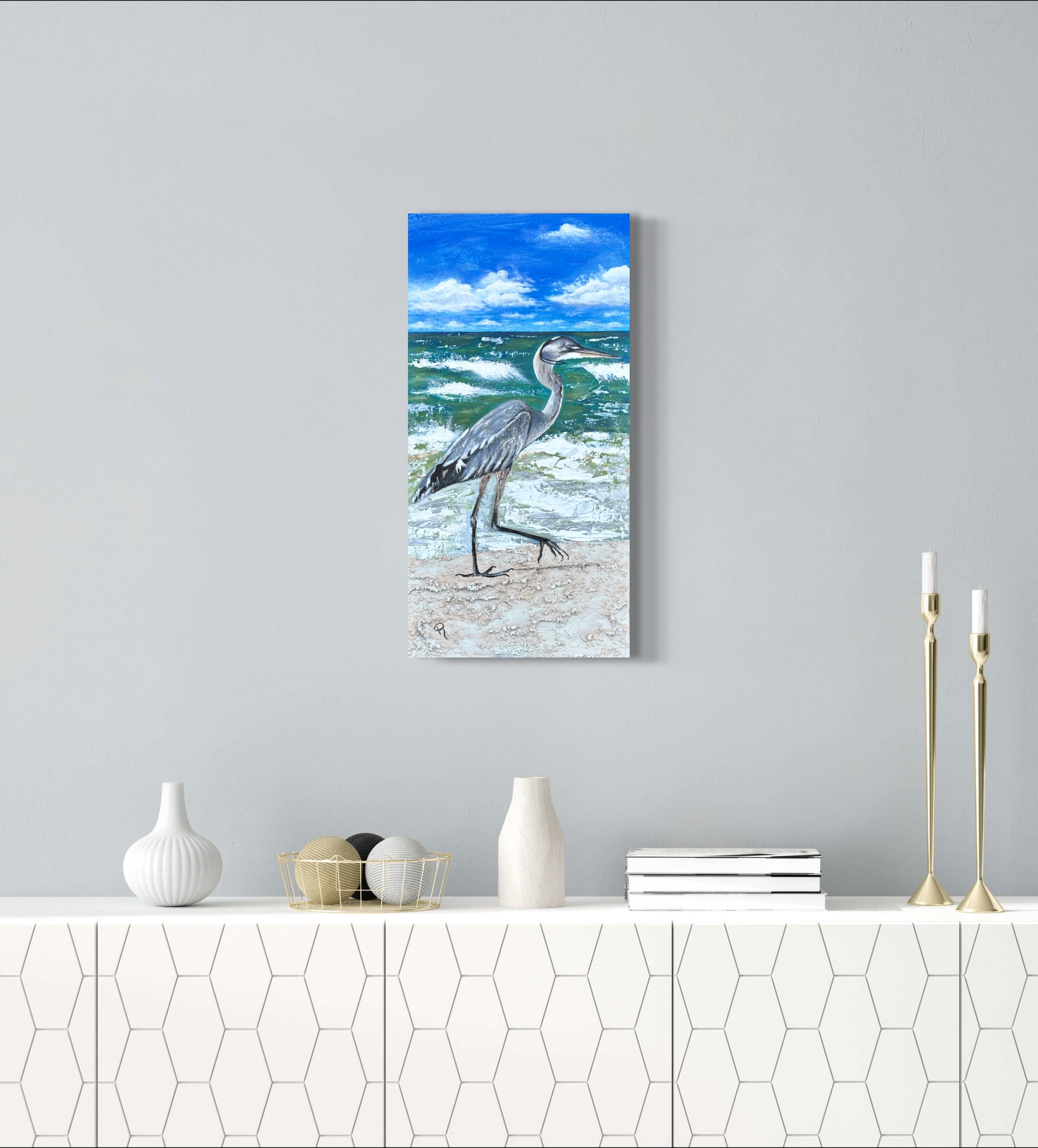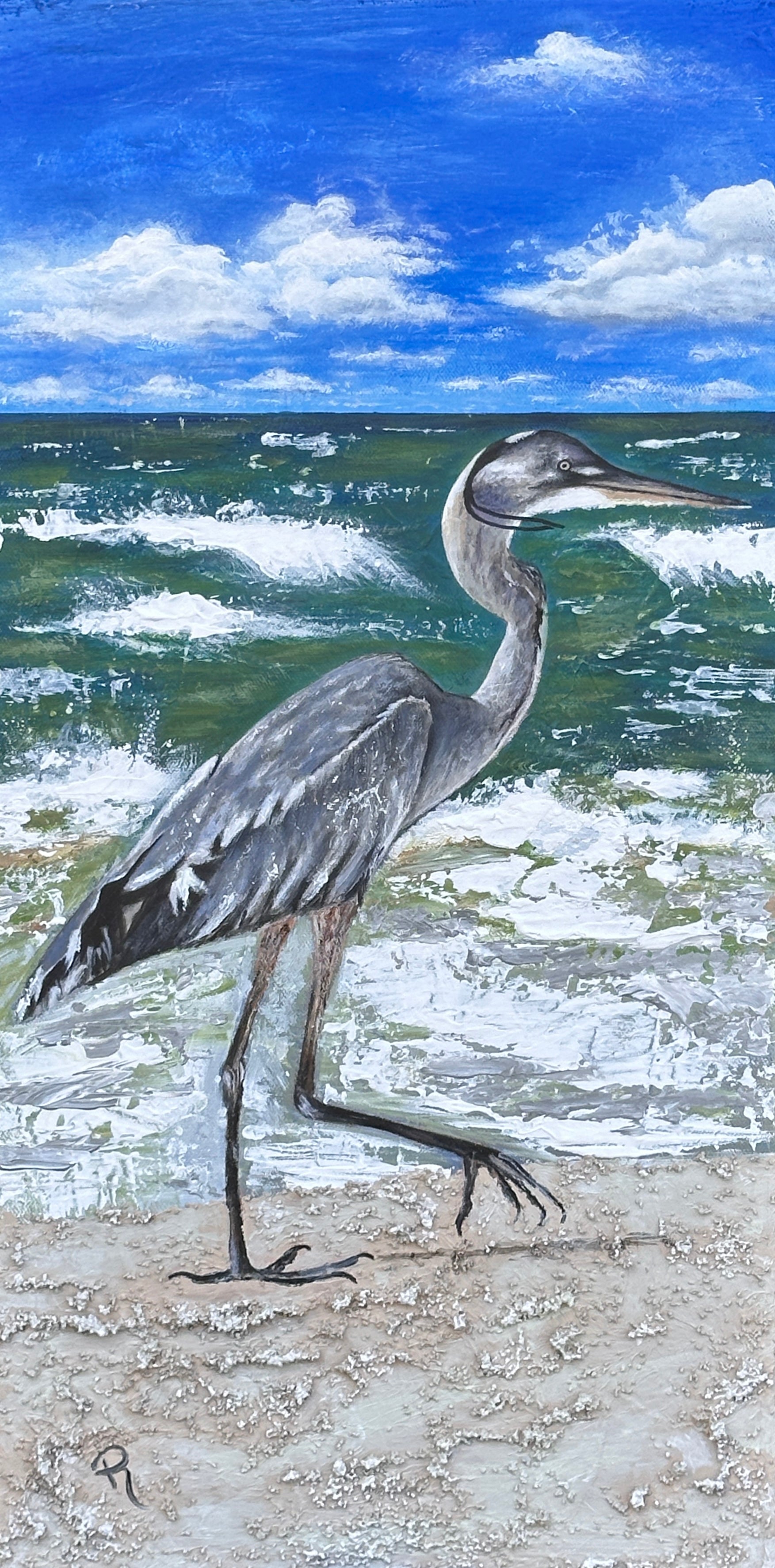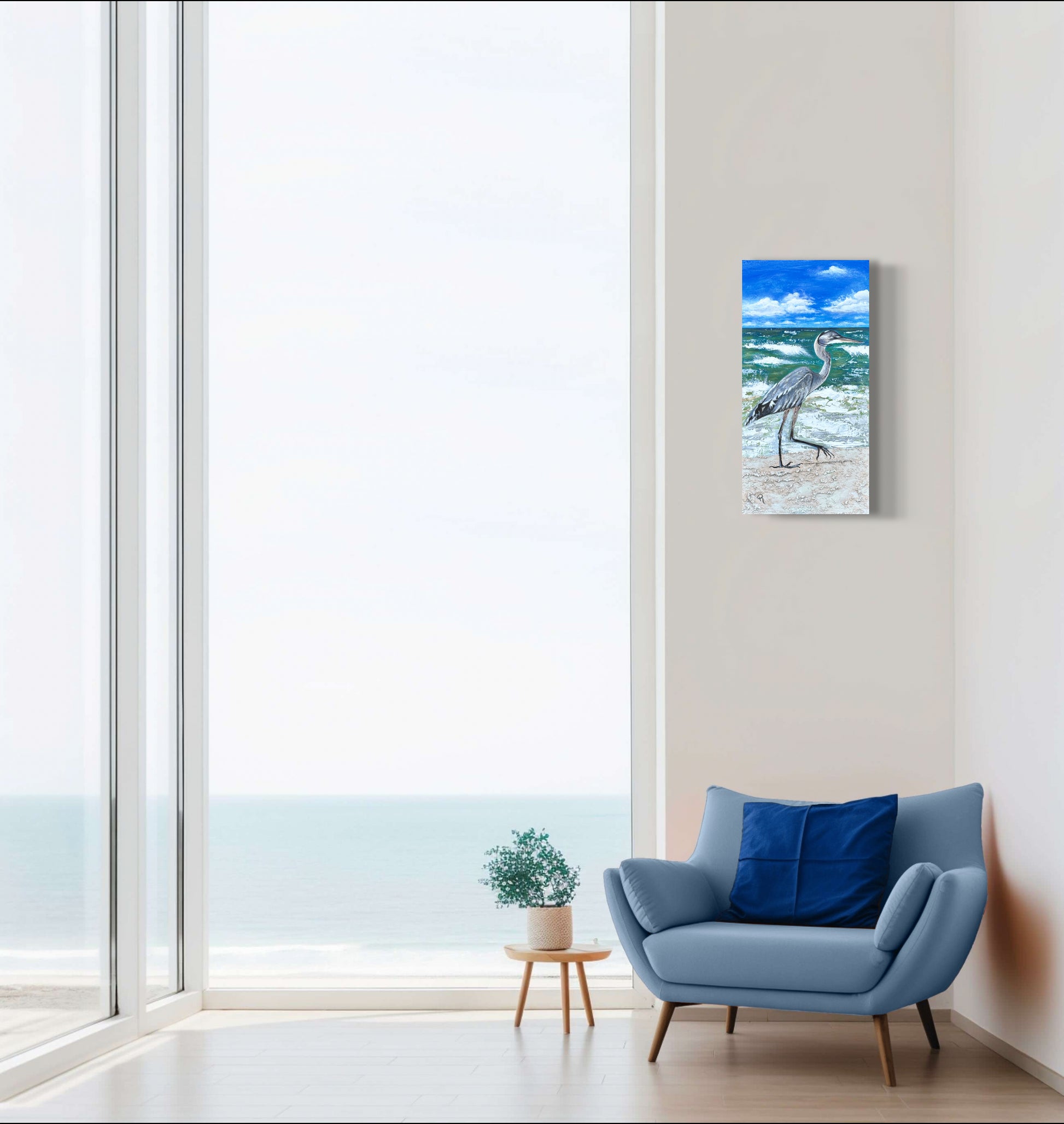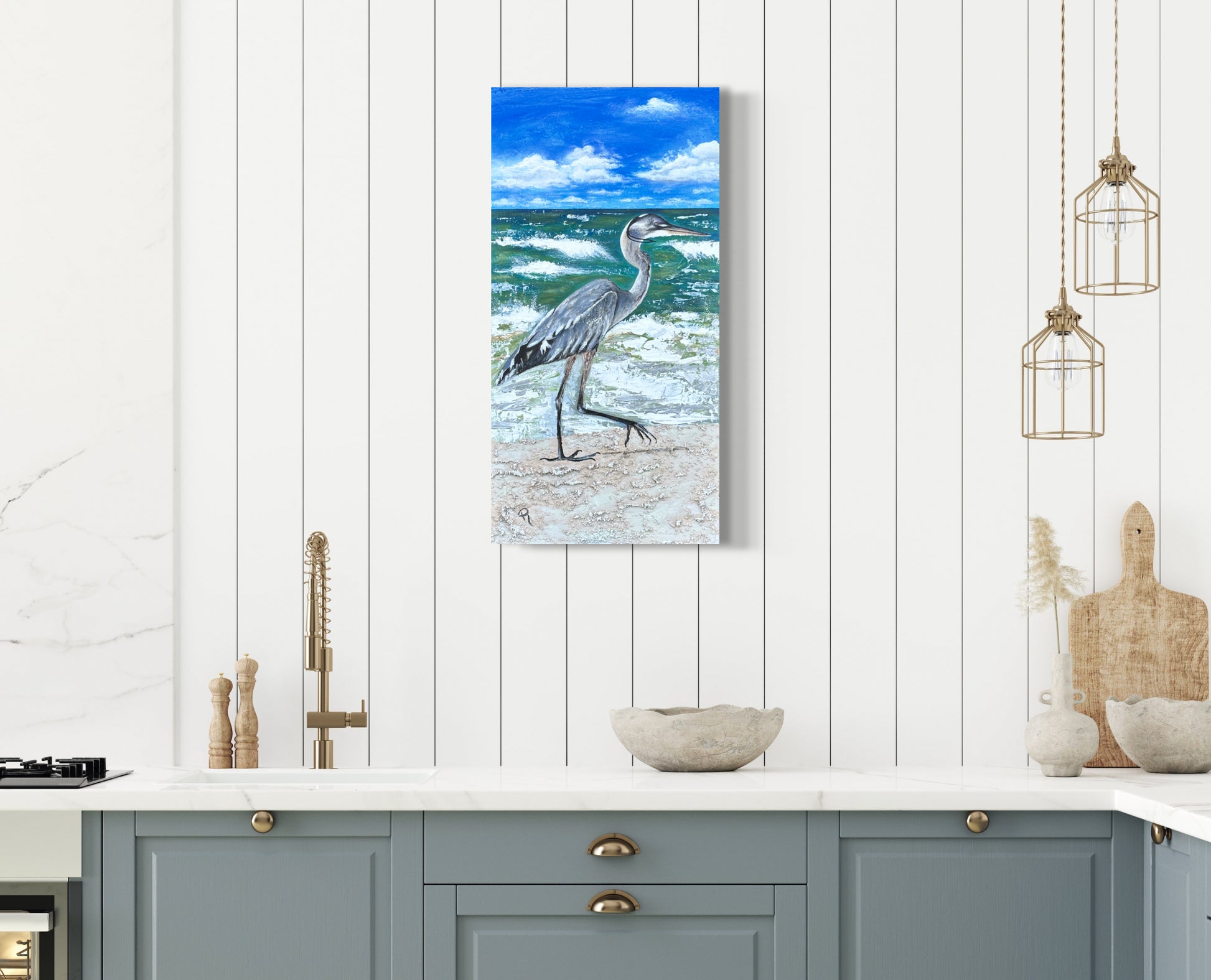 Experience the beauty of nature with our Blue Heron Strut Mixed Media Painting. Featuring a Great Blue Heron gracefully strolling along the beach shoreline, this textured piece will bring a touch of serenity and elegance to any space. Add it to your collection today!