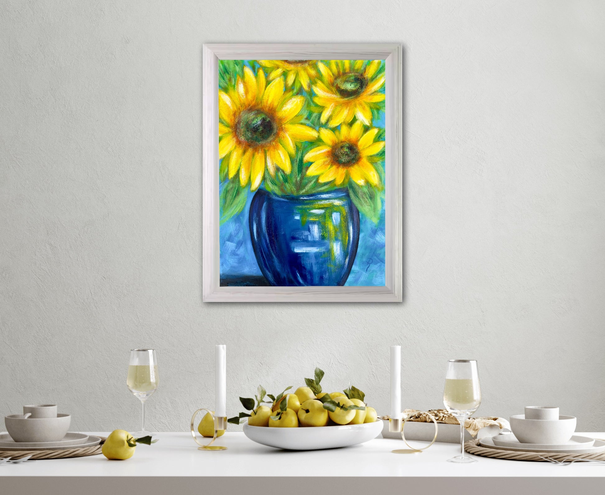 If you love flower paintings or even the colors of blue and yellow then you'll adore this vase full of sunflowers as the perfect addition to your home or office.