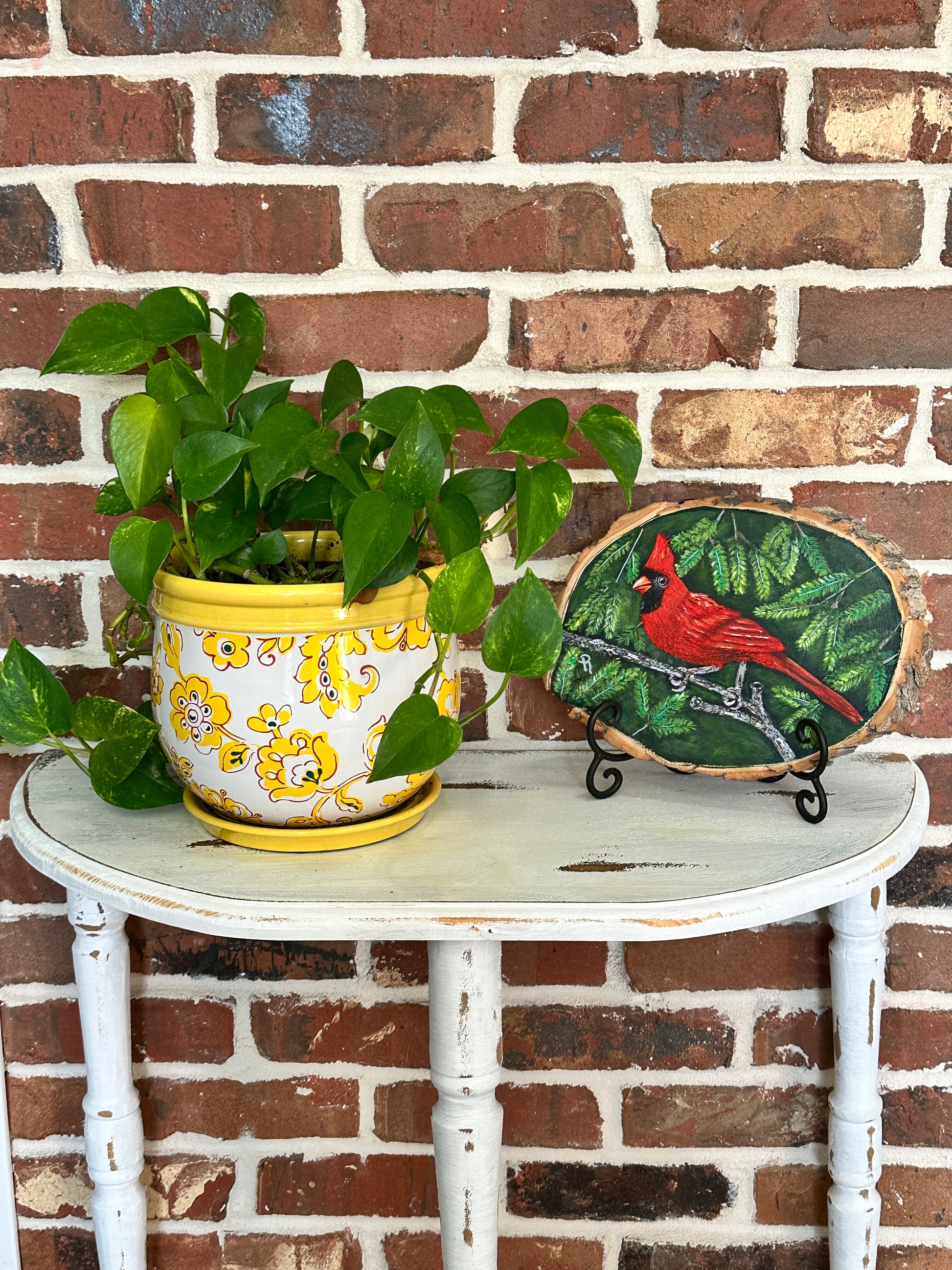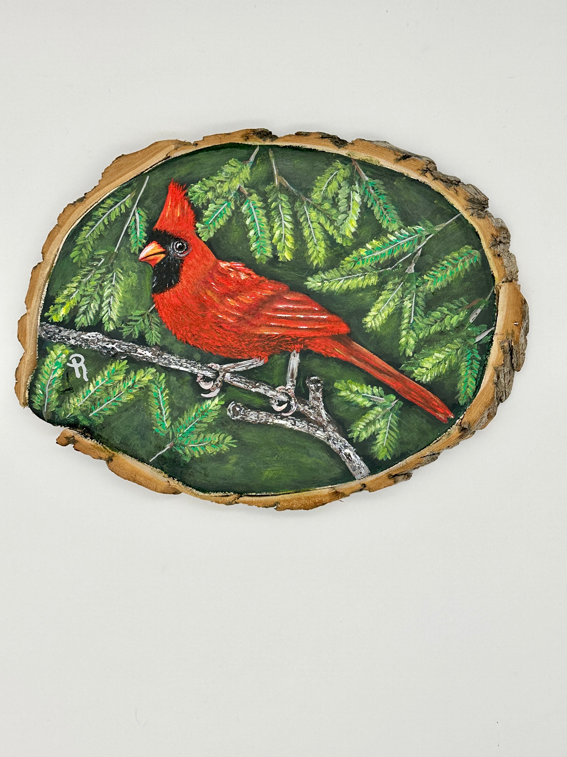 Bring the beauty of nature indoors with this hand-painted acrylic painting of a cardinal perched in a pine tree. Add unique artwork to your home, and enjoy the enchanting hues of the cardinal's feathers against the evergreen trees!