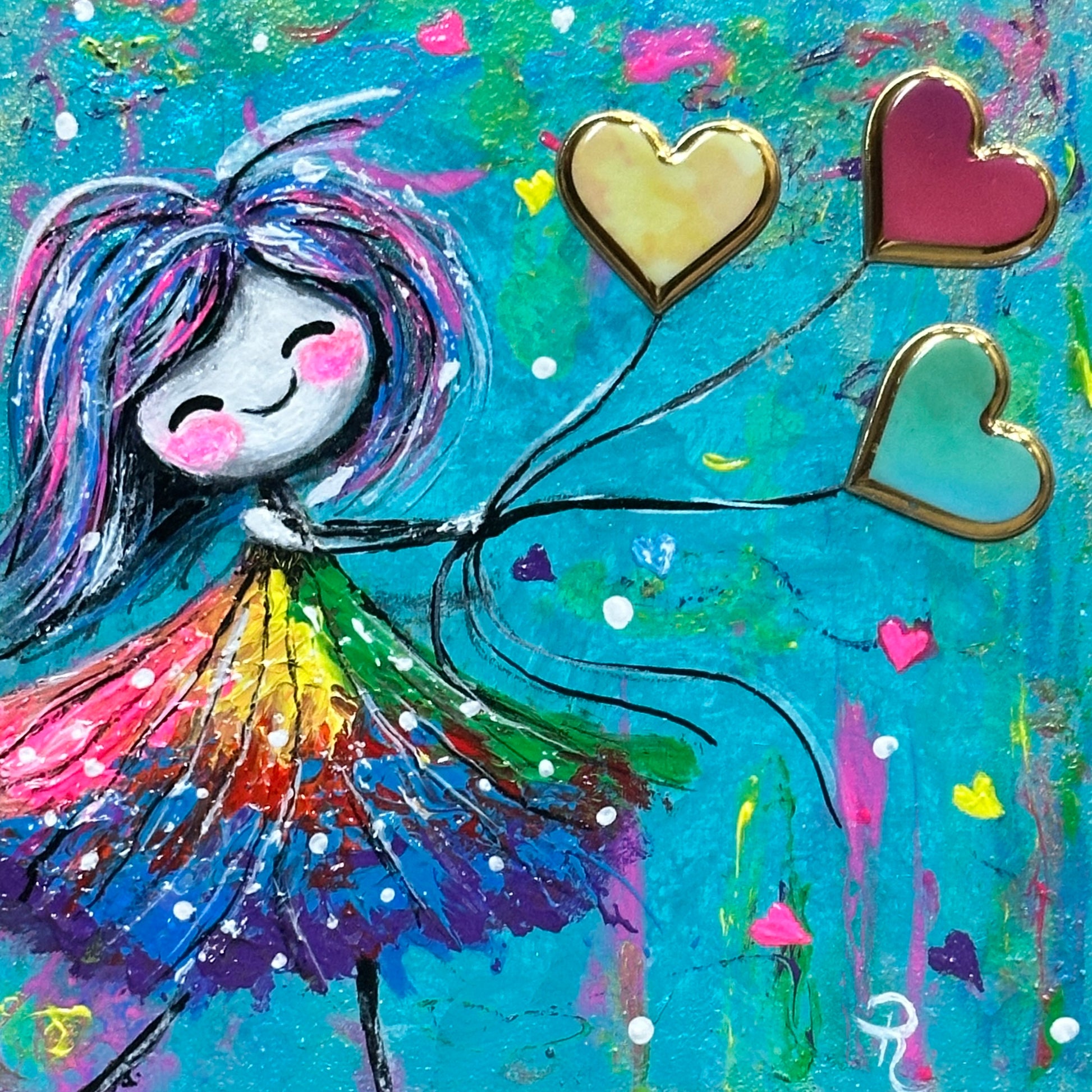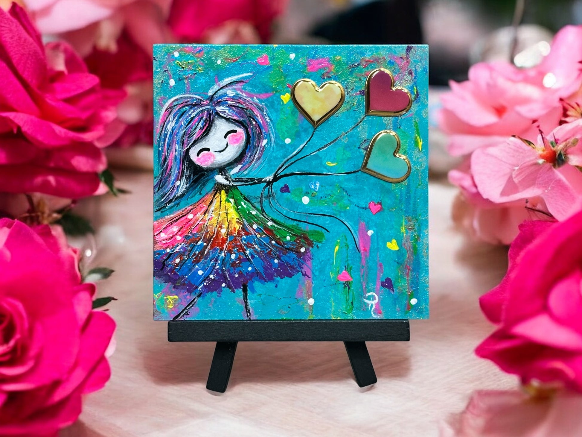 Get Carried Away with this charming mini acrylic painting. Featuring a whimsical girl carrying a trio of heart balloons, her rainbow dress pops against the teal background. Adorned with tiny floating hearts all around, this mini masterpiece will add a playful touch to any space.