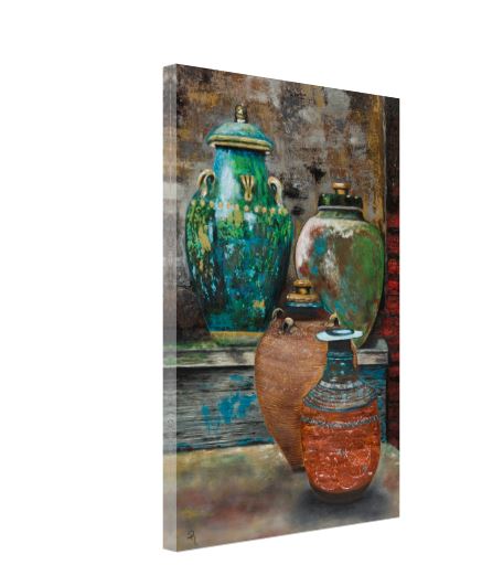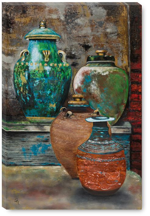 This Chipped And Charming Canvas Print is the perfect way to bring a Mediterranean flair to your home. High-quality materials and precise artistry provide a vibrant, gallery-wrapped finish of my original painting of four Moroccan jugs on a patio step.