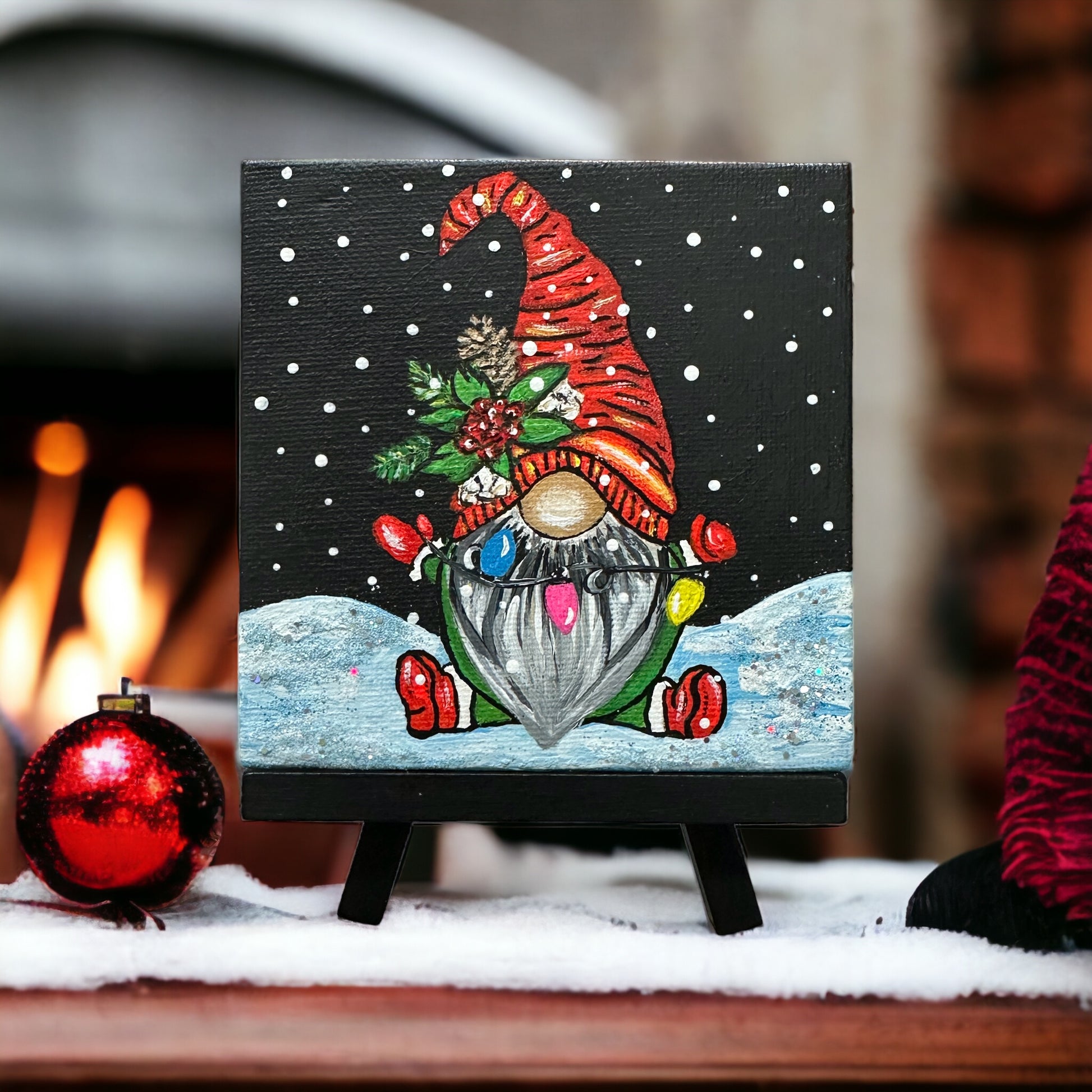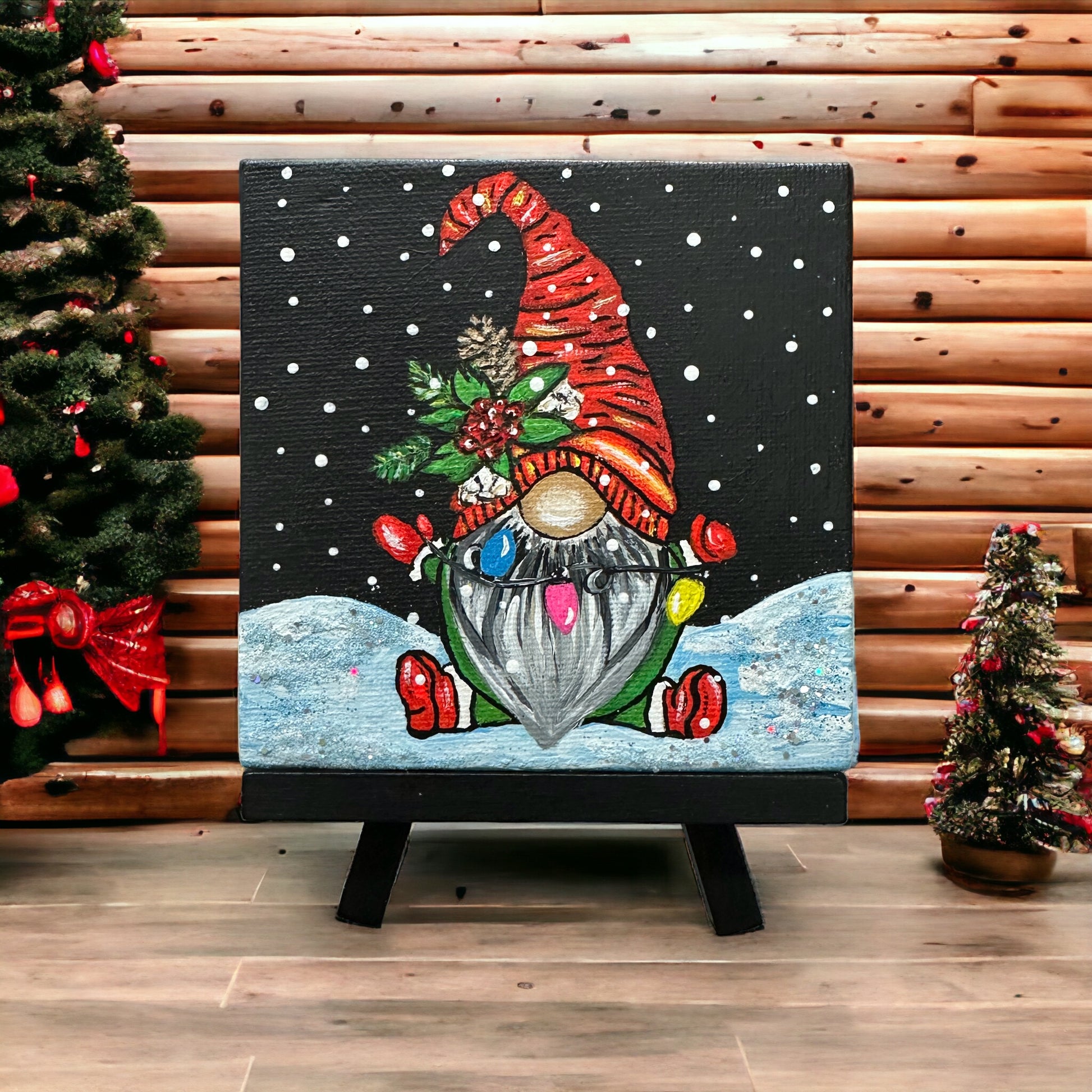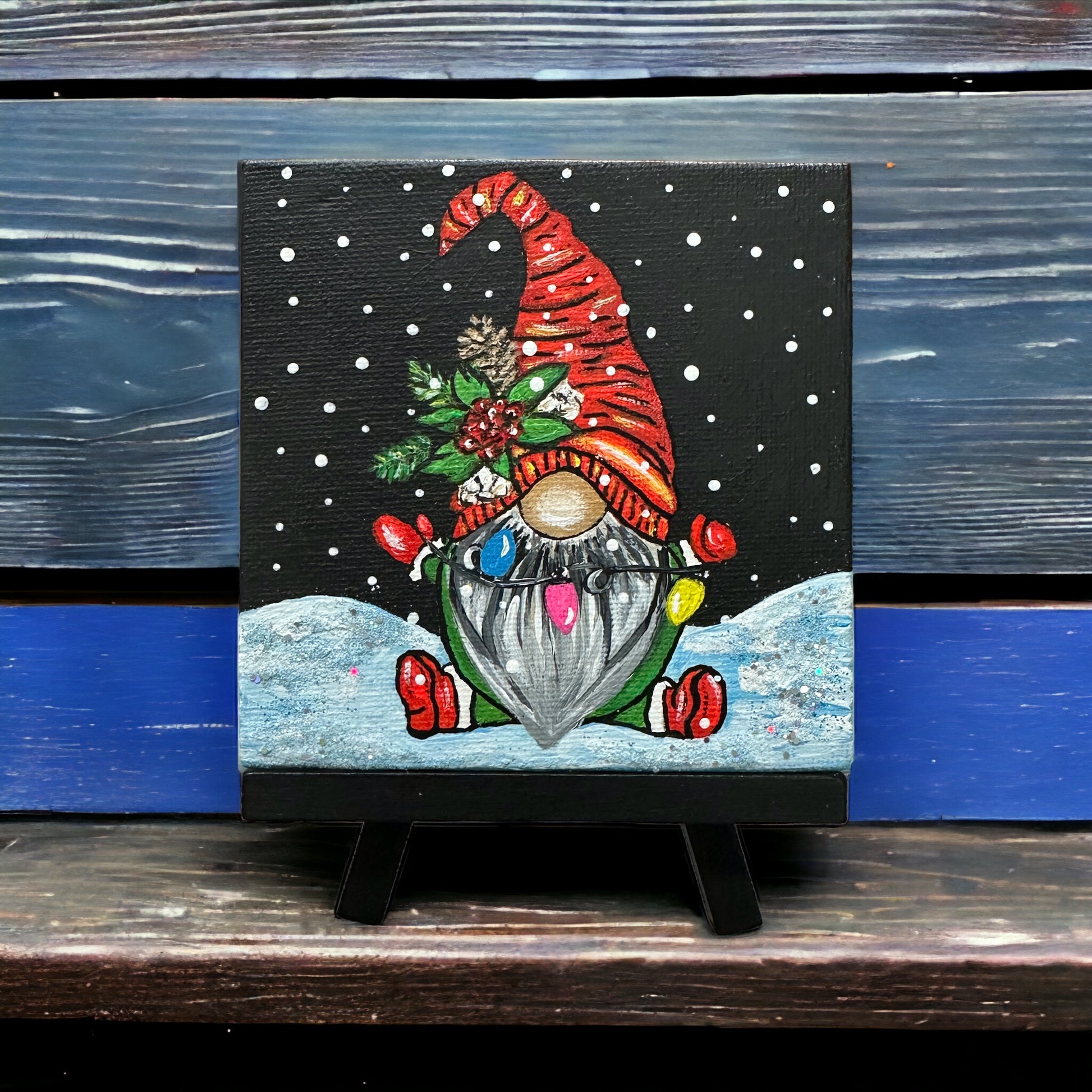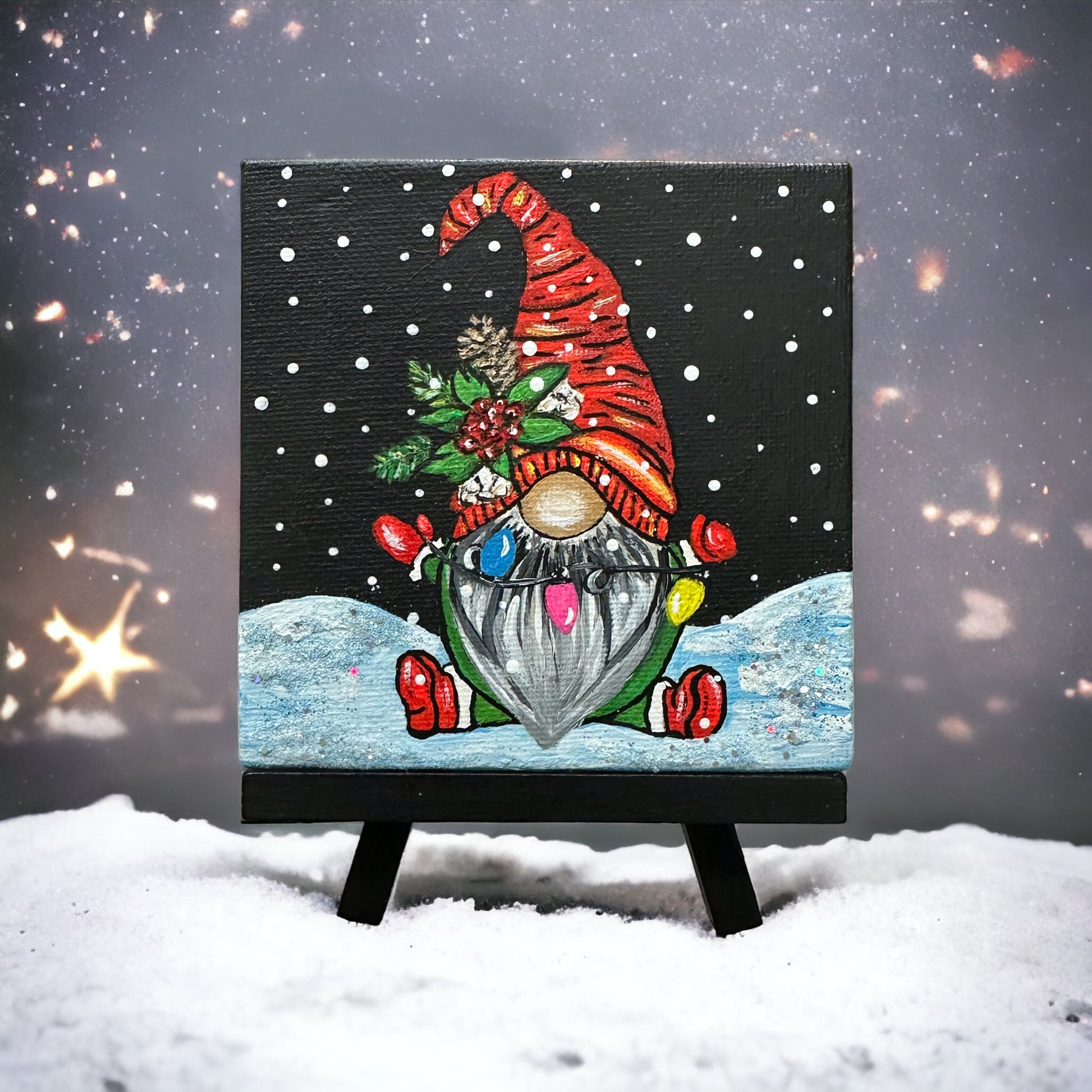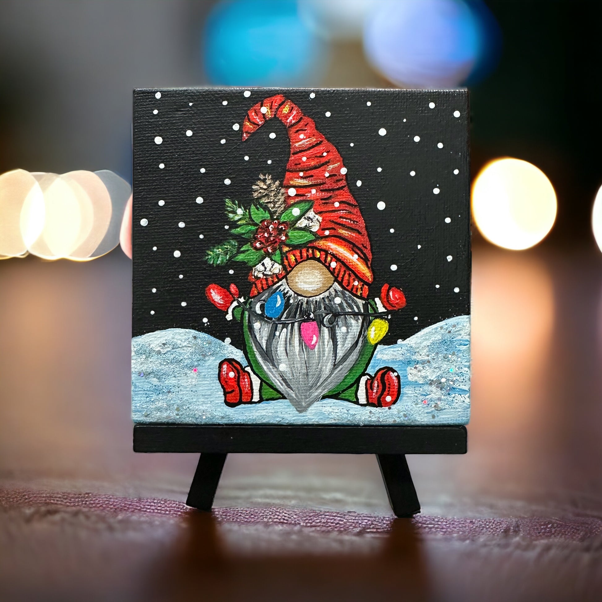Light up your life with this festive painting! This 4"x 4" acrylic painting of an adorable gnome holding a string of Christmas lights is sure to add joy and cheer to any room. Displayed on its own tiny easel, it will brighten up any holiday décor!