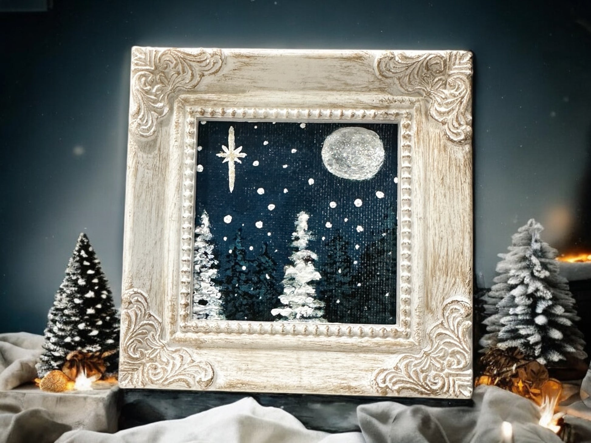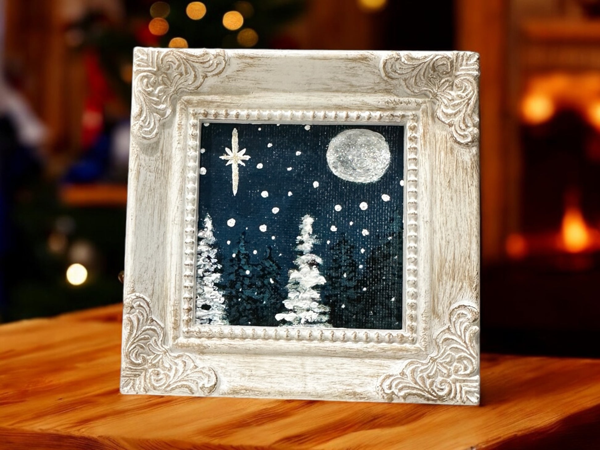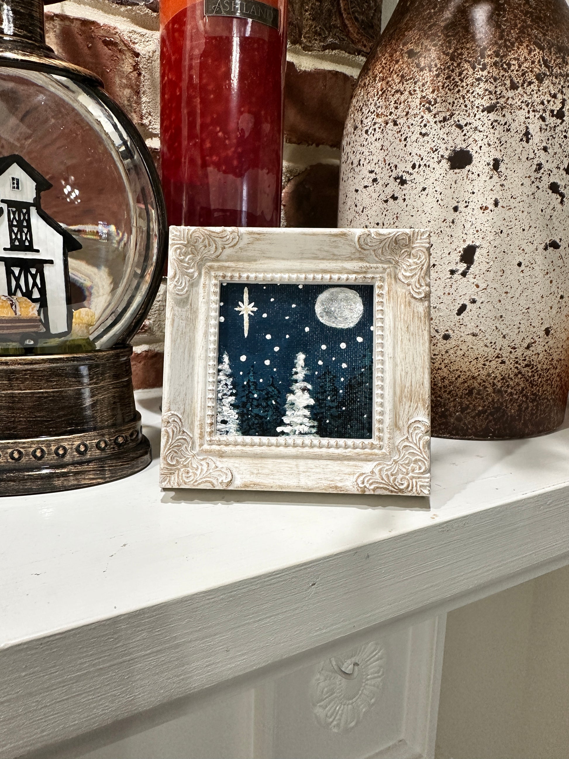 This mini tabletop painting is the perfect gift for a friend, sister, teacher and it makes an adorable stocking stuffer too. The Christmas Tree Forest is painted on a mini 3" x 3" canvas panel and placed in a perfect small frame making it an adorable display piece on your table or fireplace mantle.