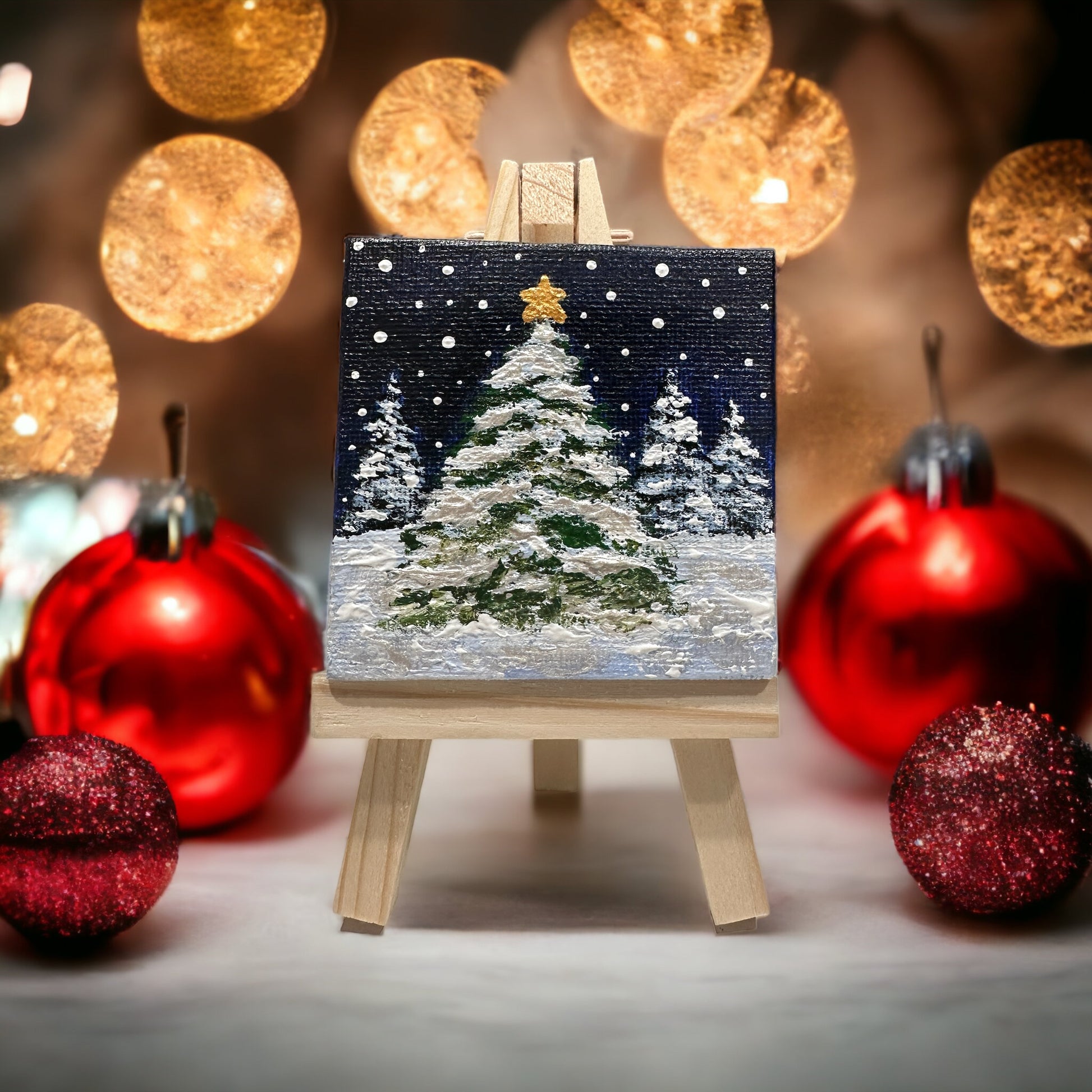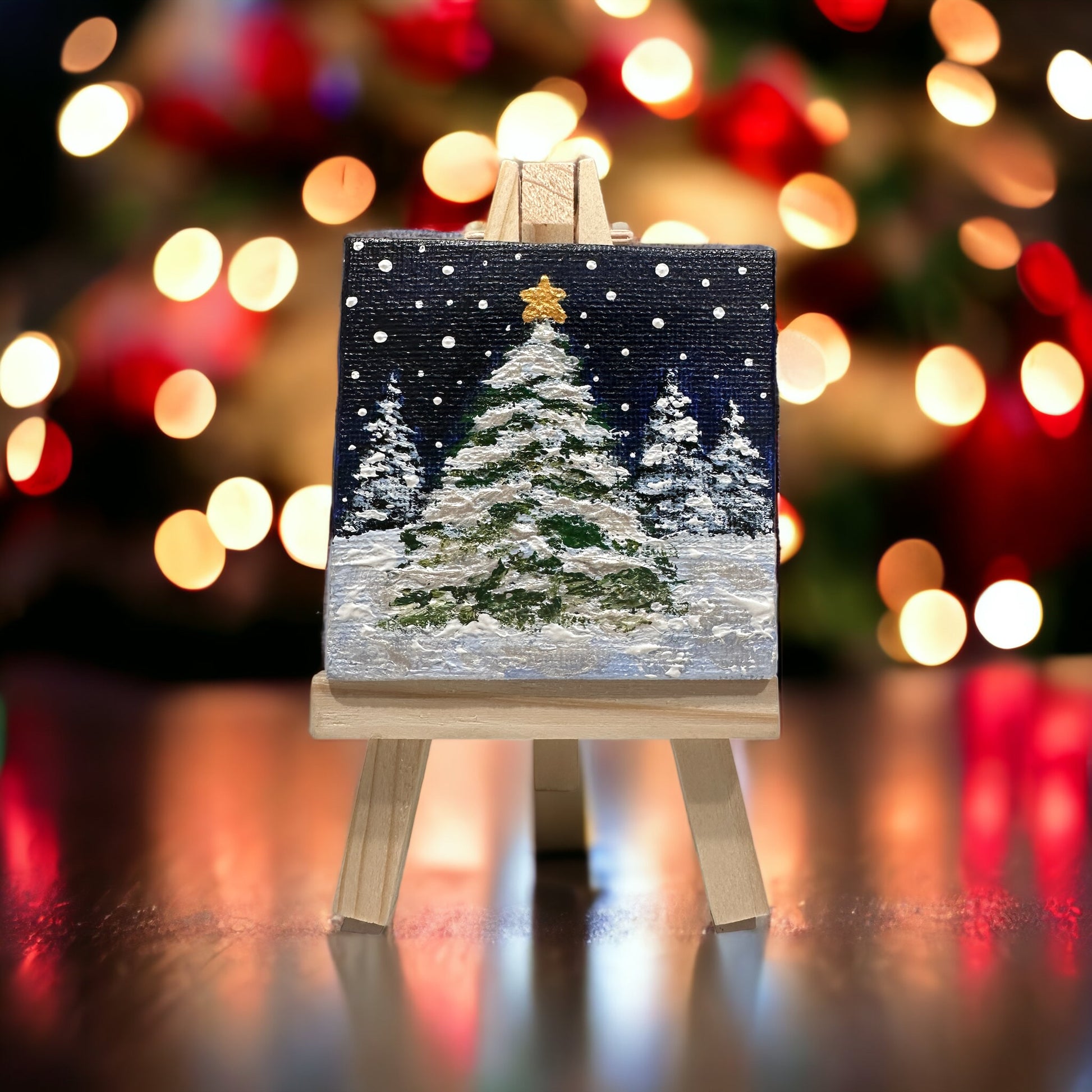 This Christmas season, bring a delightful mini acrylic painting of a snow-capped tree adorned with a golden star to your home! At just 2.5" x 2.5", it's the perfect size for adding some festive cheer to your living room, desk or fireplace mantel!