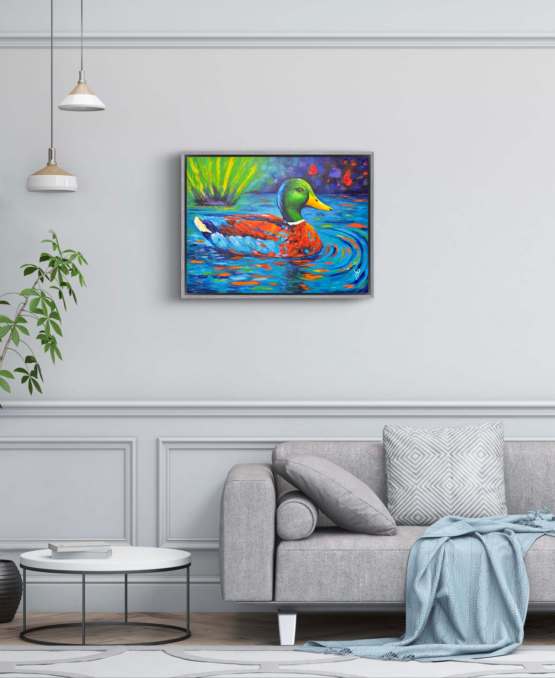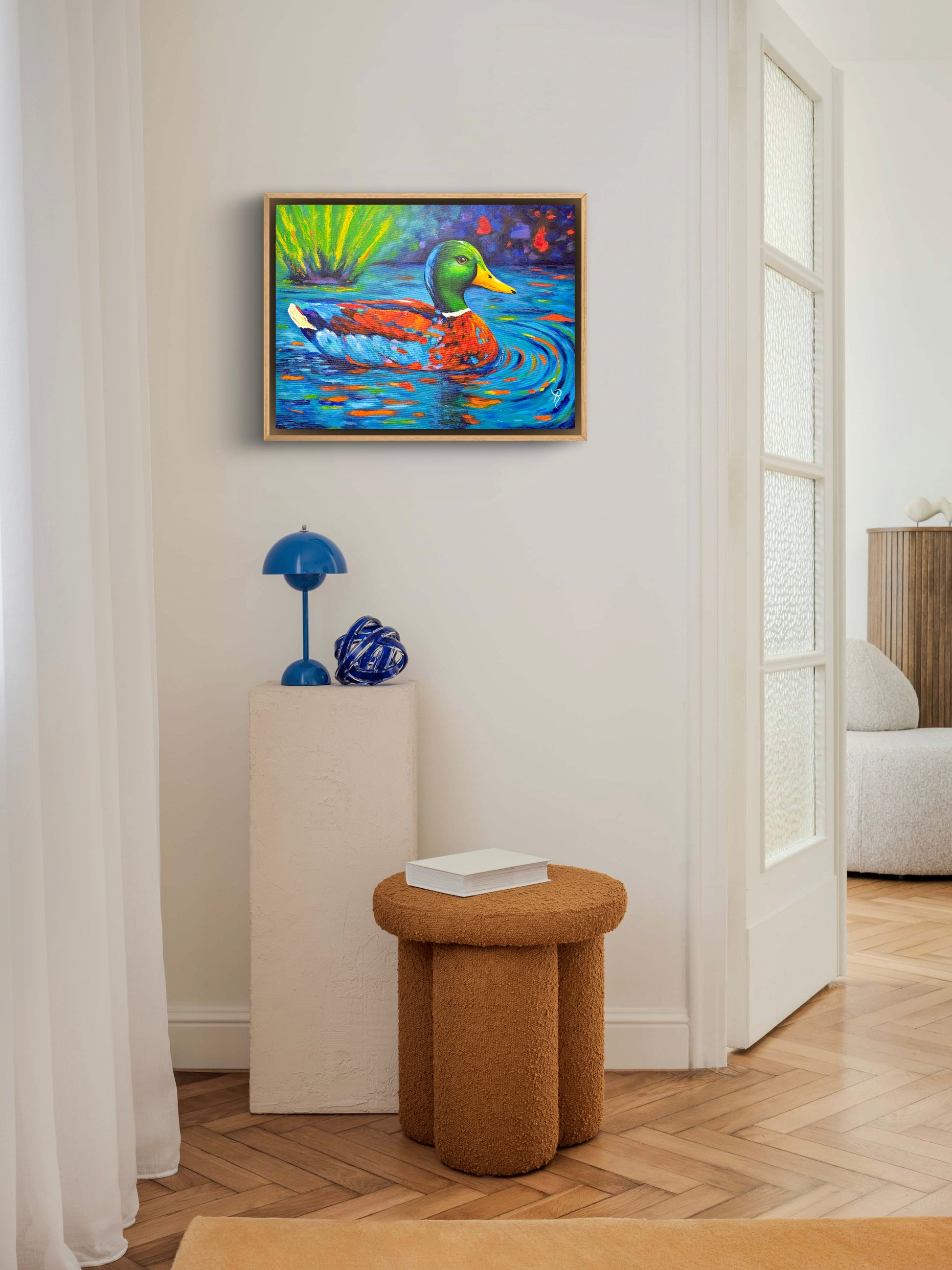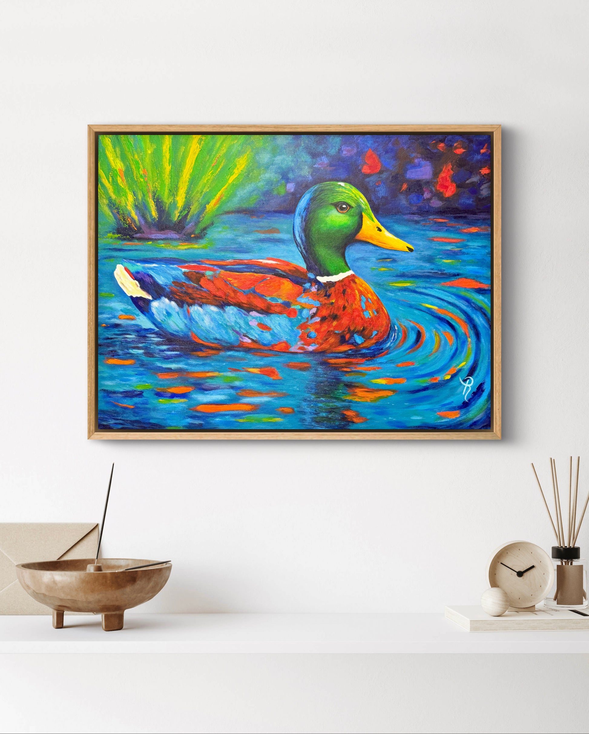 Dive into a splash of fun with "Color Me Quackers," an acrylic painting bursting with abstract, vivid colors that bring a mallard duck and its pond to life. This playful piece adds a cheerful pop of energy and whimsy to any room, perfect for brightening your space with a touch of joyful creativity.