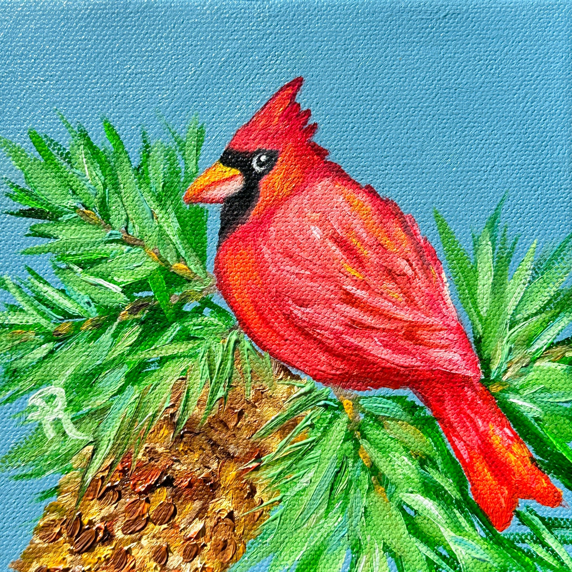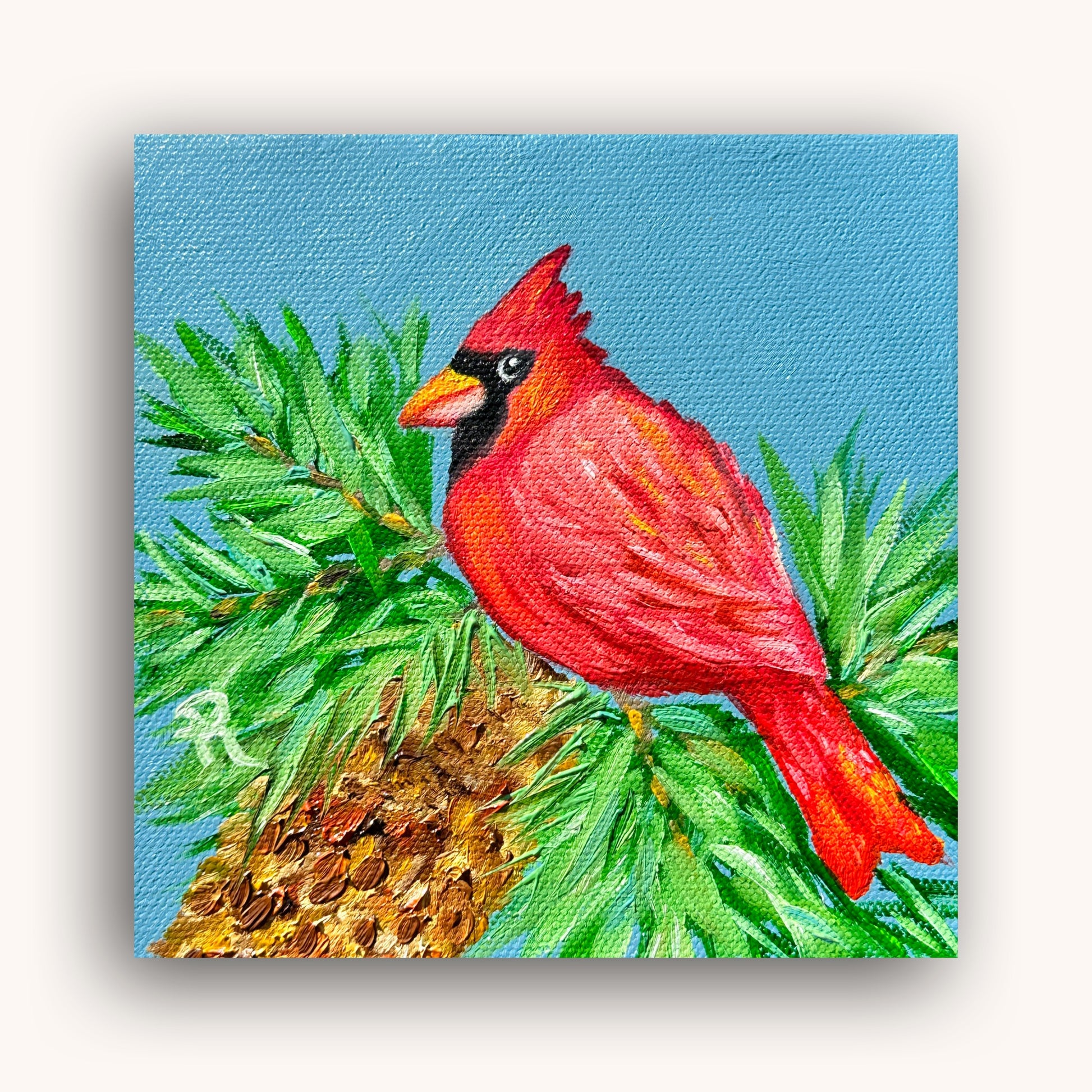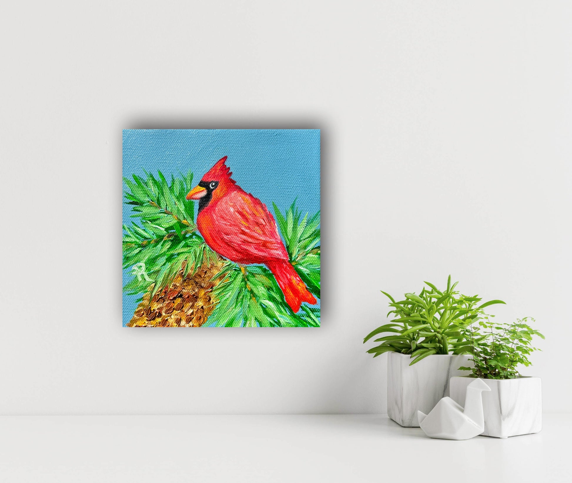 Featuring a lively and captivating cardinal, this small oil painting captivates with its subtle and intricate blend of details. Situated on a pine tree branch with a pine cone perched at its side, the painting evokes a distinct sense of the wild outdoors, while the cardinal's curious glance brings life and animation to the canvas. A timeless classic, this piece of artwork is both eye-catching and engaging.