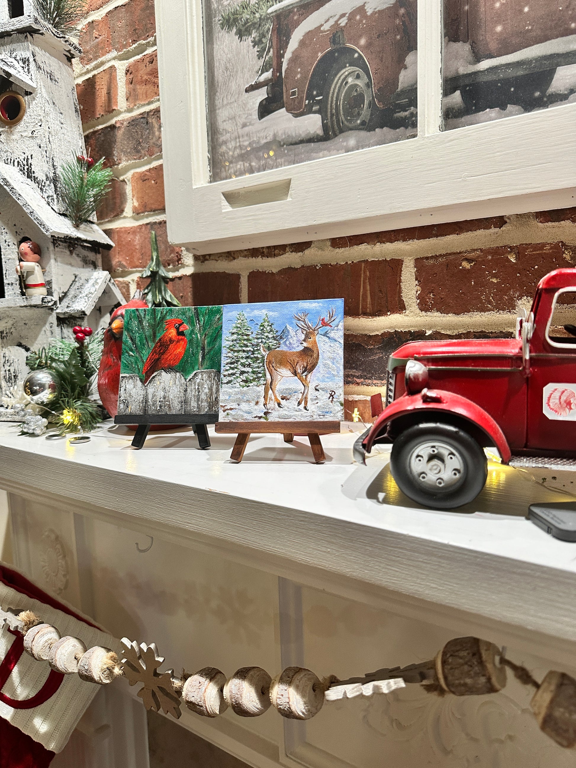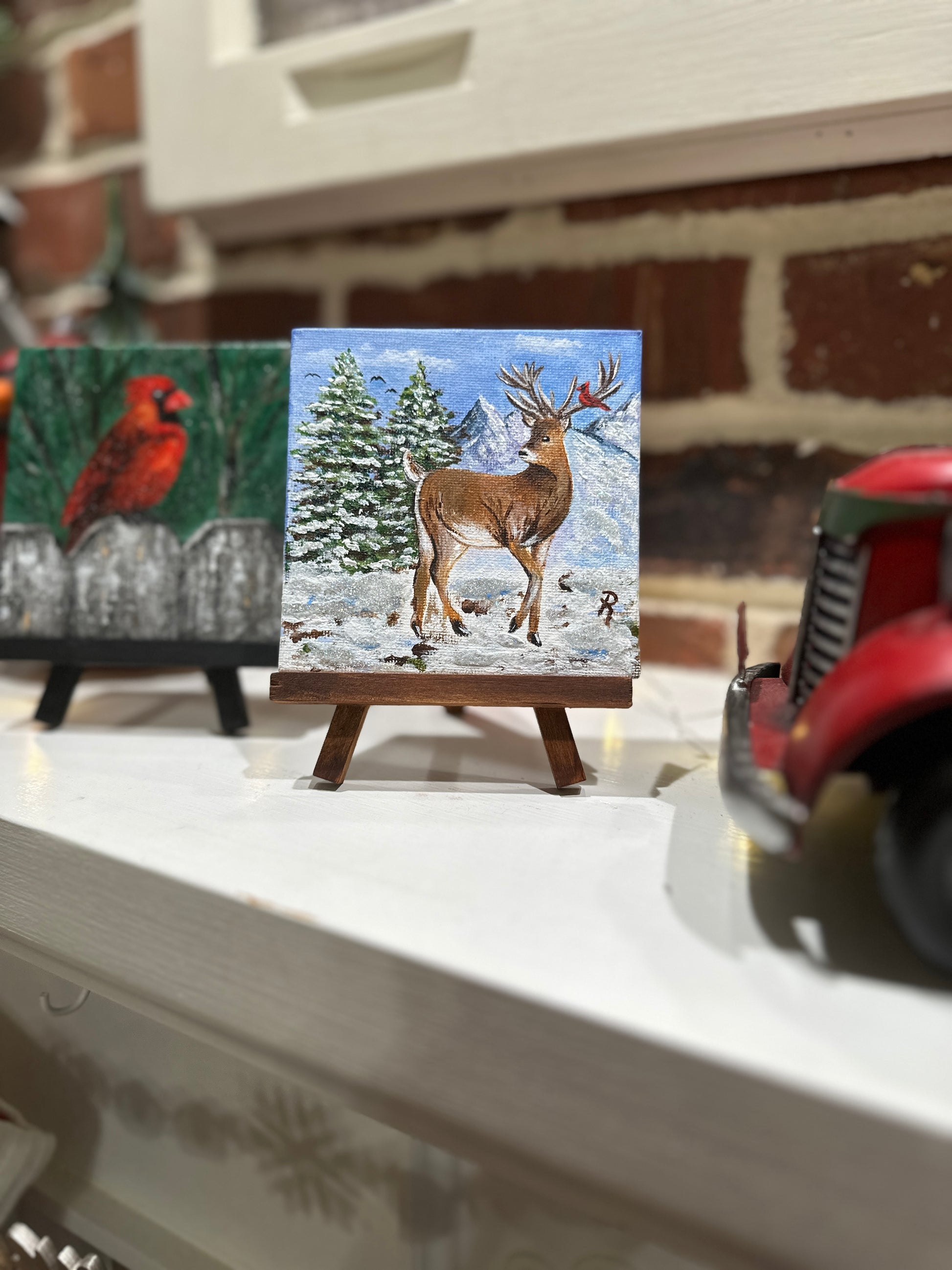 Enjoy this stunning 4x4" acrylic painting of wildlife in winter. A majestic deer with a cardinal perched on its antler stands amidst an enchanting forest dusted in snow. Christmas trees and mountain peaks round out this captivating scene! An art-lovers delight!