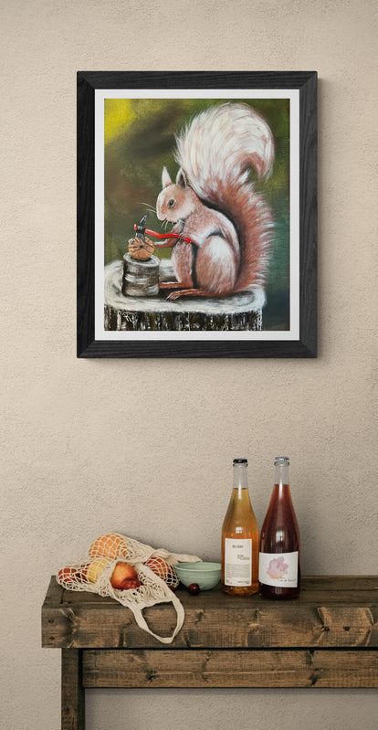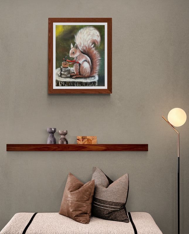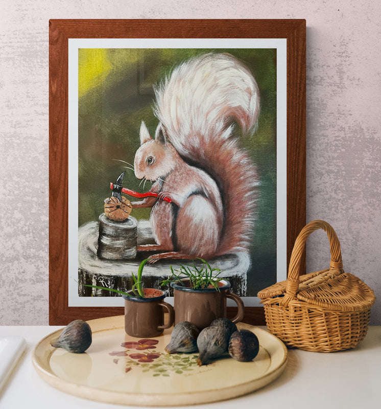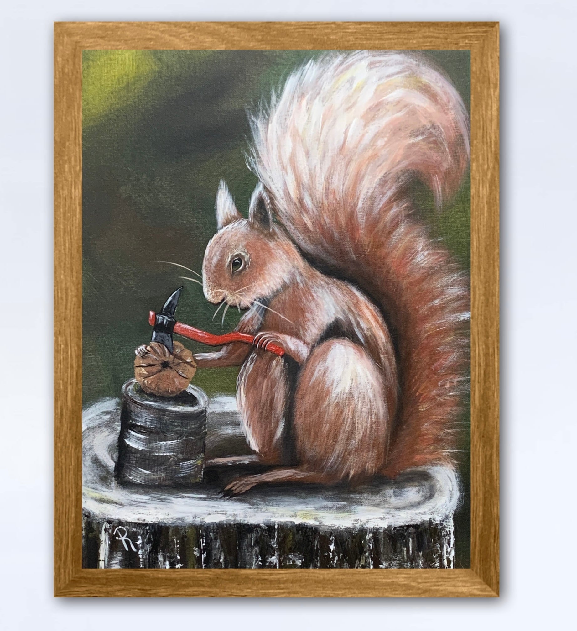 Squirrels come in all shapes, sizes and colors like, brown, black, gray & even white! Some have short tails while others have long fluffy tails. But there’s one thing squirrels have in common and that’s their love of nuts! They’ll eat just about any kind of nut too. This acrylic painting has captured one desperate squirrel using an ax to get to the good part of the walnut.