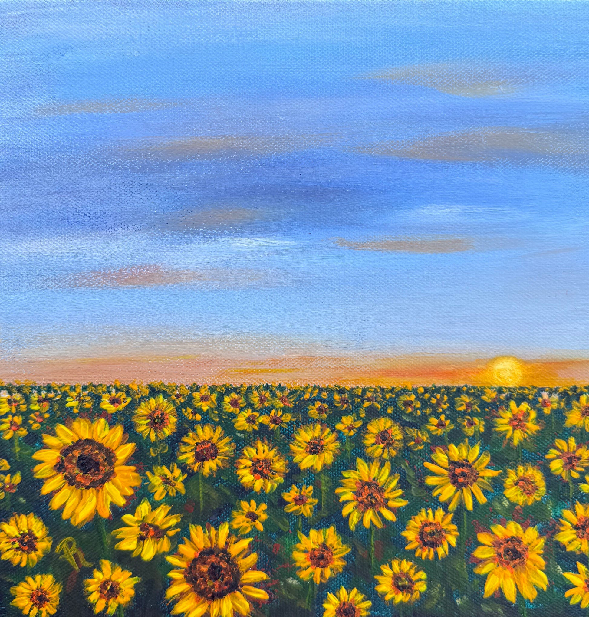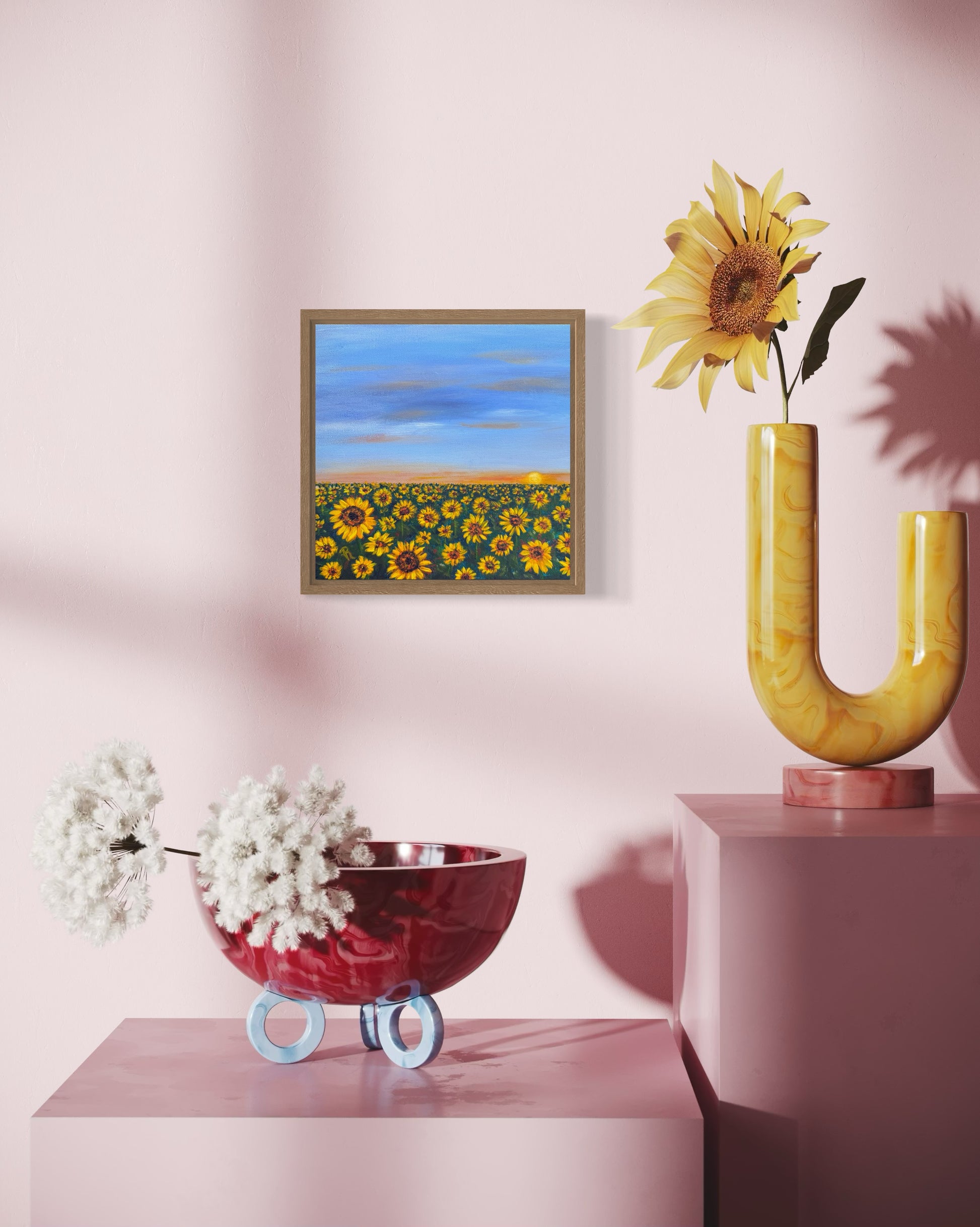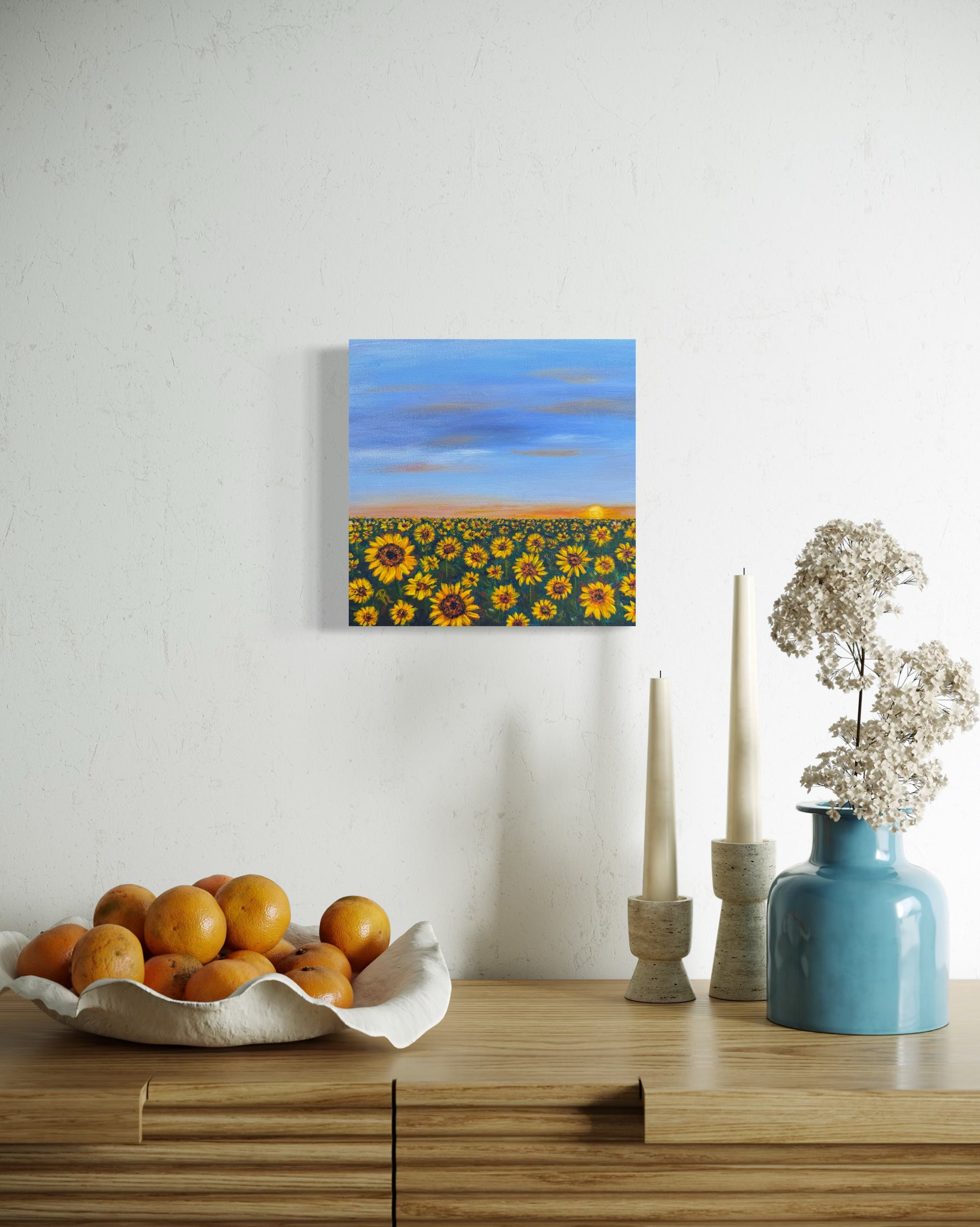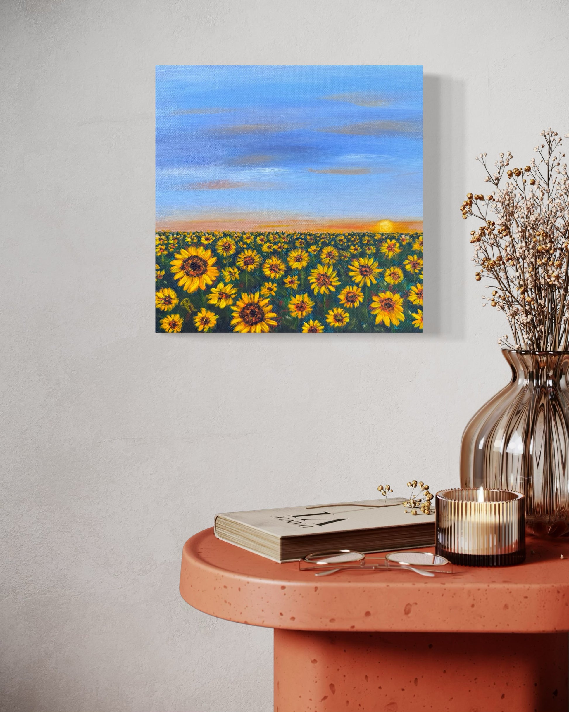Capture the warmth and joy of a sunflower field bathed in the golden glow of a setting or rising sun with this vibrant acrylic painting. The radiant sunflowers stretch toward the light, creating a lively scene that brightens any space. Perfect for adding a cheerful touch to your home or office, this artwork celebrates nature’s beauty and the promise of a new day.