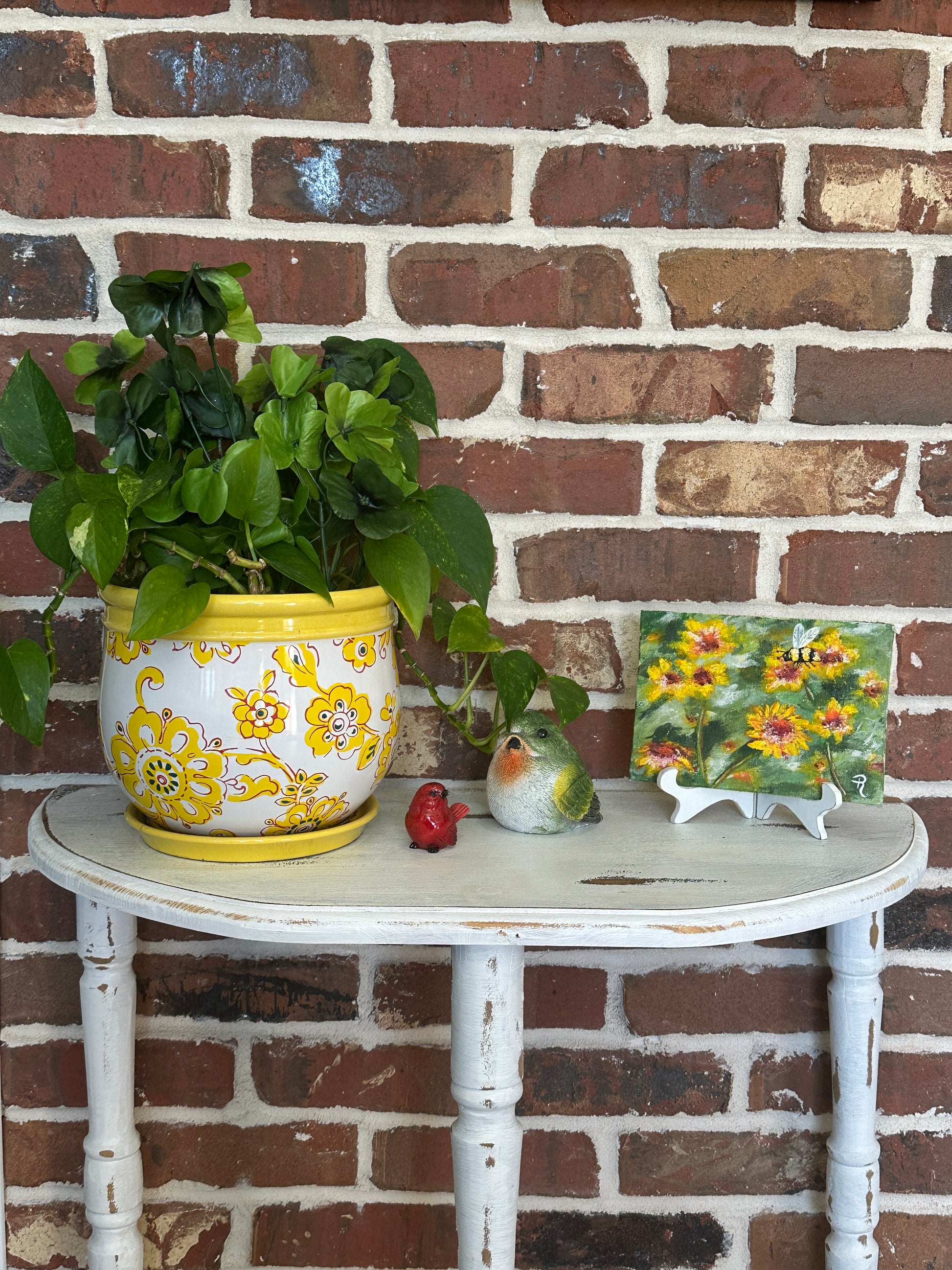 Get lost in a field of gold with this playful acrylic painting! Featuring a small and vivid yellow flower field, complete with a bumblebee buzzing on a flower. Bring a touch of whimsy to any room with this quirky piece.