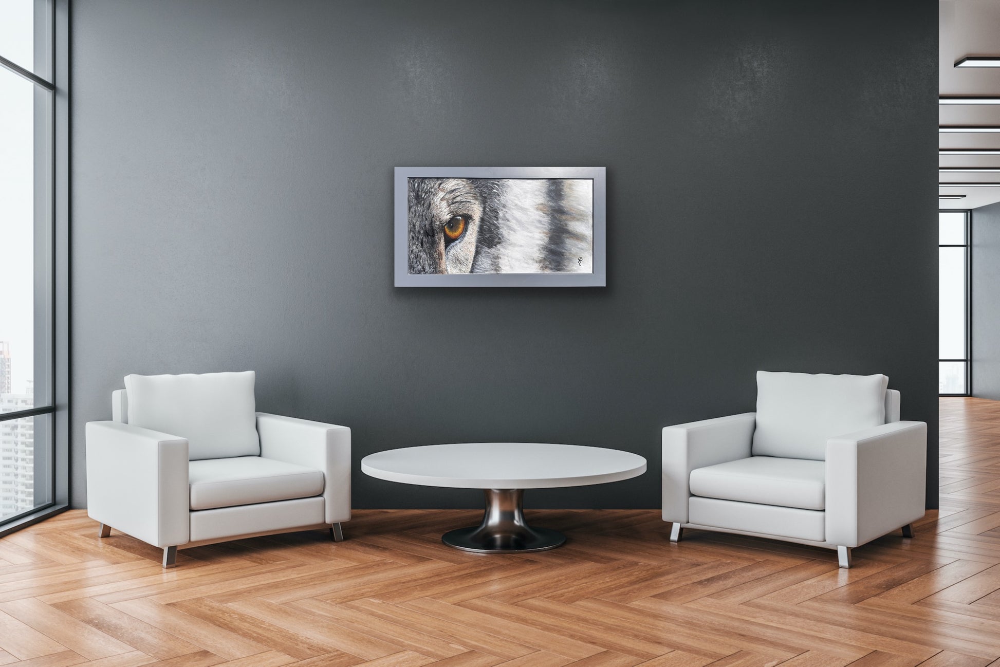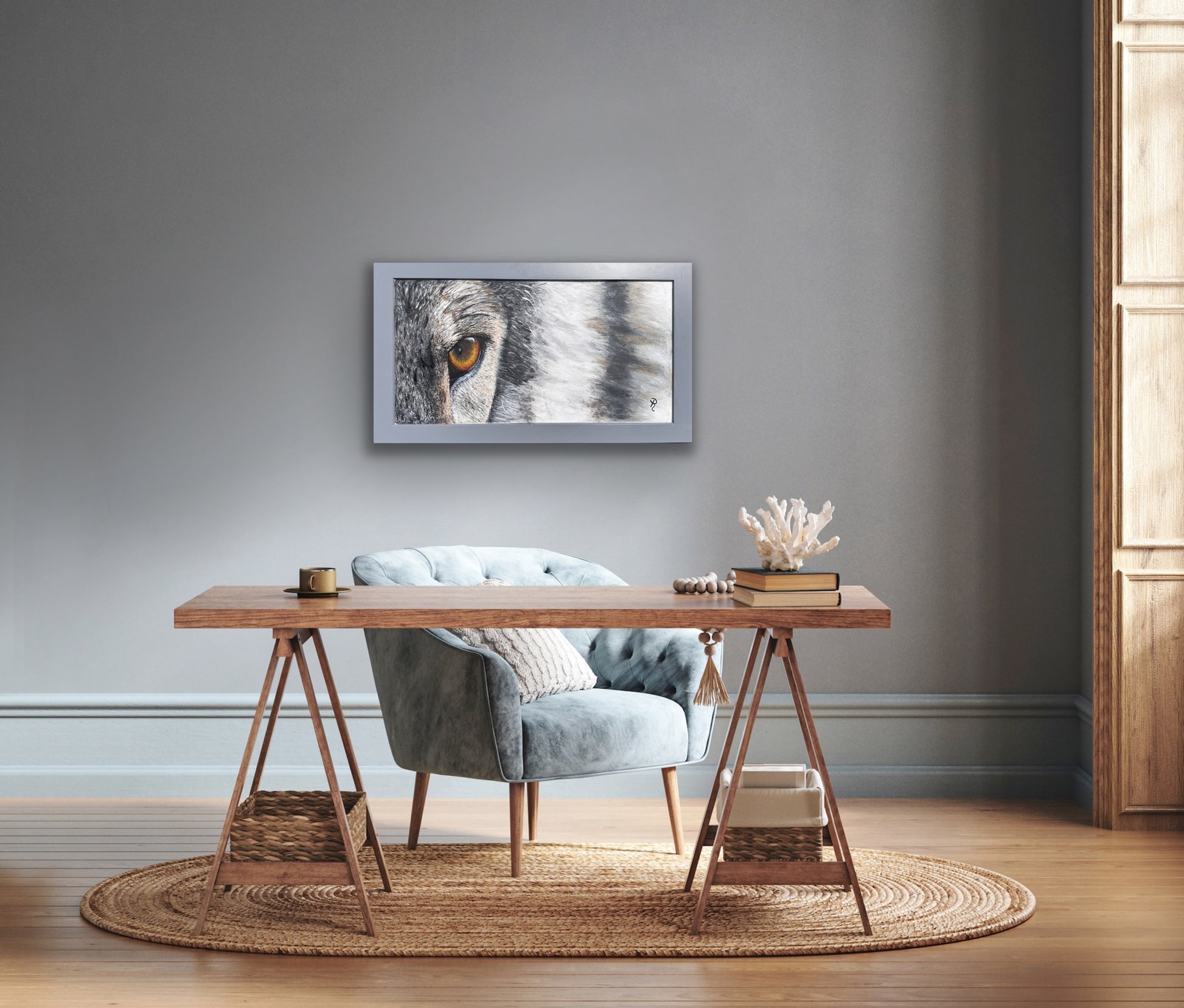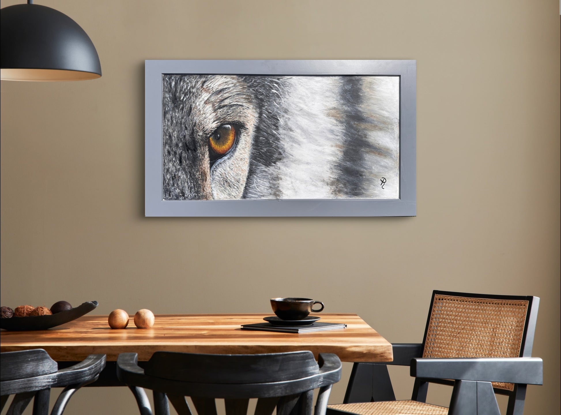 Get up close and personal with our Focused: Gray Wolf painting. Featuring the intense gaze of a gray wolf, this piece adds a touch of wild beauty to any space. Perfect for nature lovers and those looking to add a fierce yet playful touch to their décor. This piece is painted on the inset area of a wood cabinet door and the edges of the cabinet, which looks like a frame, are a medium gray.
