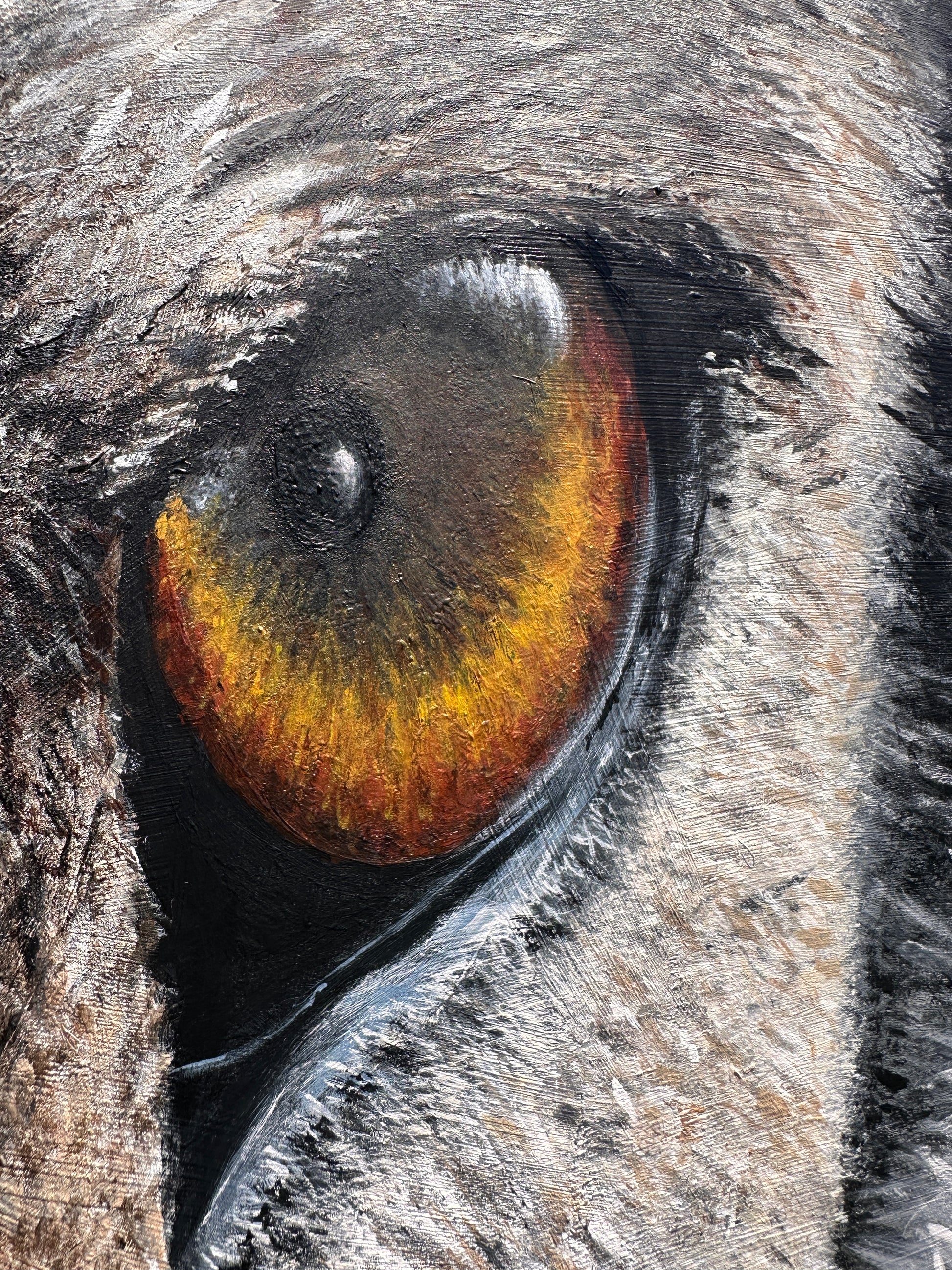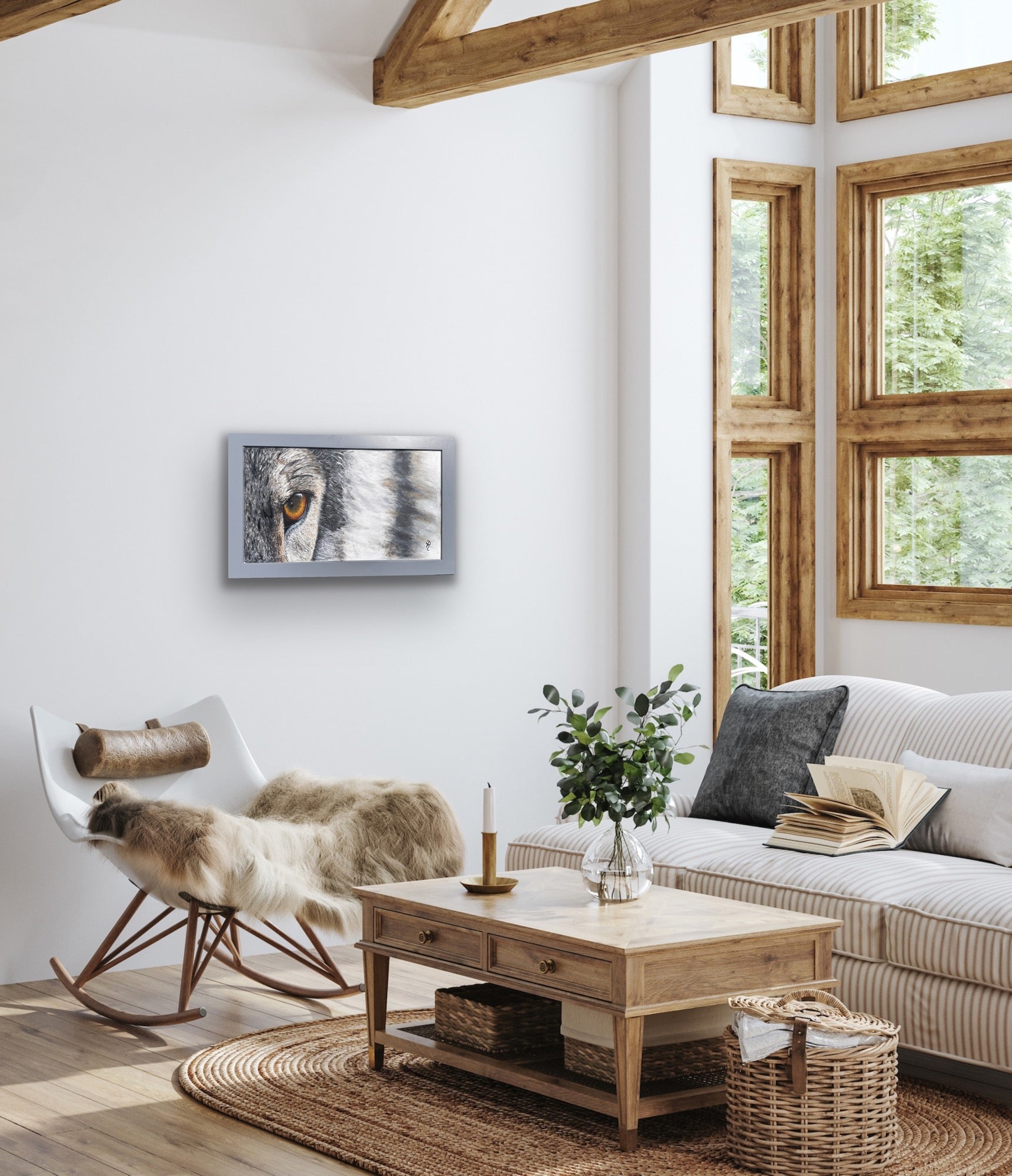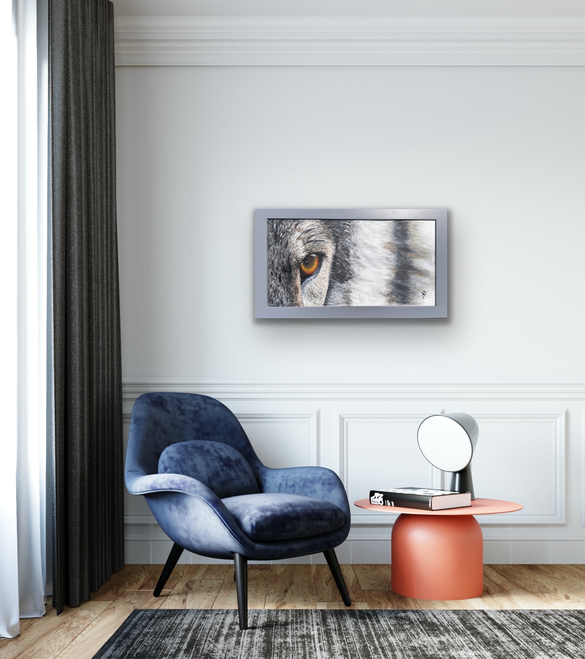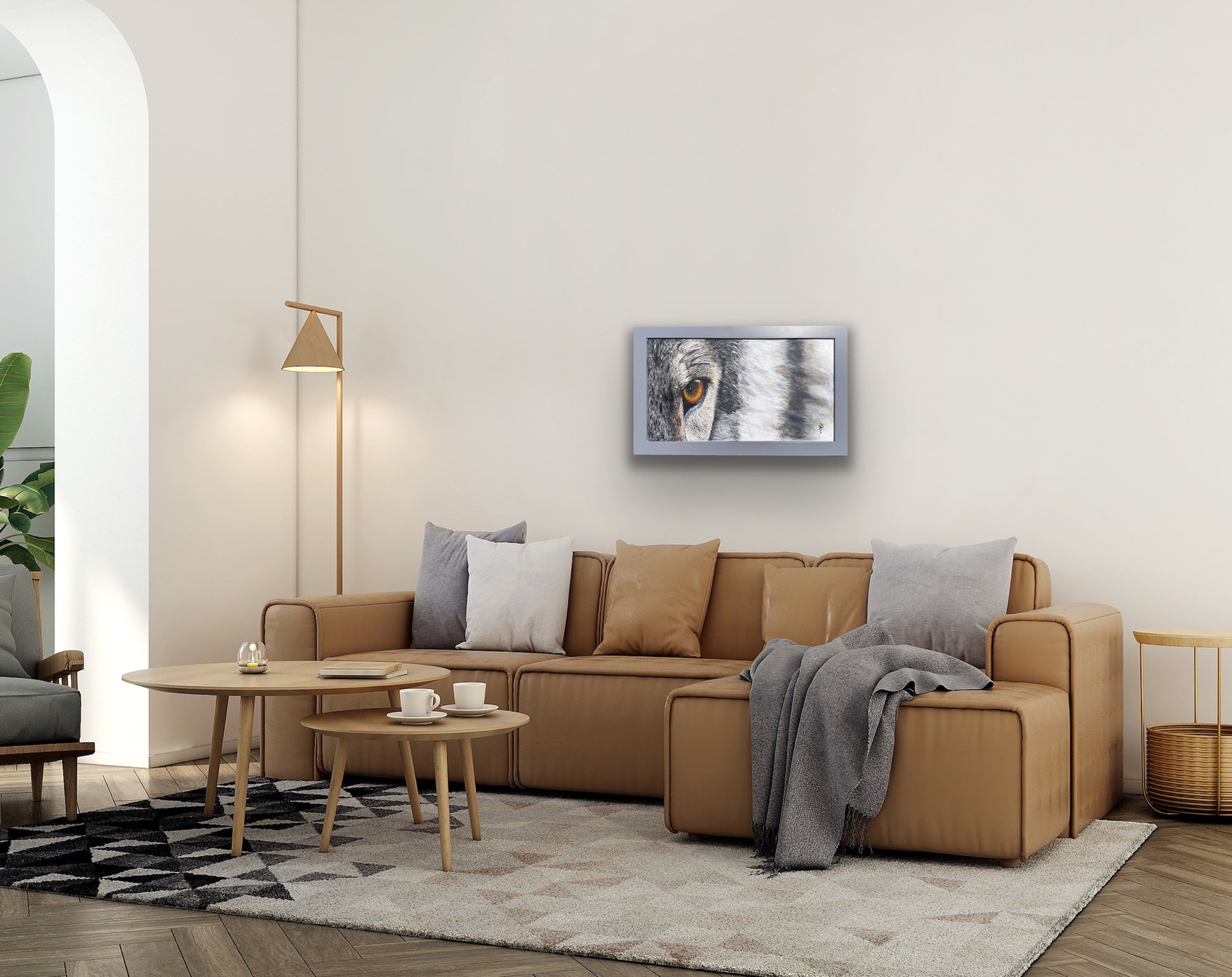 Get up close and personal with our Focused: Gray Wolf painting. Featuring the intense gaze of a gray wolf, this piece adds a touch of wild beauty to any space. Perfect for nature lovers and those looking to add a fierce yet playful touch to their décor. This piece is painted on the inset area of a wood cabinet door and the edges of the cabinet, which looks like a frame, are a medium gray.