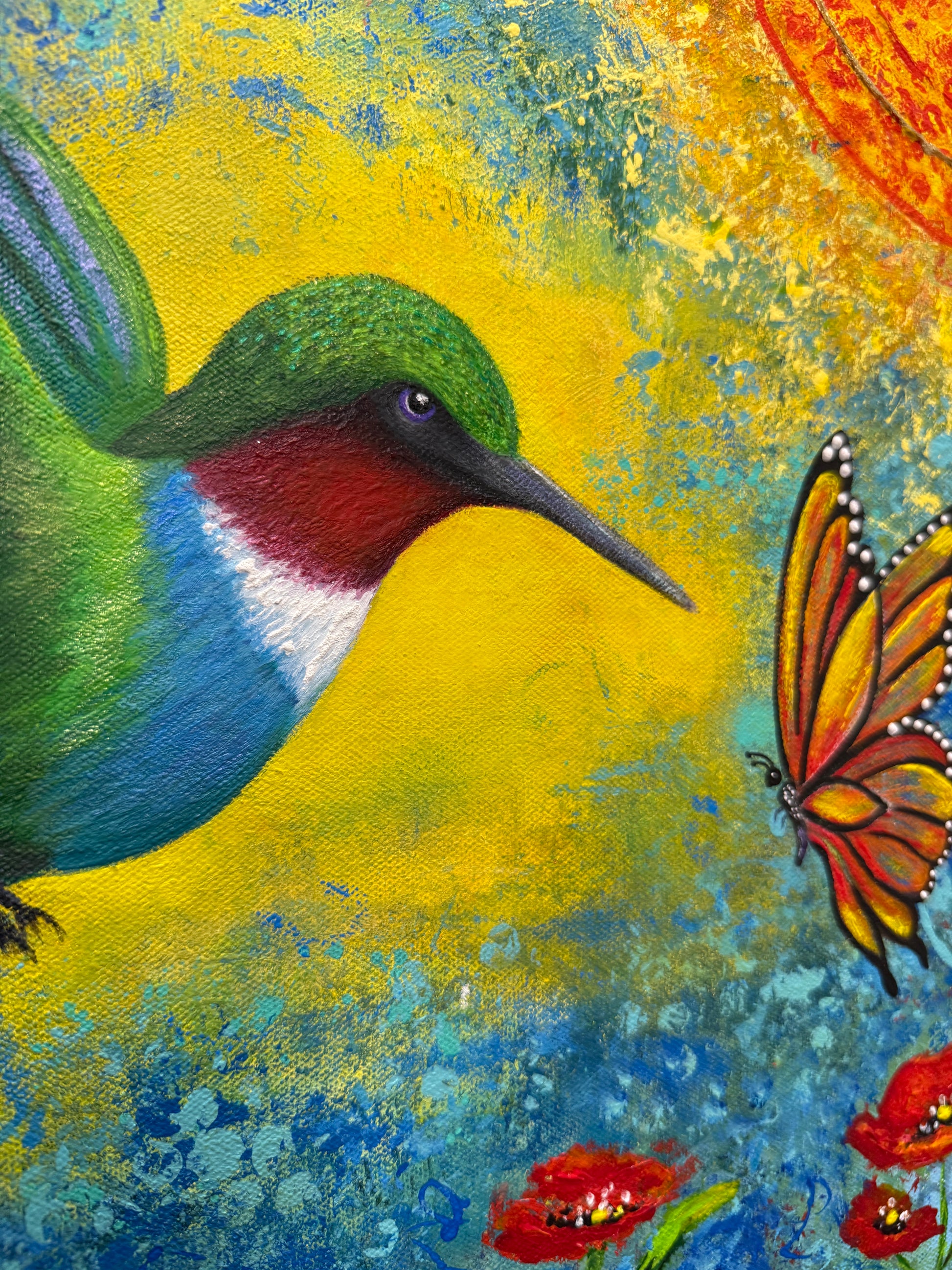 This vibrant acrylic painting invites you to a playful encounter where a butterfly and hummingbird meet eye to eye above a richly textured sea of poppy flowers. Layers of color and abstract detail create a lively, whimsical scene that brightens any space with its joyful energy.