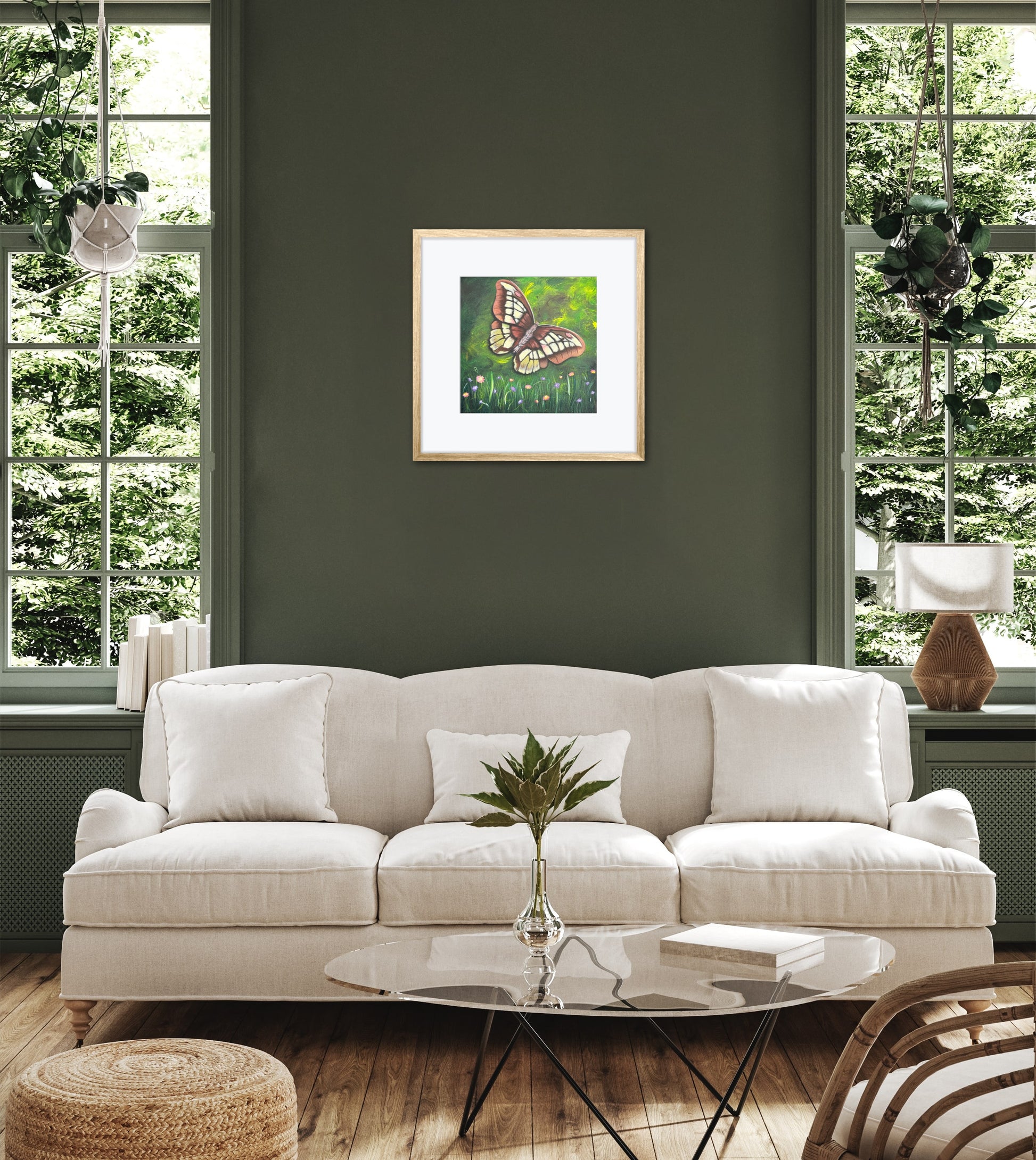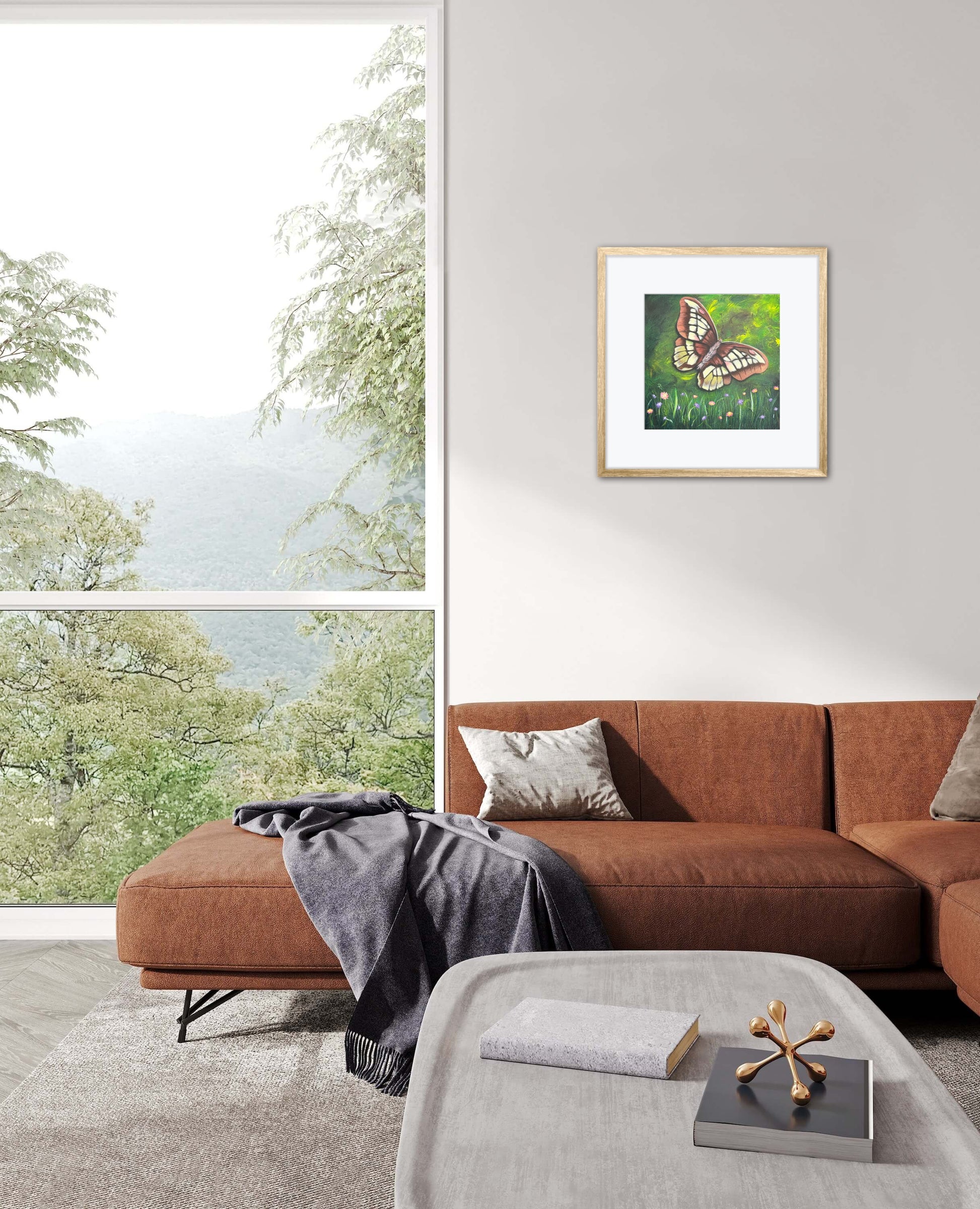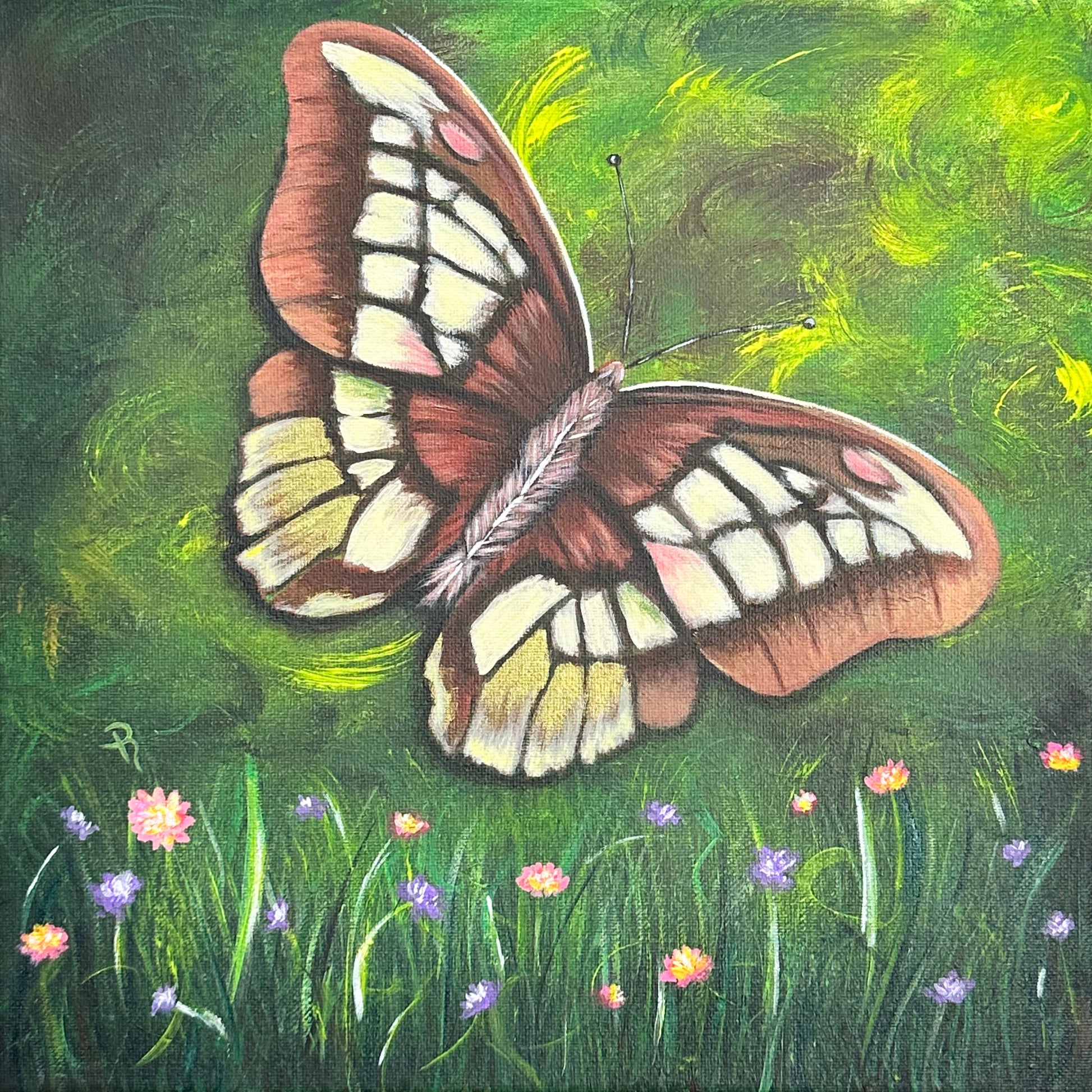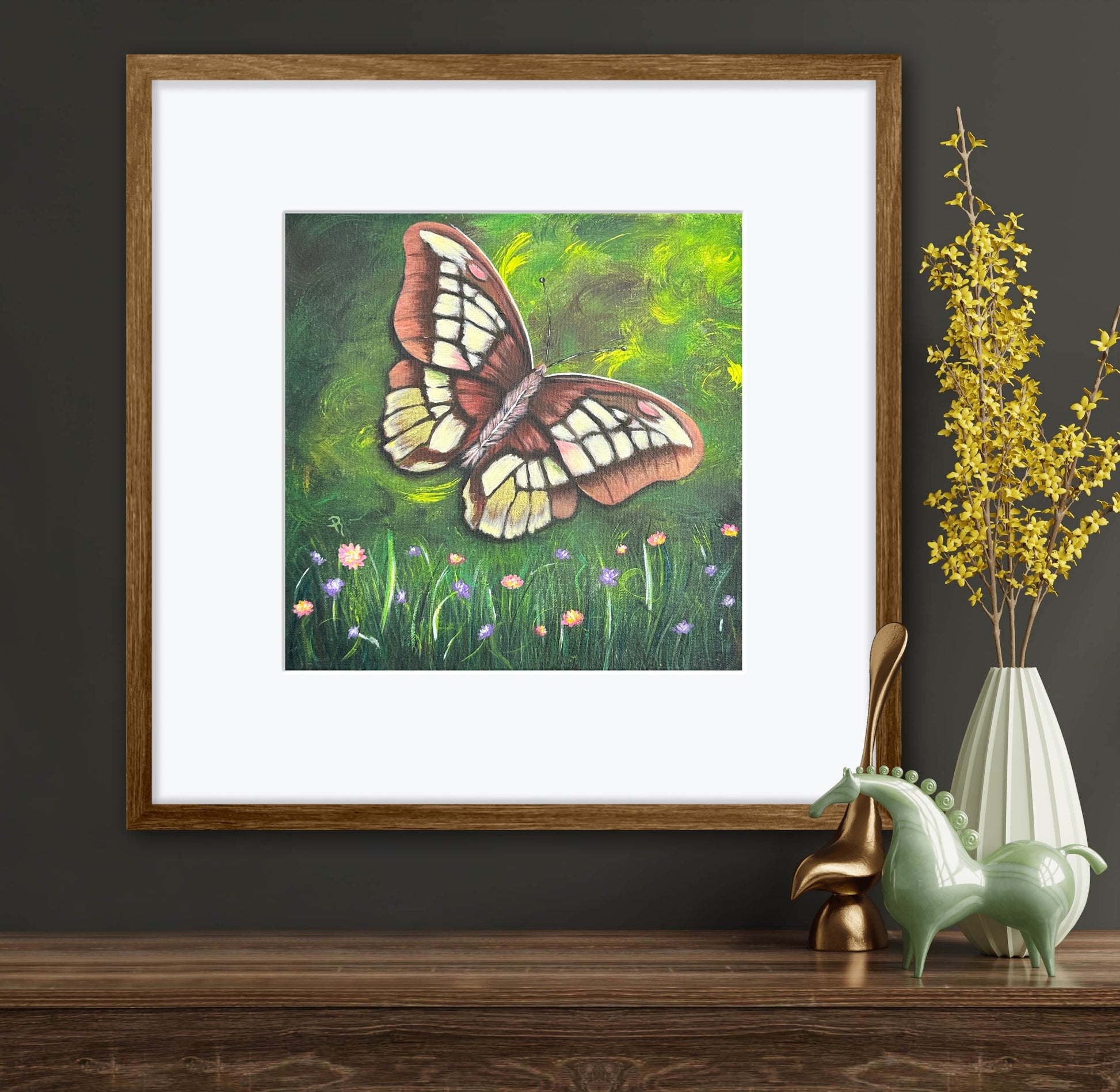 Experience the beauty of the outdoors with this captivating acrylic painting! Admire the brown moth gracefully gliding around a vibrant backdrop of green and fresh wildflowers. Invite nature into your living space and explore the wonders of the world In the Midst of Blooms.
