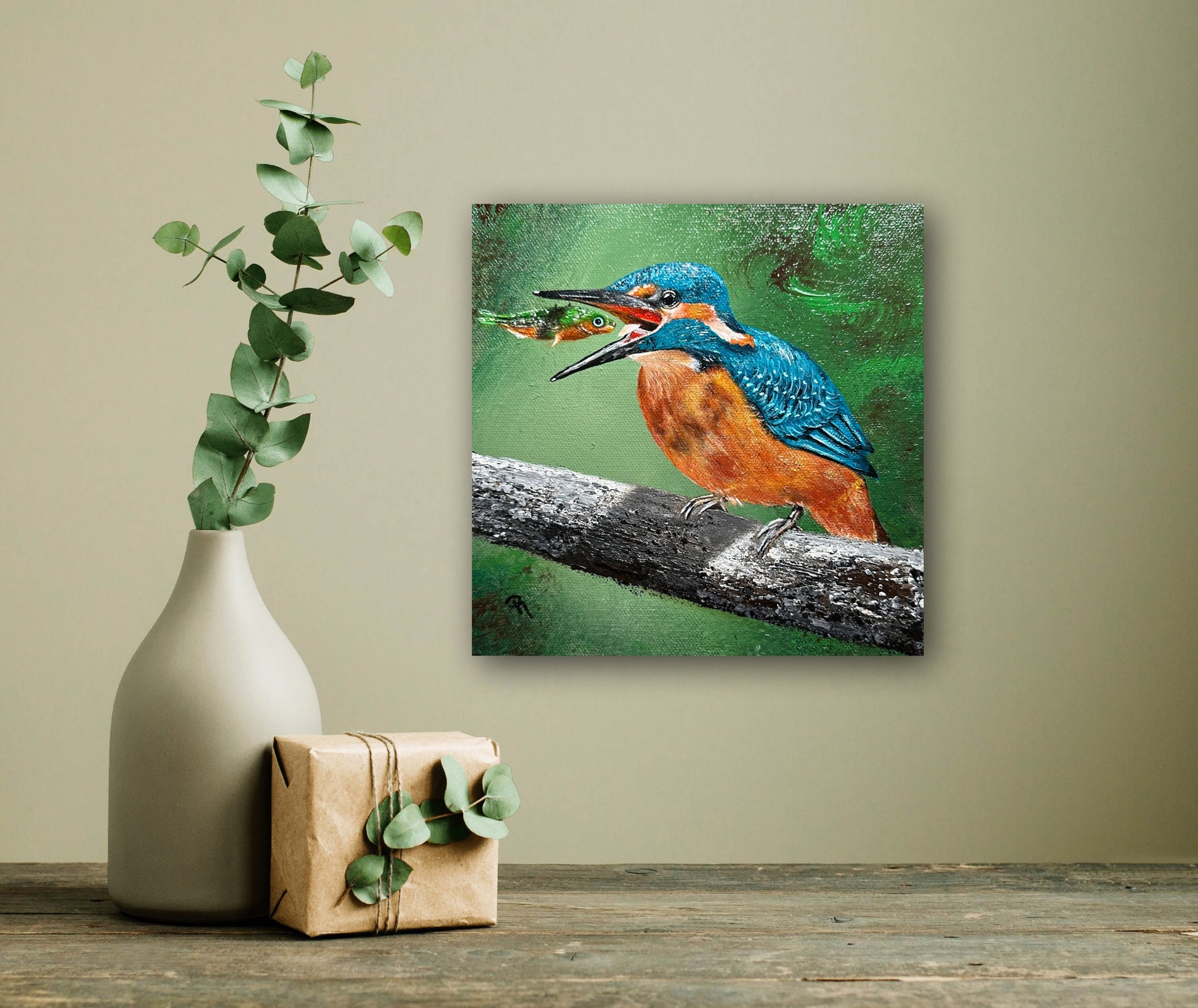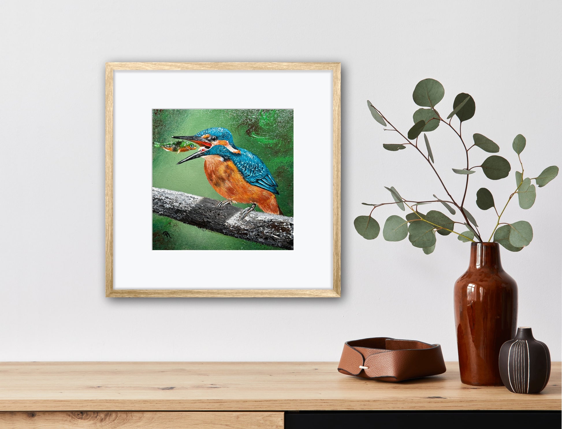 Bring a splash of character to any wall with this delightful acrylic painting of a Kingfisher's Surprised Catch! Lovely hues of blue and green are captured in the bird's feathers, while the fish sports an expression of pure shock. Ah, the joys of a successful fishing trip!
