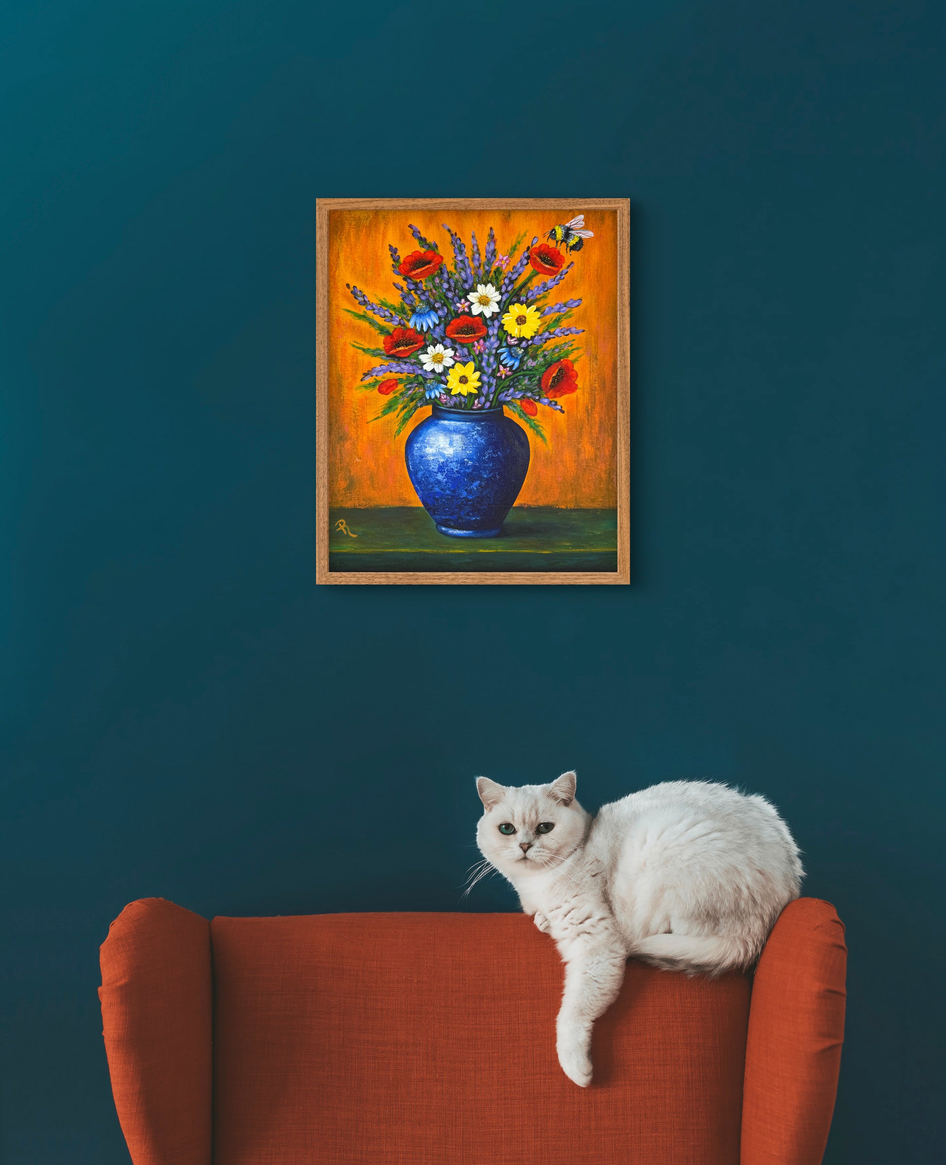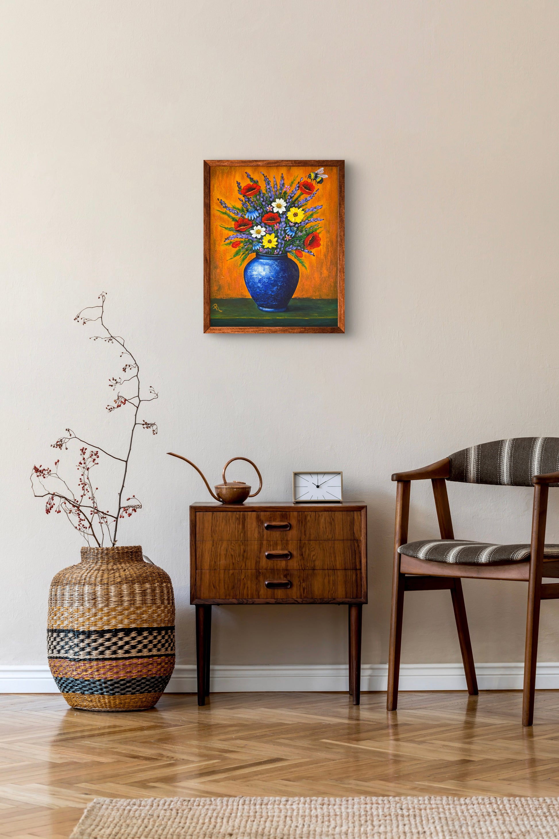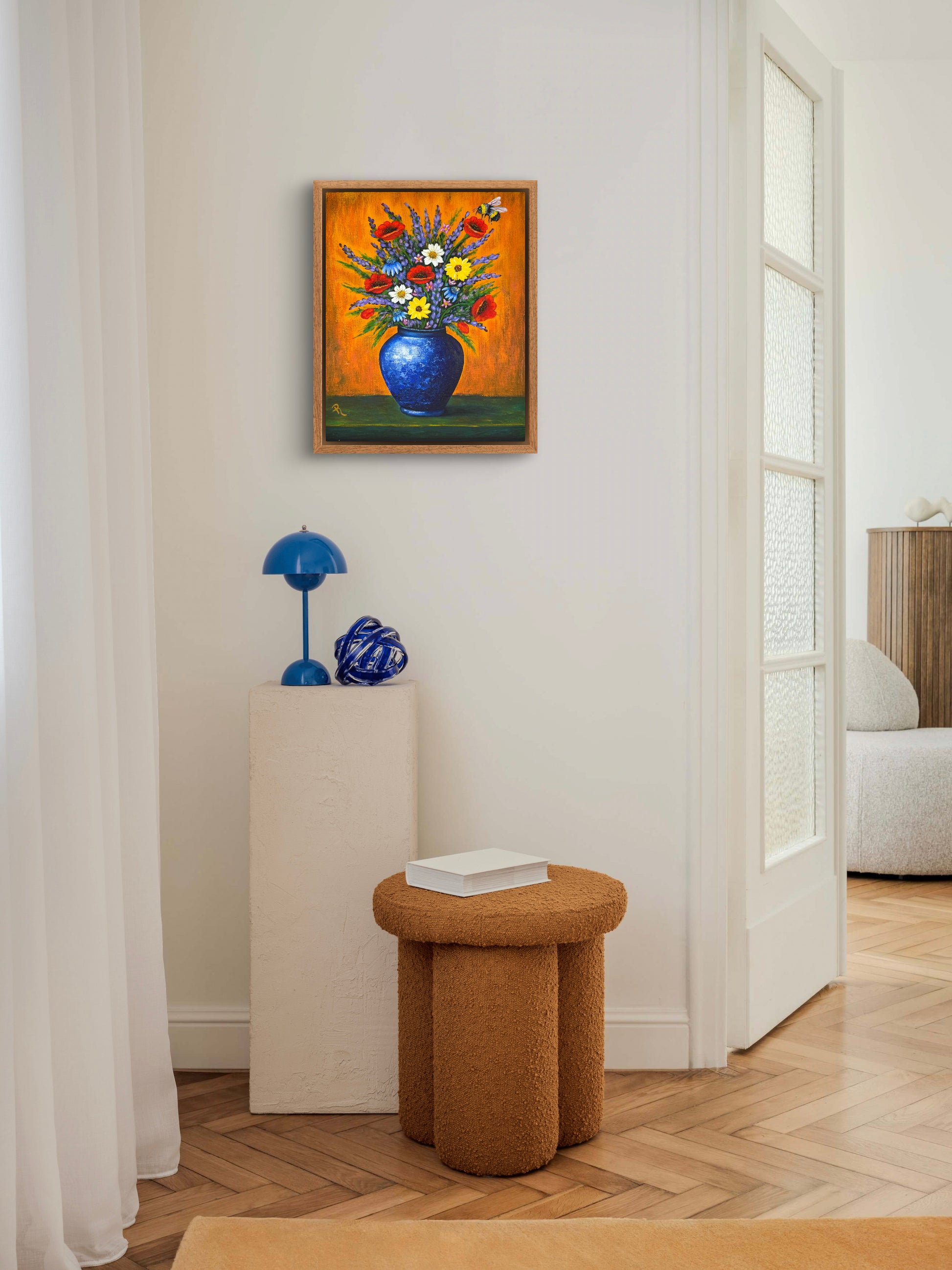 Brighten any room with "L'été en Vase," a vibrant acrylic painting bursting with textural depth. This cheerful artwork captures the essence of summer through a striking blue vase filled with colorful poppies and assorted blooms. The rich textures and lively composition create a focal point that brings warmth and joy to your space.