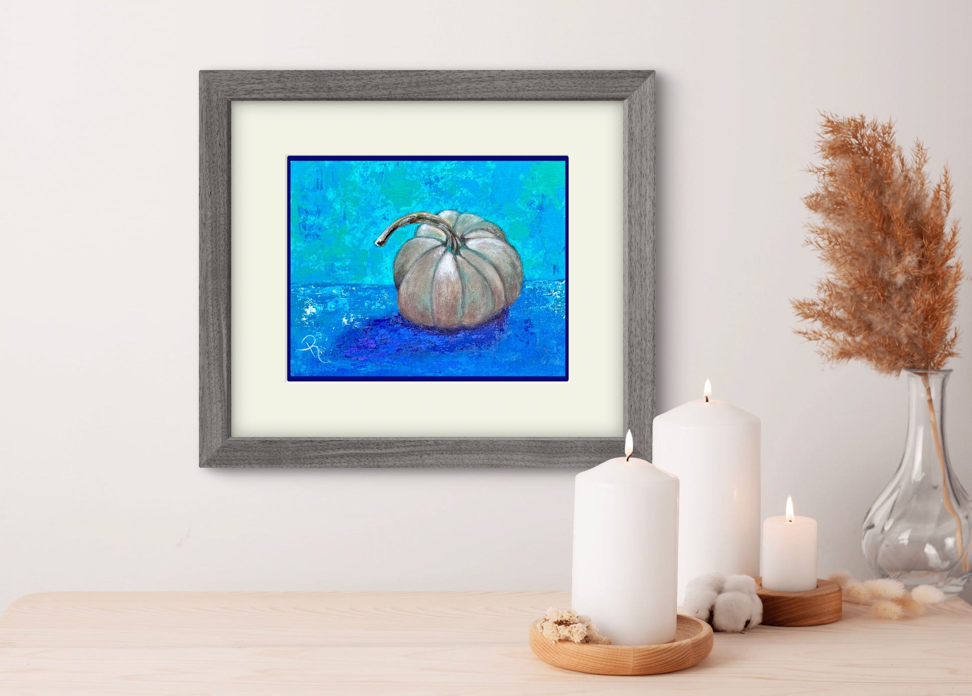 Transform any room into a cozy autumnal haven with our stunning Lonely Pumpkin Acrylic Painting. The intricate details and vibrant colors of the white and grayish pumpkin, contrasted against the textured aqua wall and blue table top, will bring joy and warmth to your home. A must-have for any fall décor!