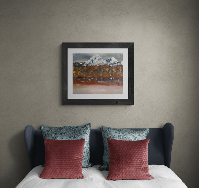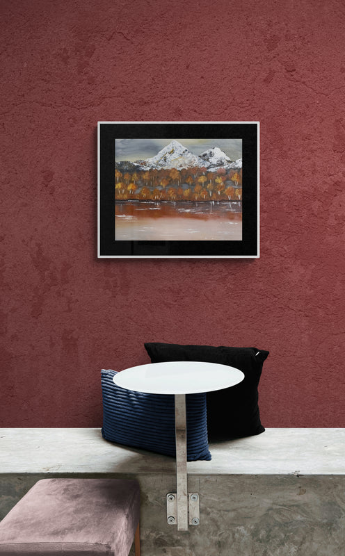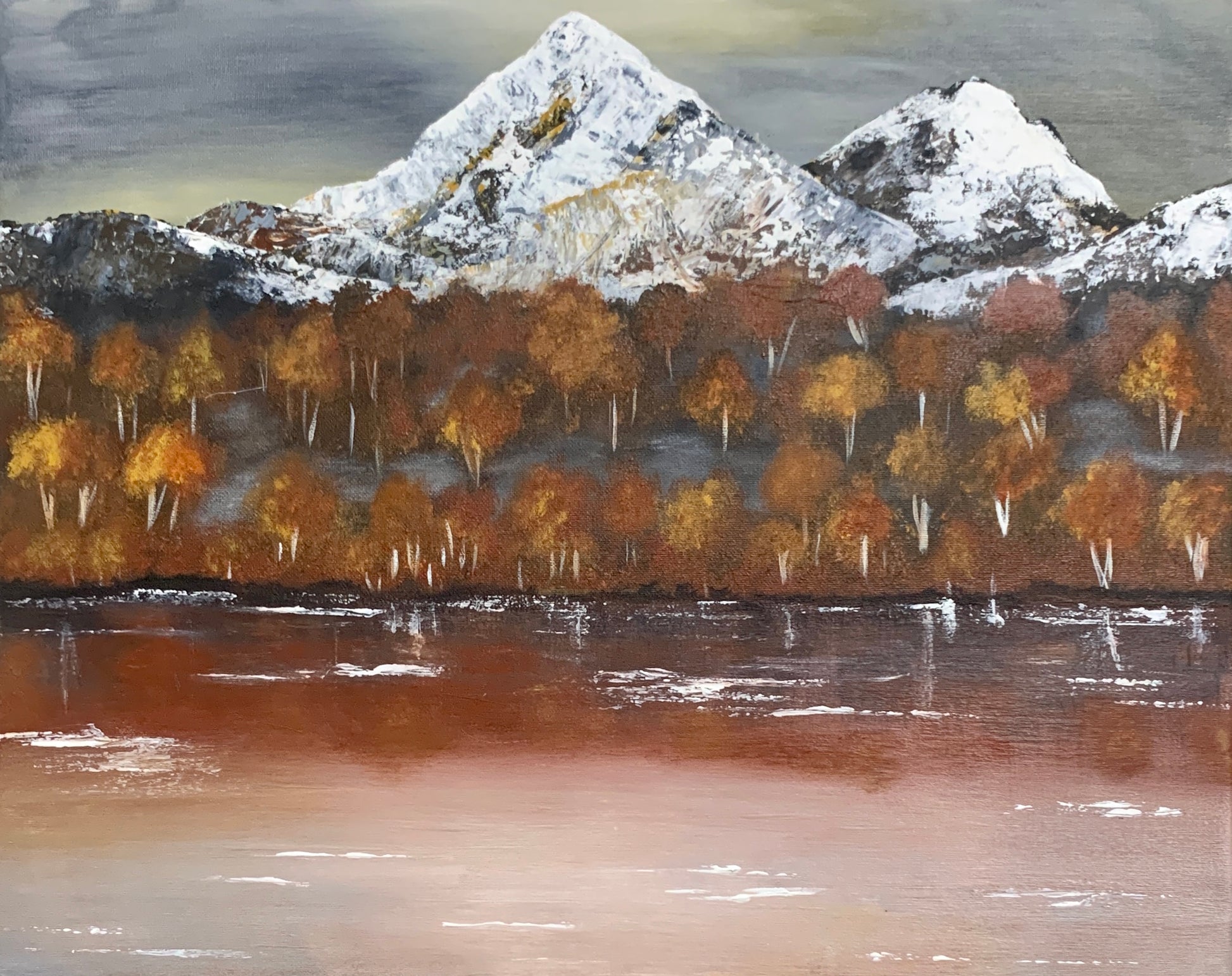 I had an opportunity this summer to actually see mountains this big in Colorado. However when I saw them they didn’t have the snow and were covered with lush green grass and trees. This painting shows snow capped mountains with trees bursting with the colors of fall reflecting on the lake below. Painted using brushes and a palette knife it’s a seasonal painting that will look great in your home or office all year.