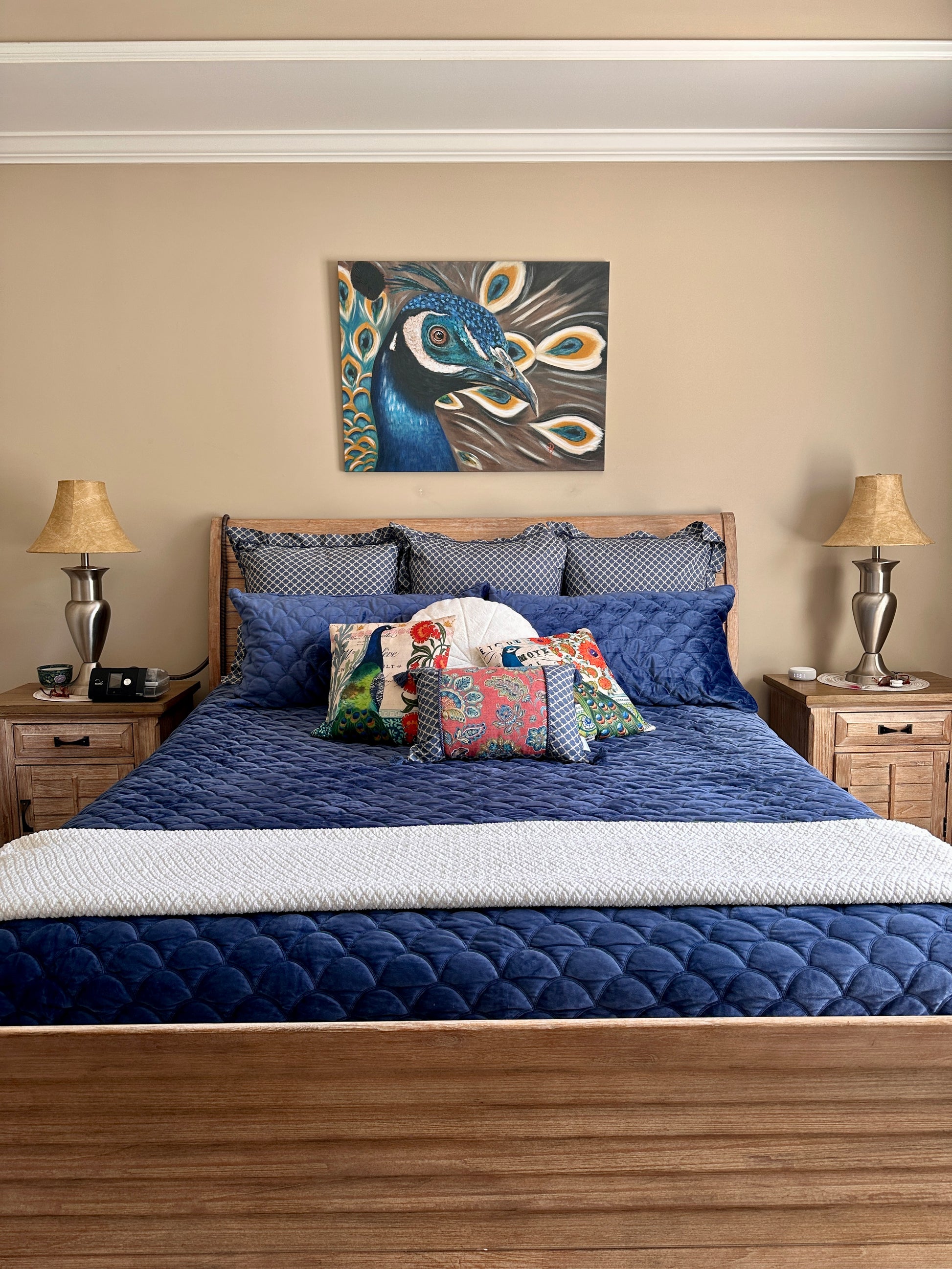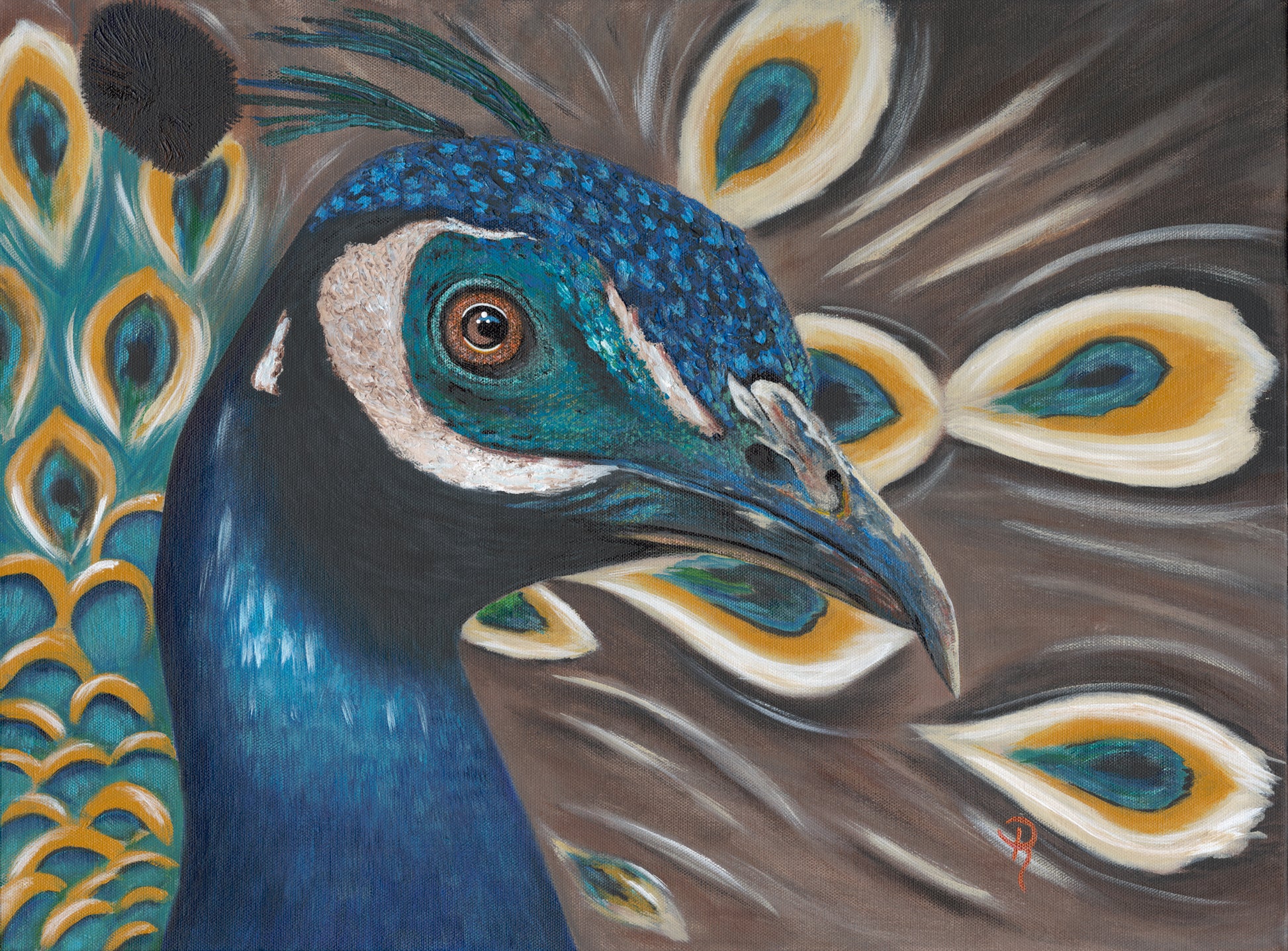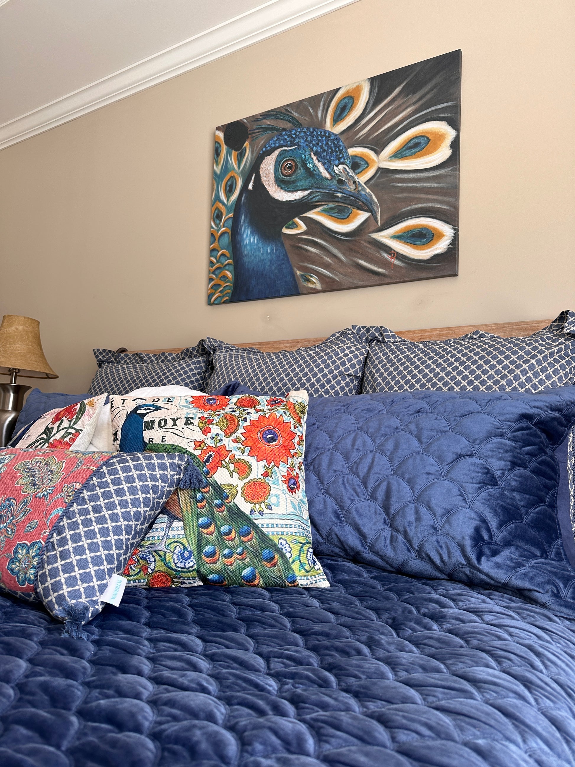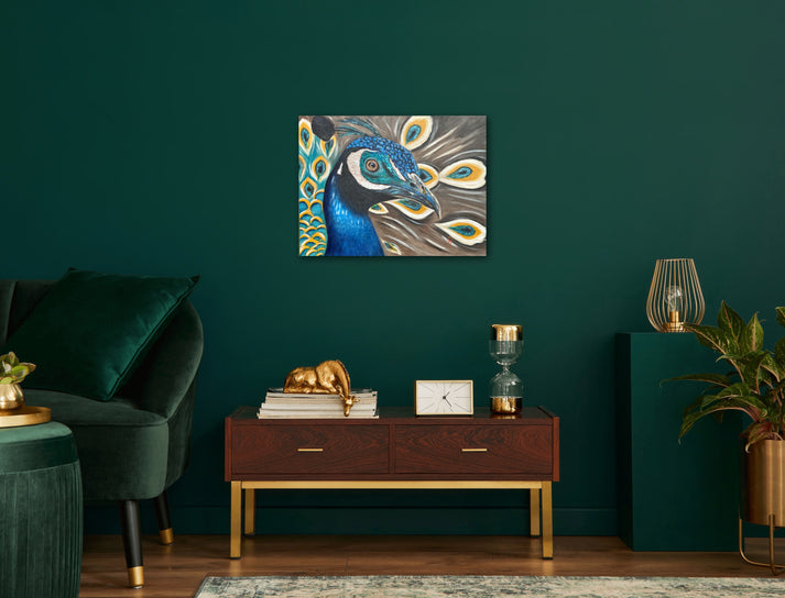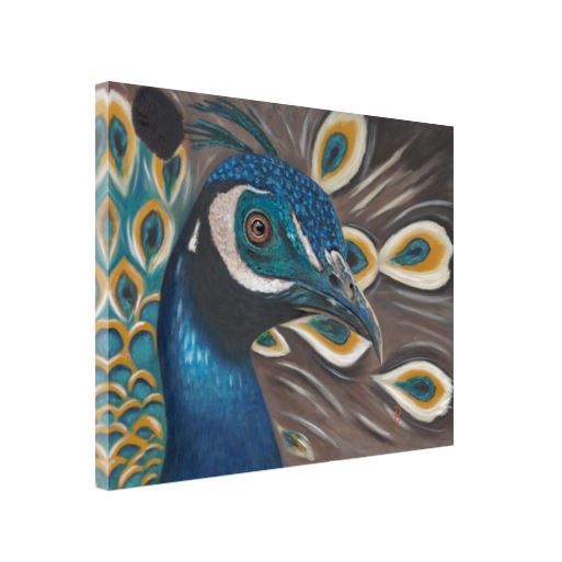 Behold, the Majestic Peacock in all its splendor, now immortalized on a stunning canvas gallery wrapped print! Featuring vibrant colors of blue, gold, and brown it will make a bold statement and beautiful addition to any art collection, adding sophistication to any space or home.