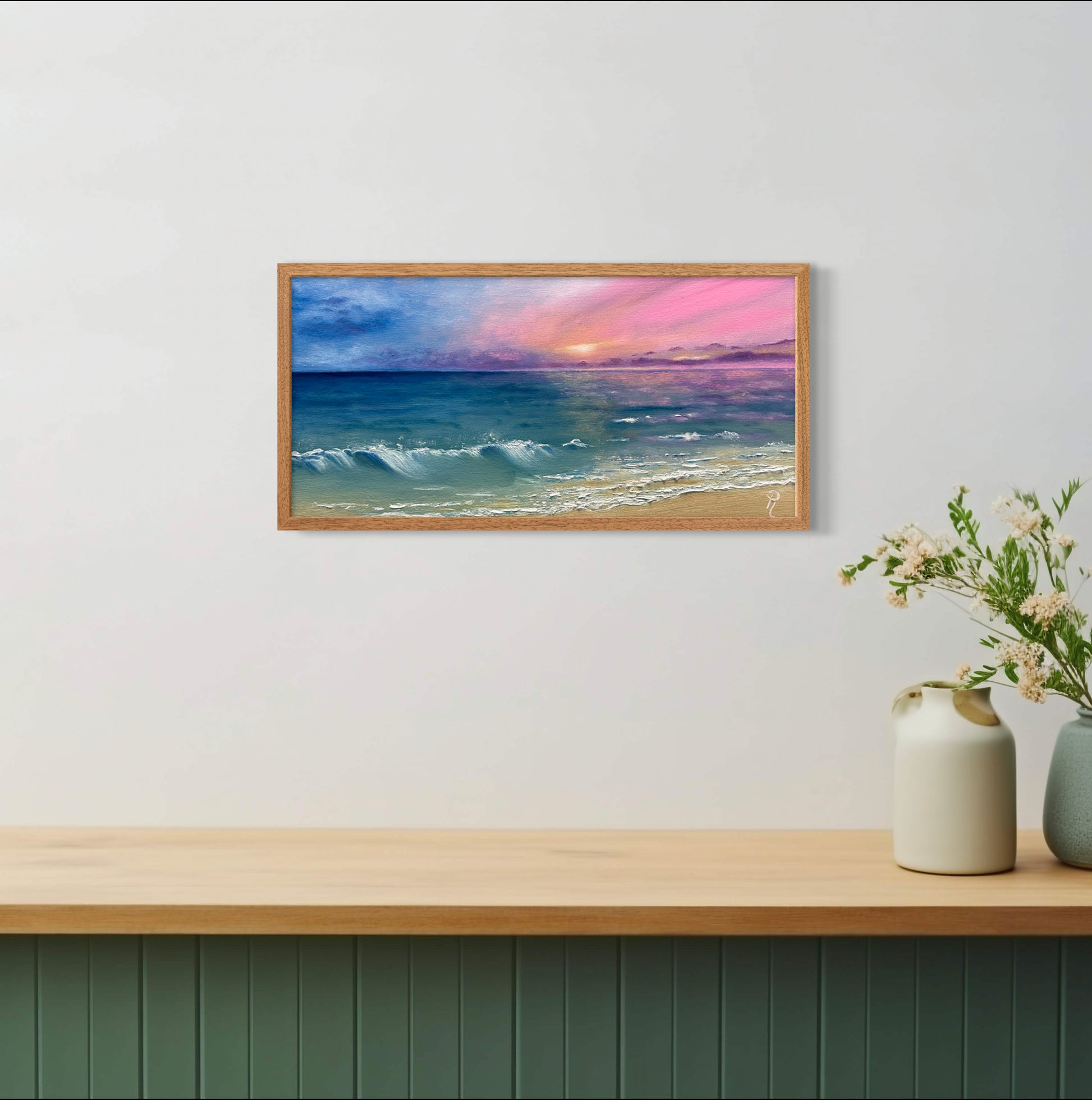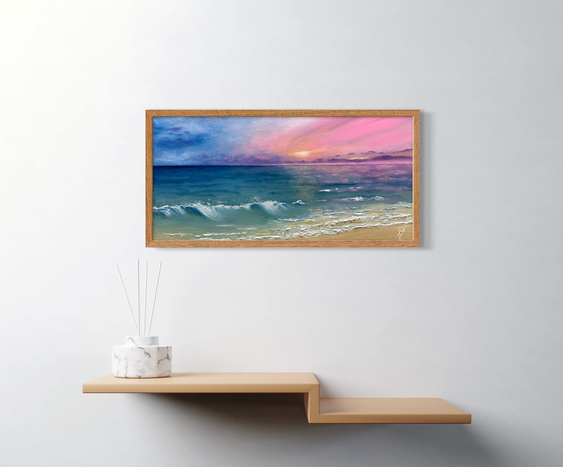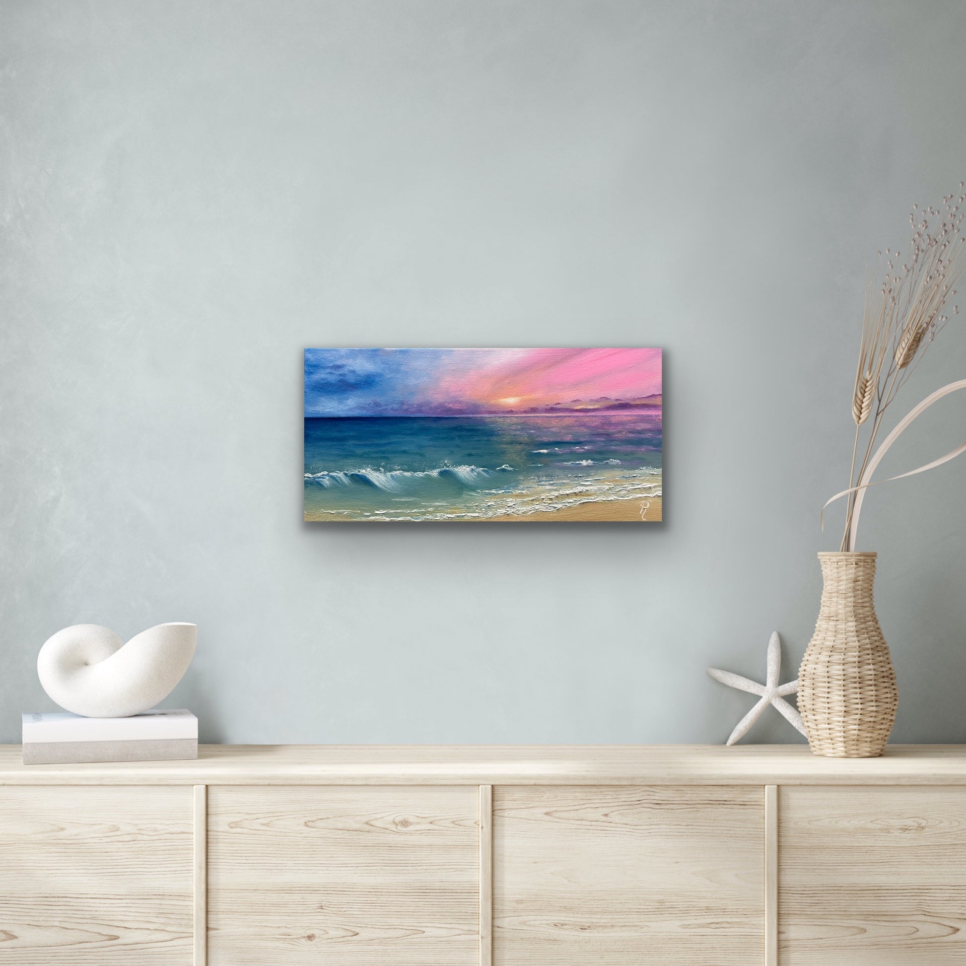 Unleash your adventurous side with our Pink Sunset Oil Painting. Transport yourself to an ethereal world with the hues of pink sky and storm clouds over the ocean. Perfect for those who love taking risks and seeking new challenges. Get ready to be inspired!