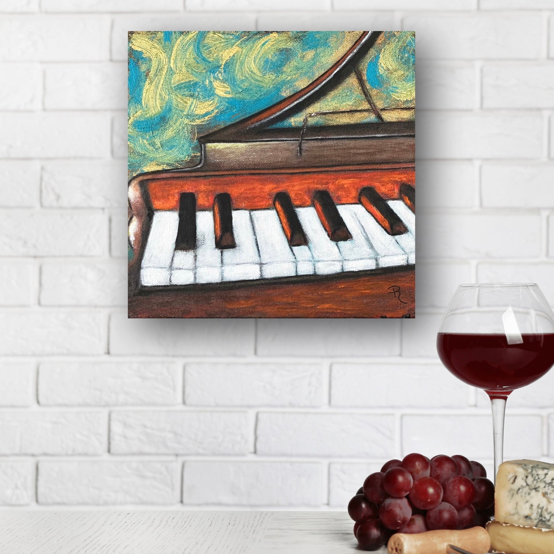 This funky abstract painting features a close up of piano keys with the background in hues of gold, aqua, and brown that will perfectly adorn any room. Play Me a Tune will bring music and harmony to your home with its vibrant colors and classic artistry that pianist and lovers of piano music will adore.