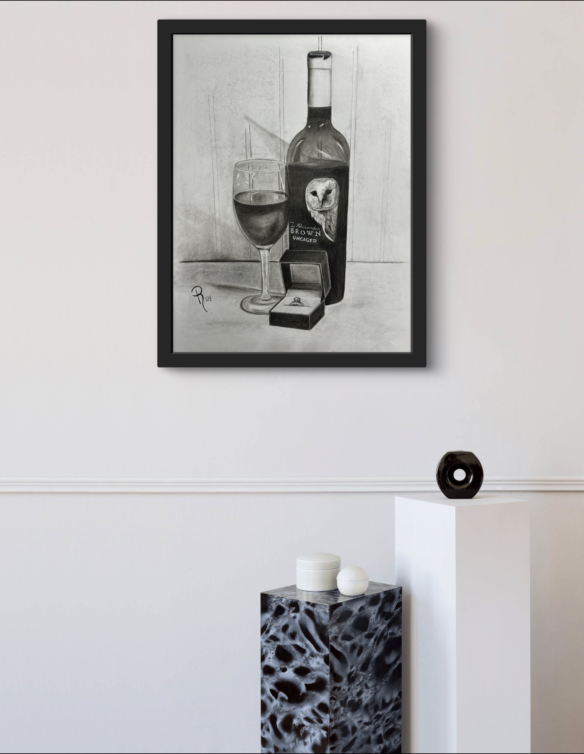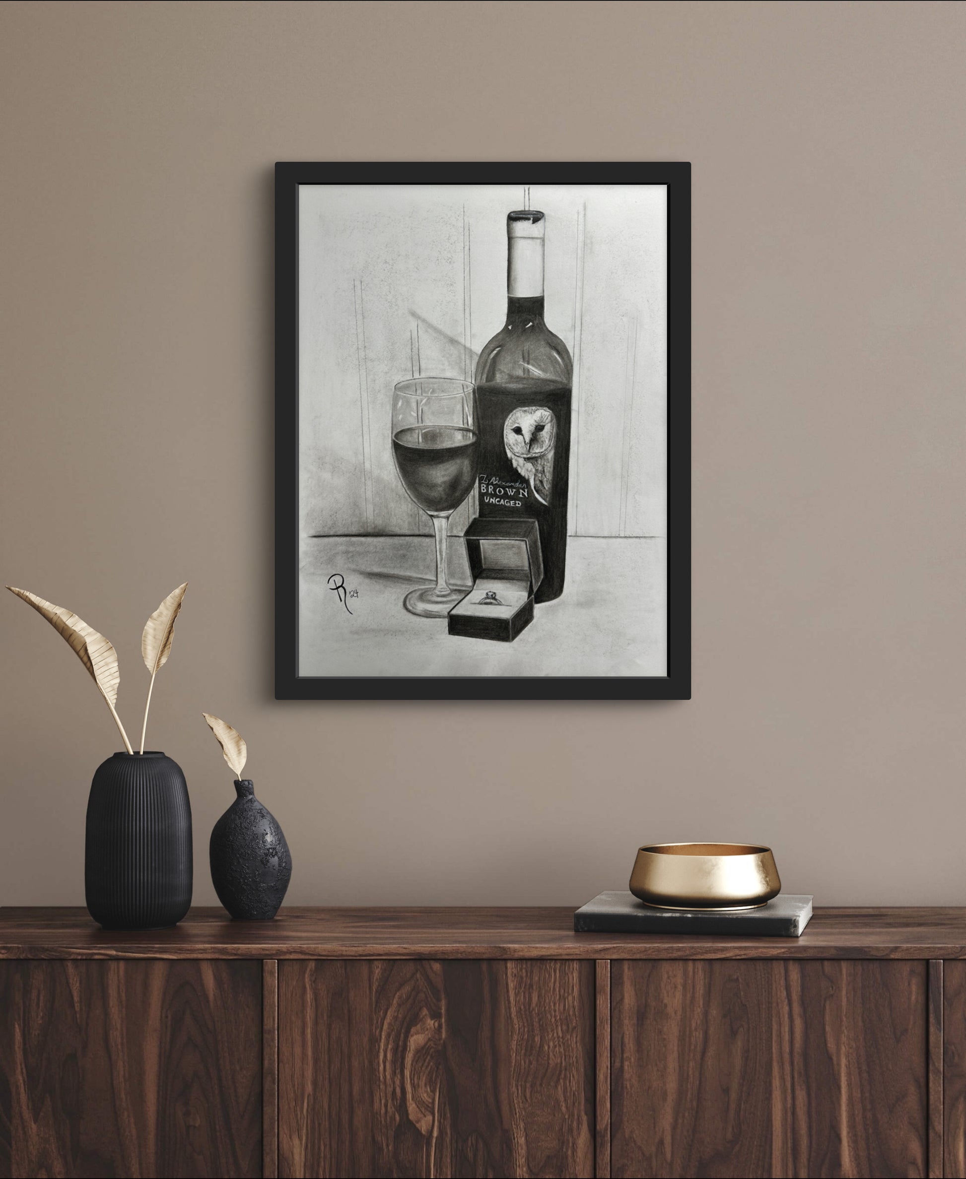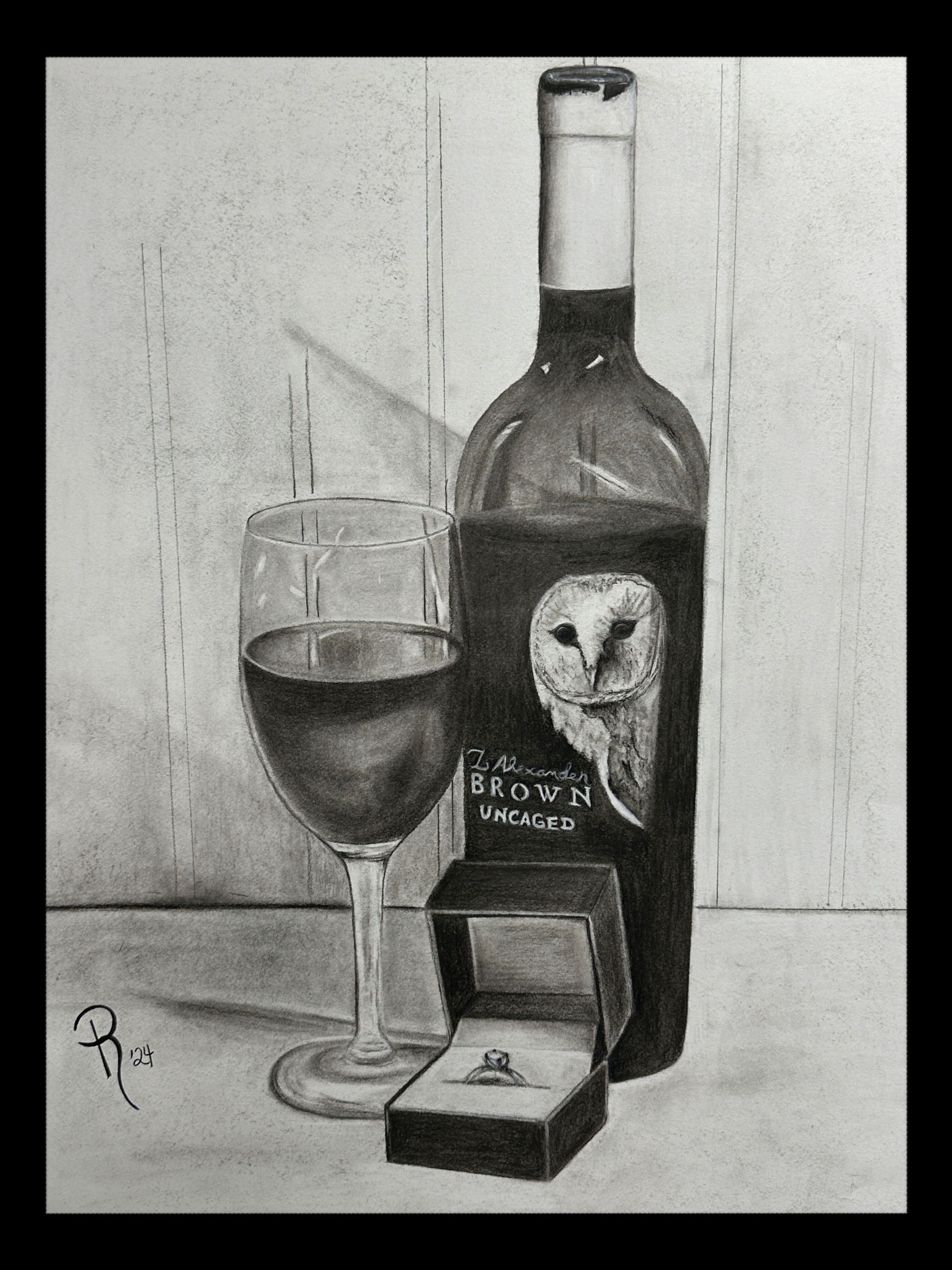 Pop the question in a unique way with this charming charcoal still life drawing featuring a bottle of Z Alexander Brown Uncaged wine, a glass ready to serve and enjoy, and a ring box with an engagement ring. Perfect for wine lovers and those looking for a playful twist on popping the question!