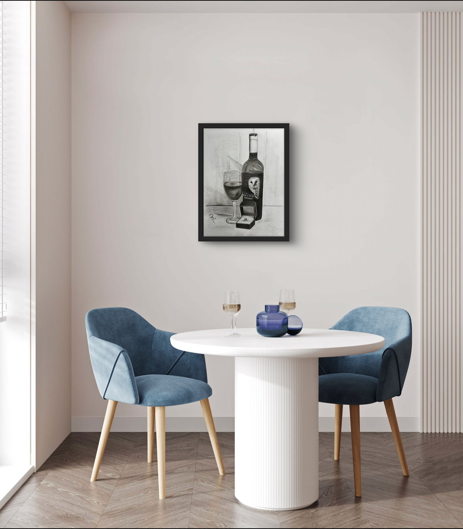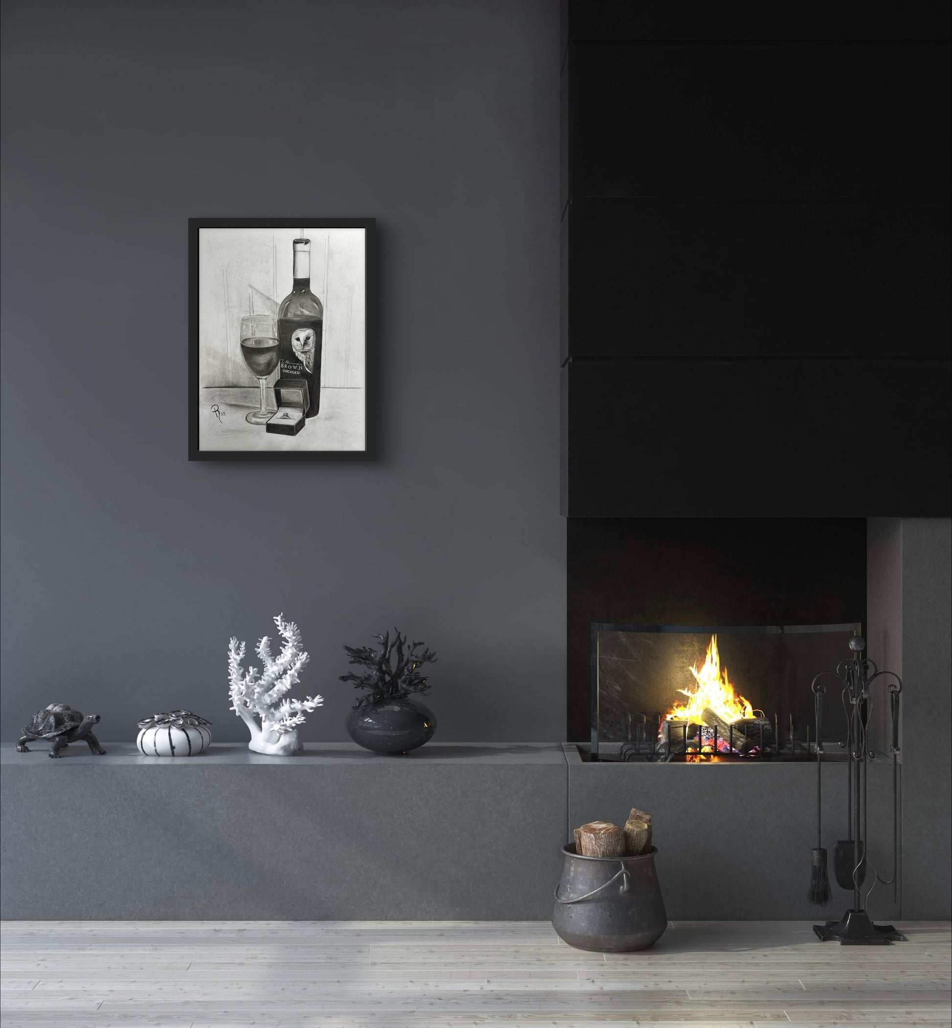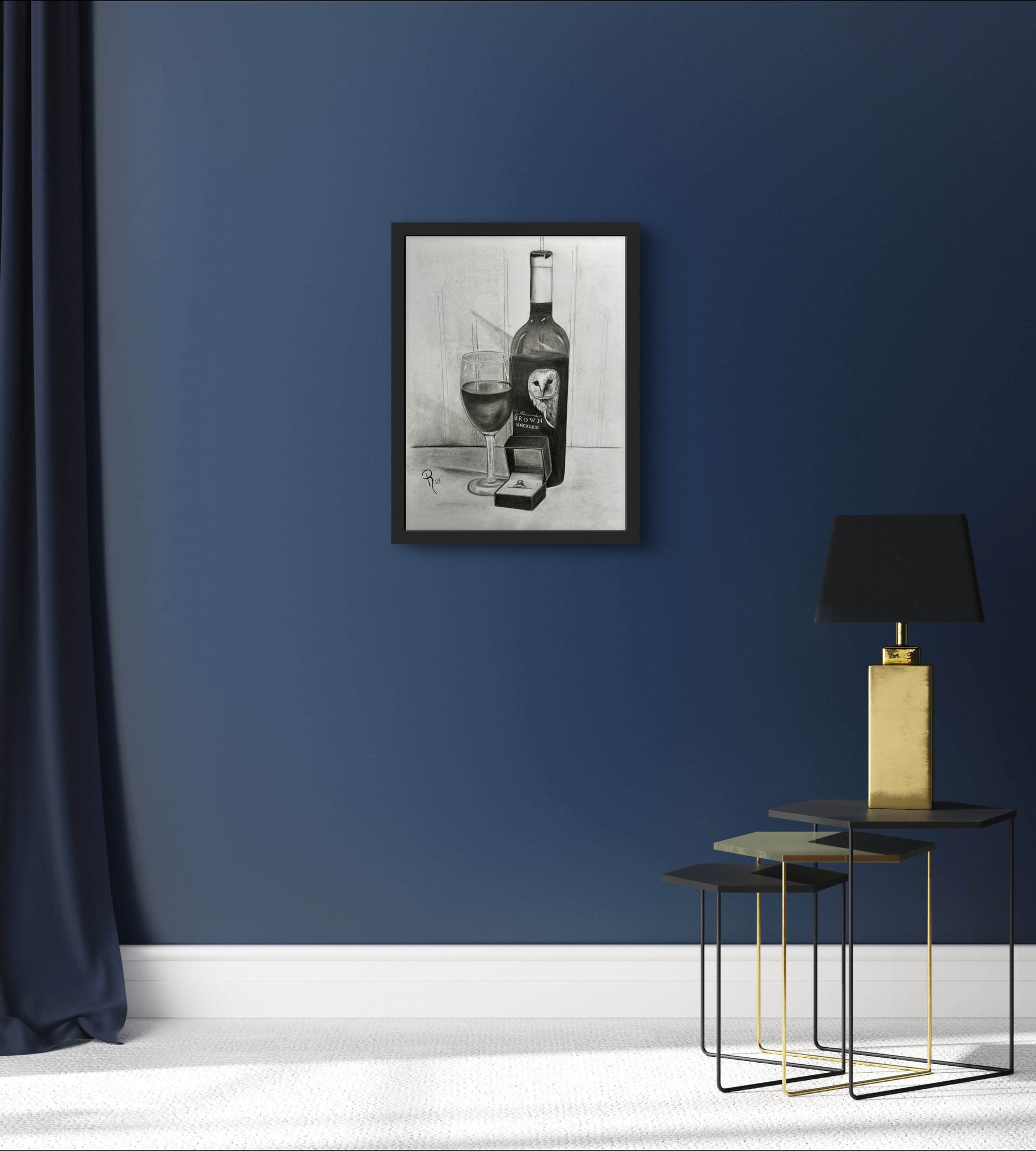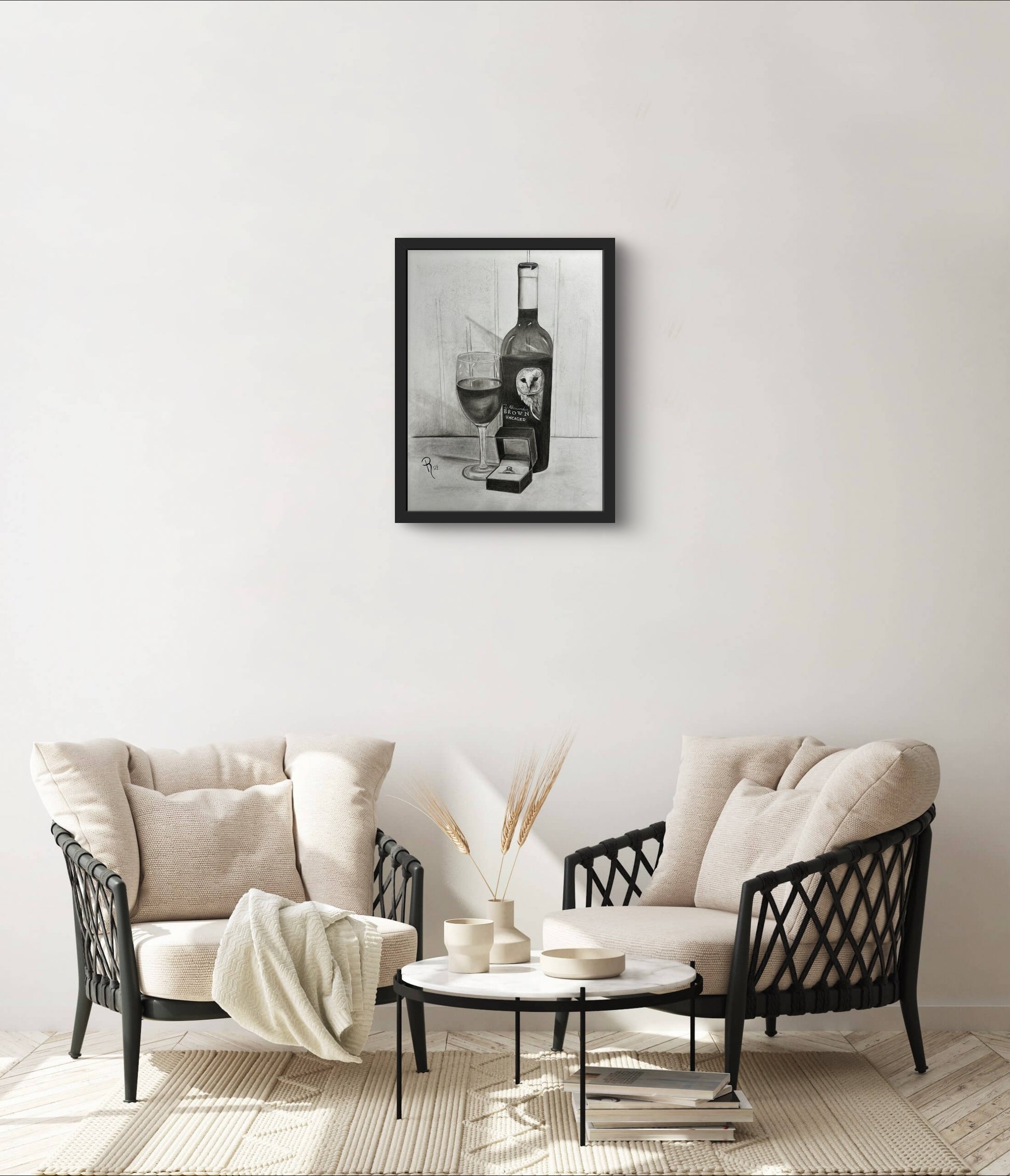 Pop the question in a unique way with this charming charcoal still life drawing featuring a bottle of Z Alexander Brown Uncaged wine, a glass ready to serve and enjoy, and a ring box with an engagement ring. Perfect for wine lovers and those looking for a playful twist on popping the question!