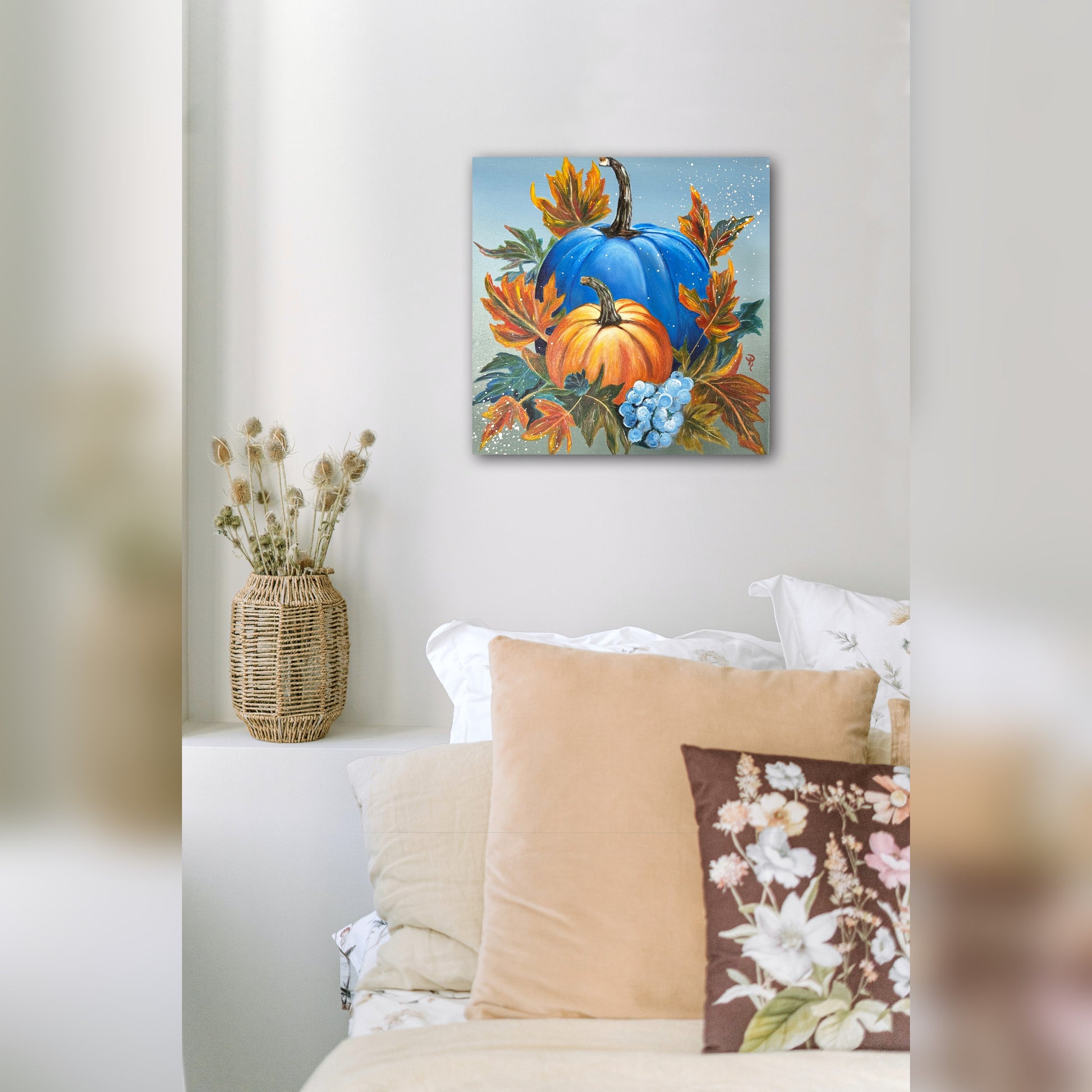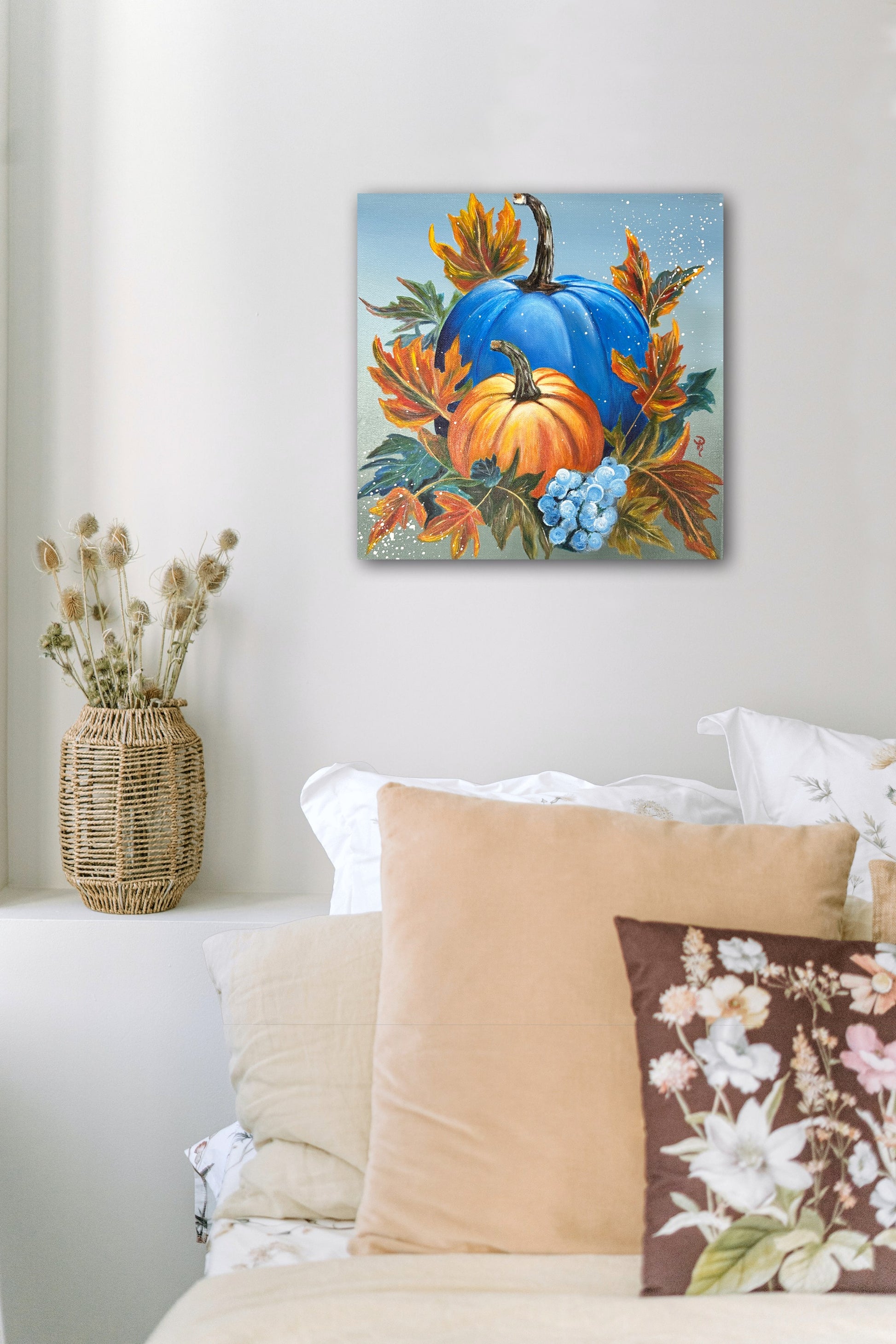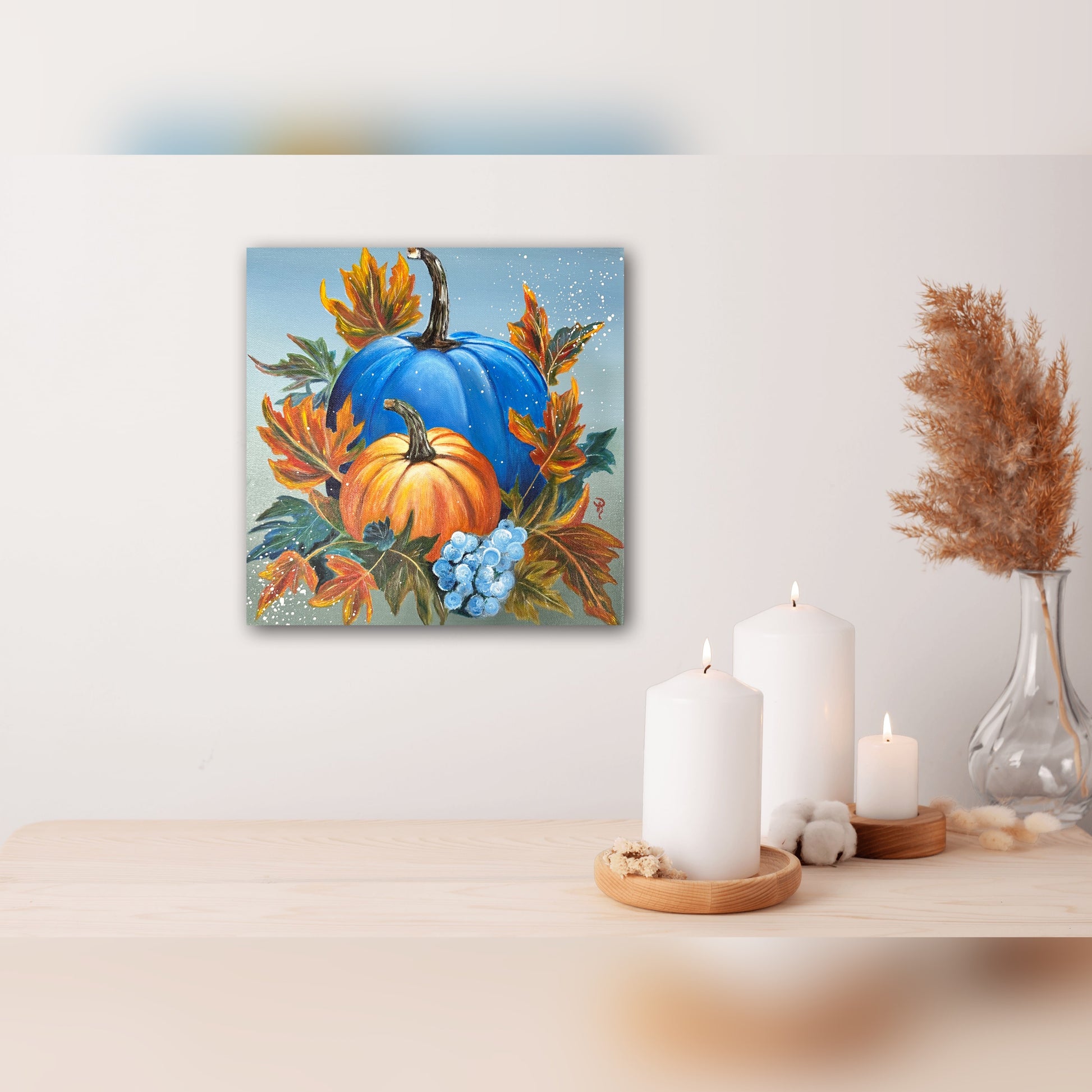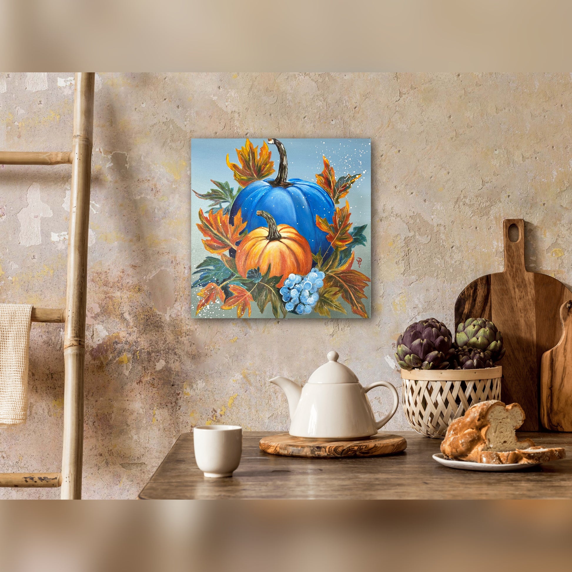 Fall in love with this unique acrylic painting of two pumpkins surrounded by a mass of autumnal leaves! You won't be able to take your eyes off the majestic large blue pumpkin and the endearing small orange pumpkin. This piece is sure to bring some Pumpkin Bliss to your home!