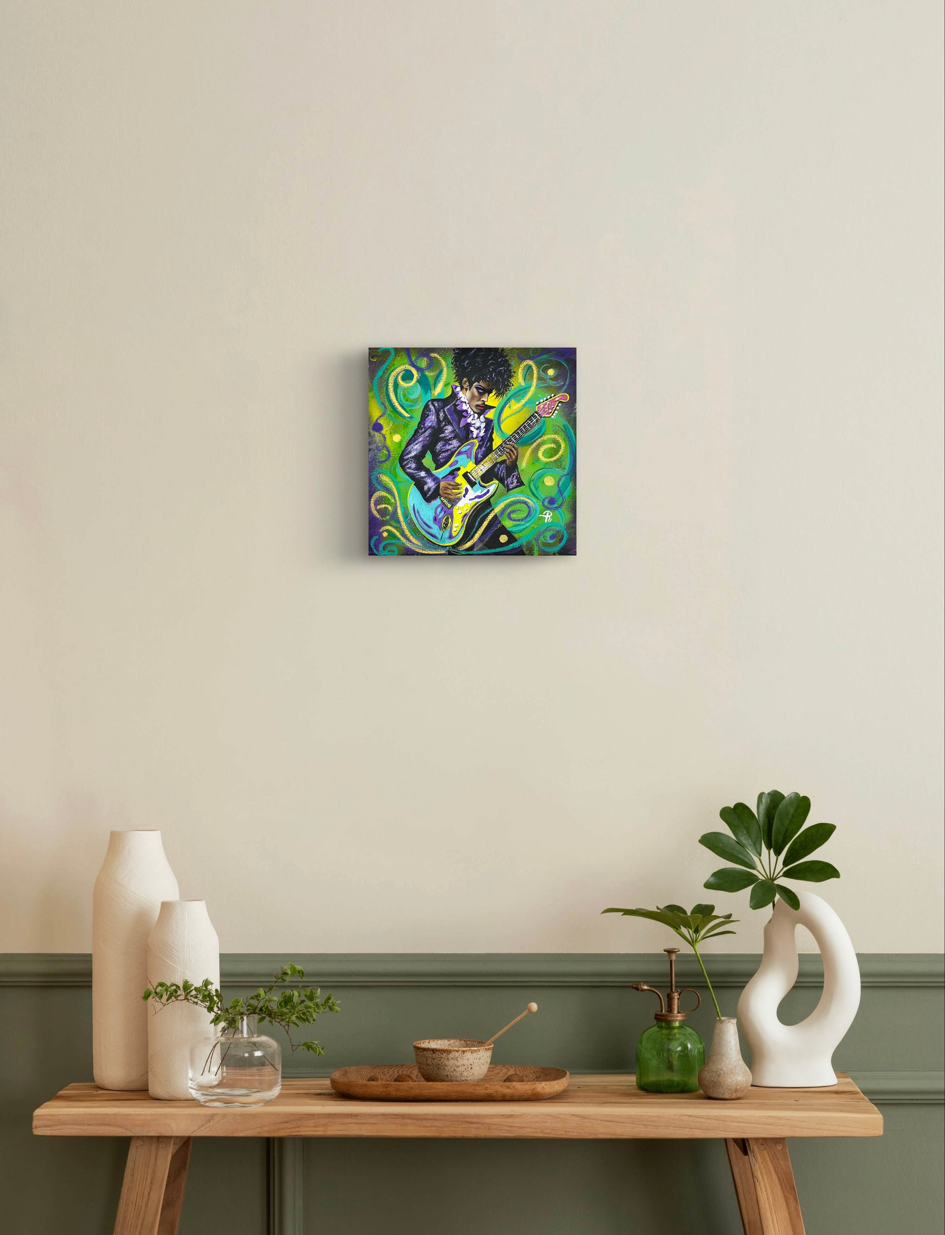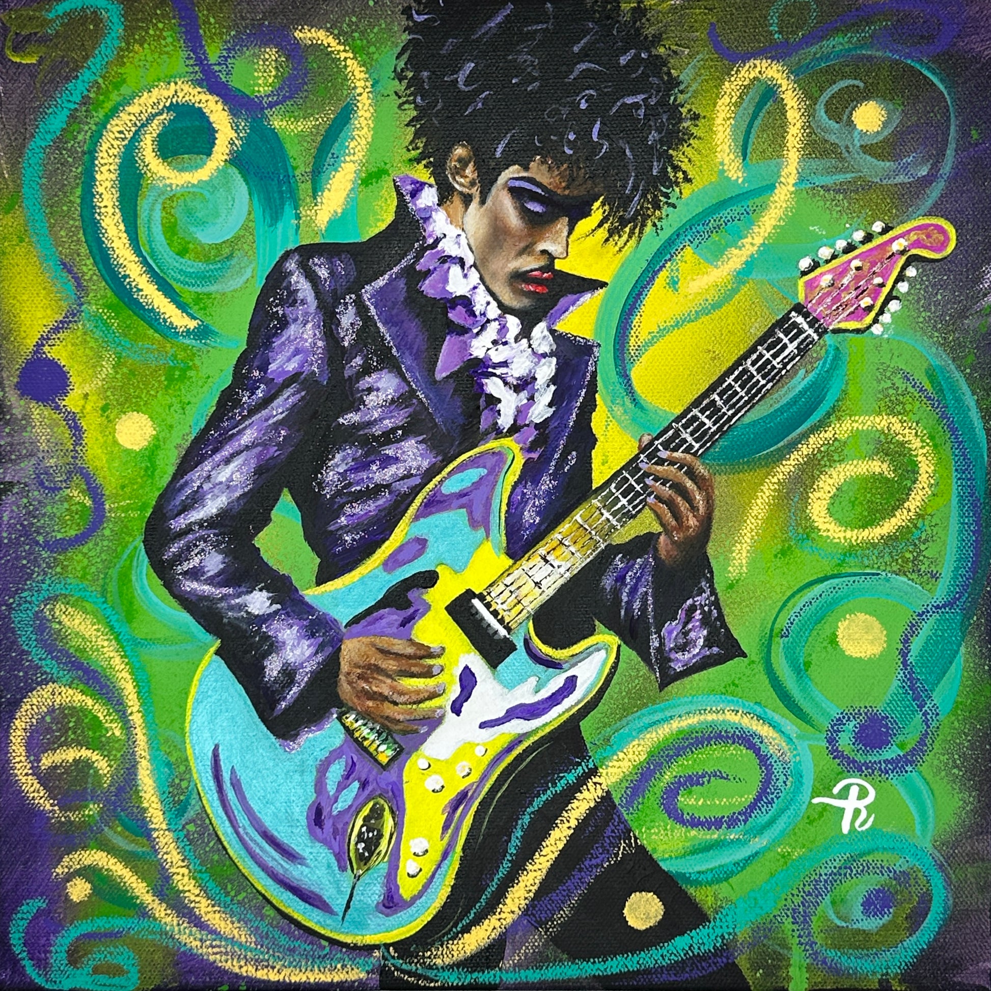 Capture the energy and charisma of Prince with this 12" x 12" acrylic painting. Featuring the iconic musician in a purple suit with glitter accents, this piece showcases his signature style and talent. Swirls of color add movement and vibrancy to this must-have for any fan or art enthusiast.