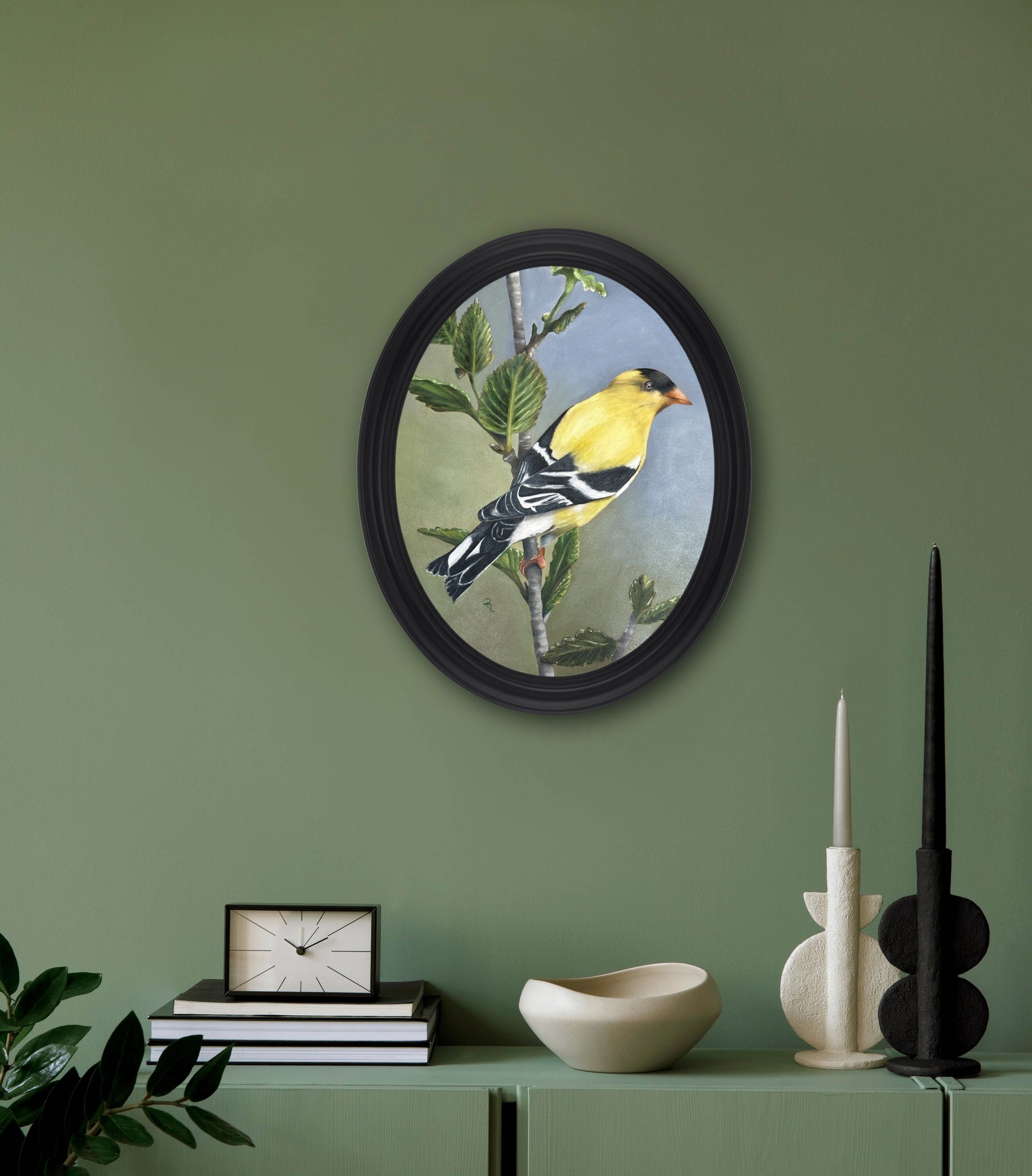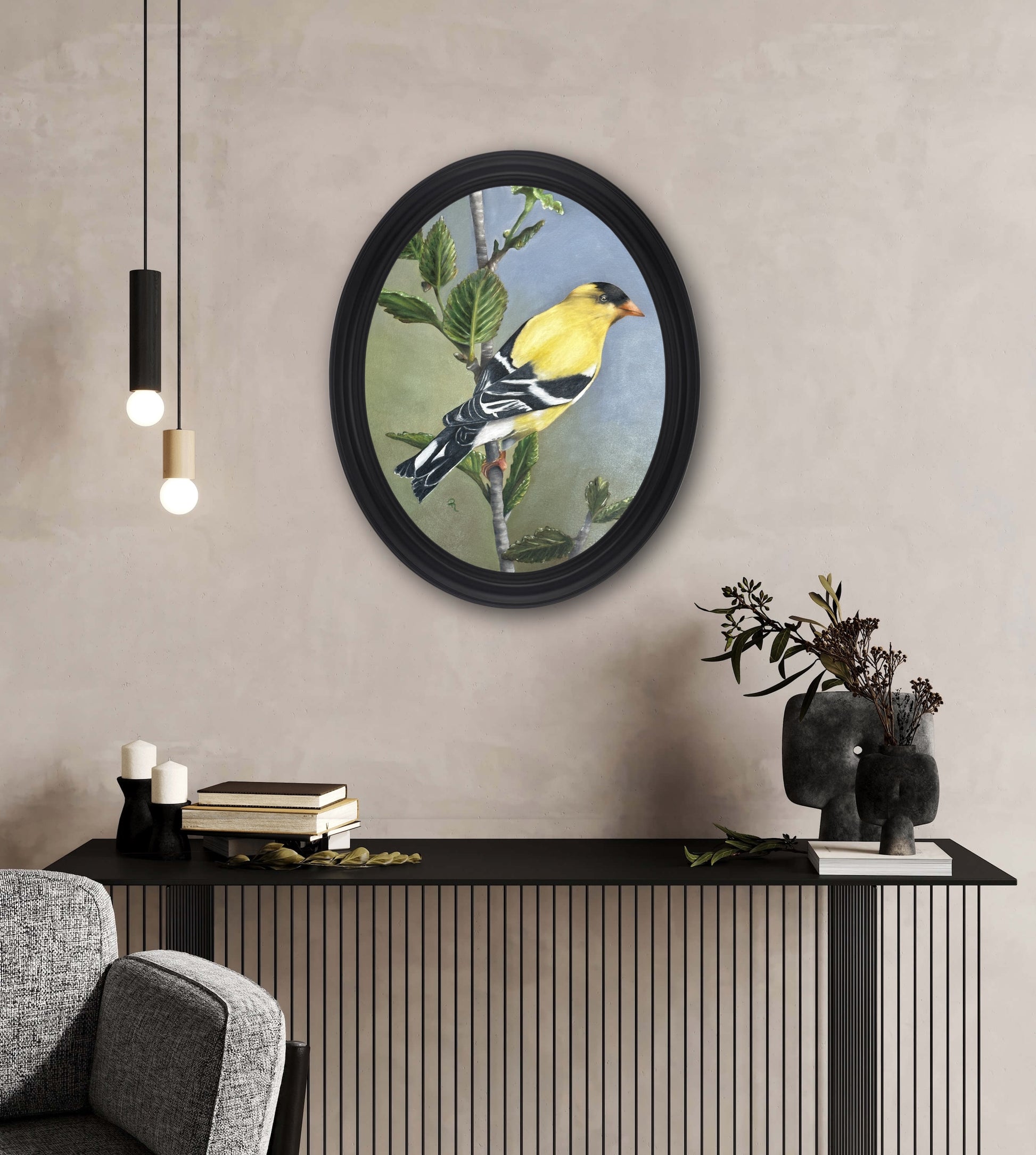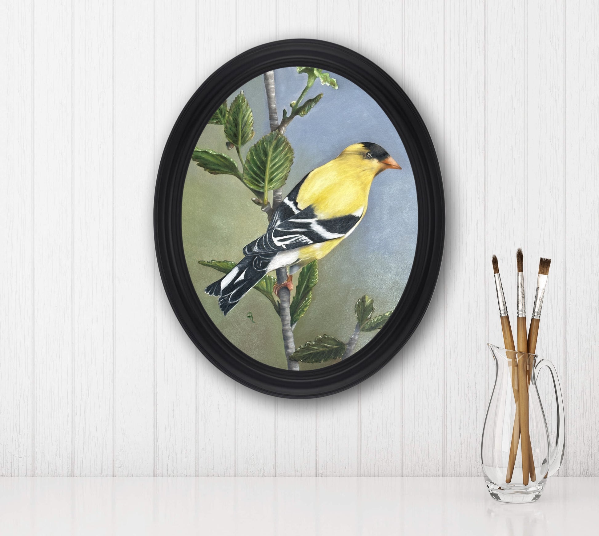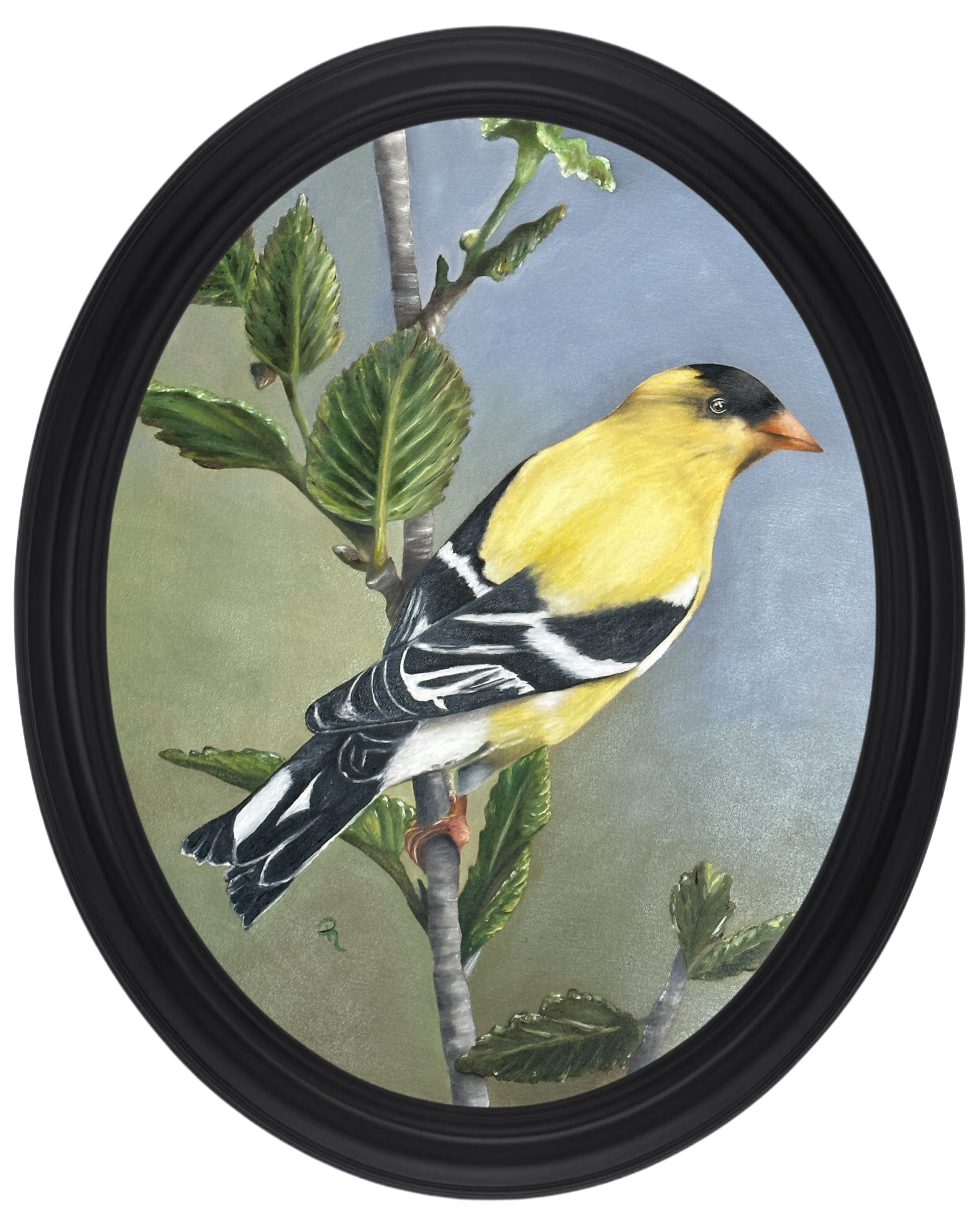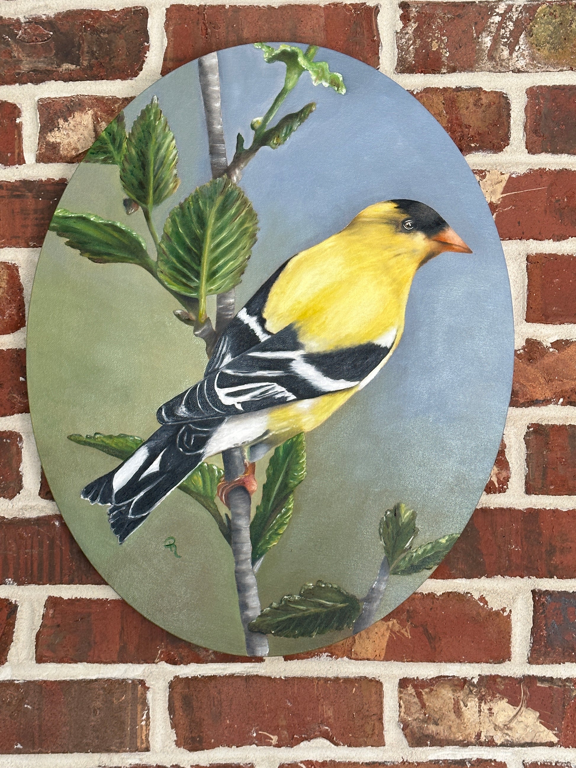 Bring a lively splash of natural beauty to your walls with this Radiant Goldfinch Oil Painting! This vibrant oval canvas displays an enchanting goldfinch perched on a branch in exquisite detail. It's sure to be a feathered favorite in any room!