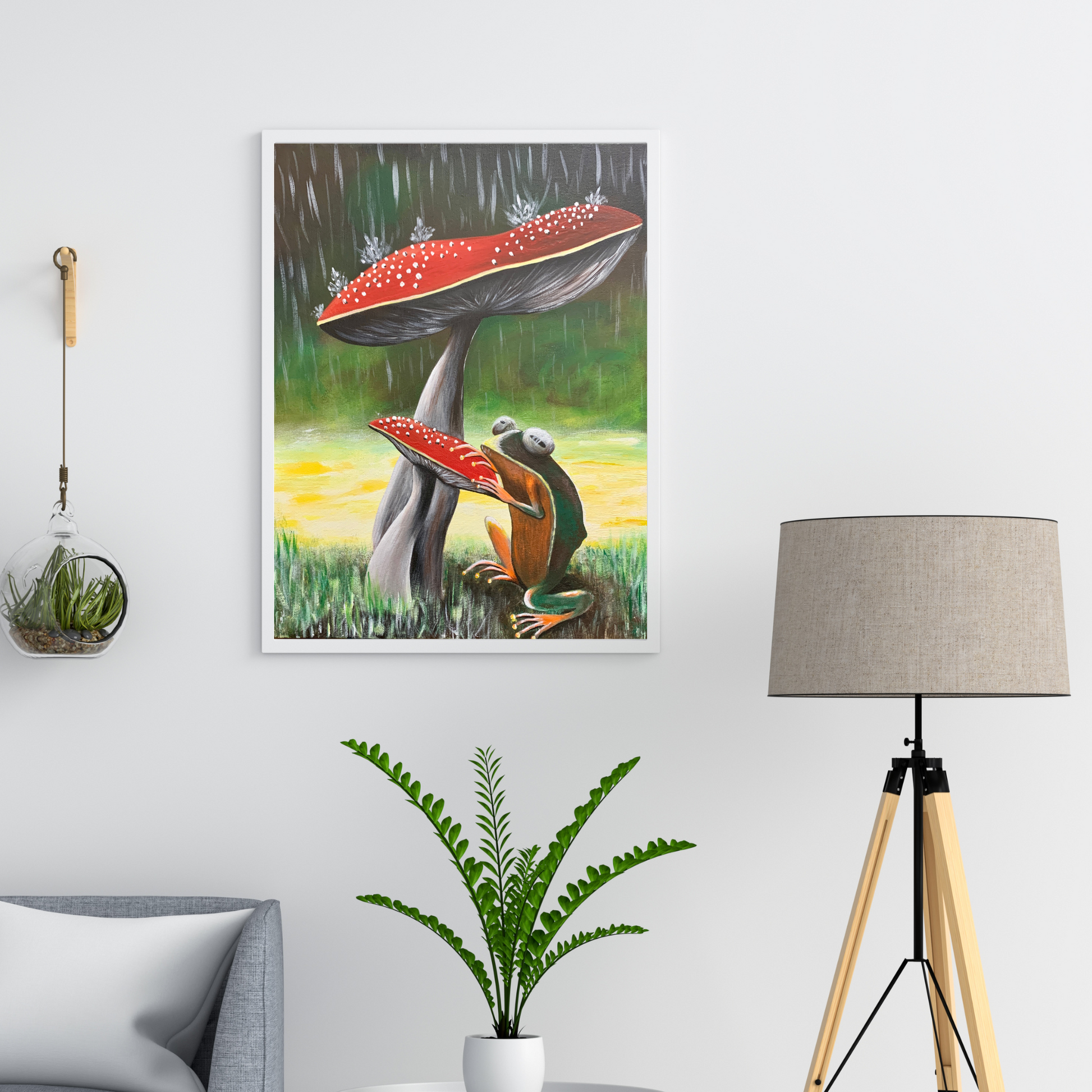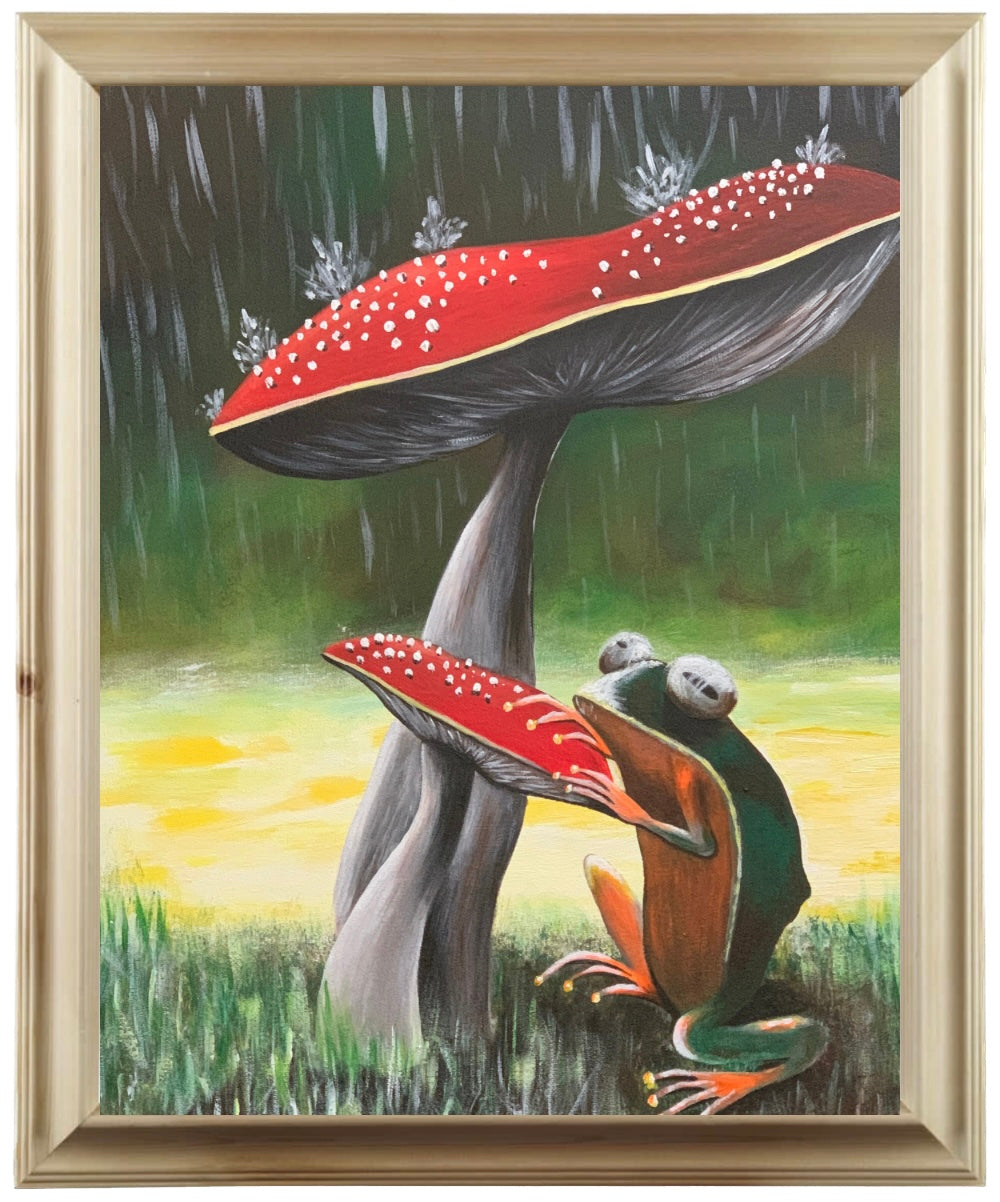 This adorable frog has been caught in a storm and is seeking shelter under a colorful mushroom. If you love frogs or even mushrooms then you'll adore this colorful whimsical one of a kind hand painted frog and mushroom painting in your home.