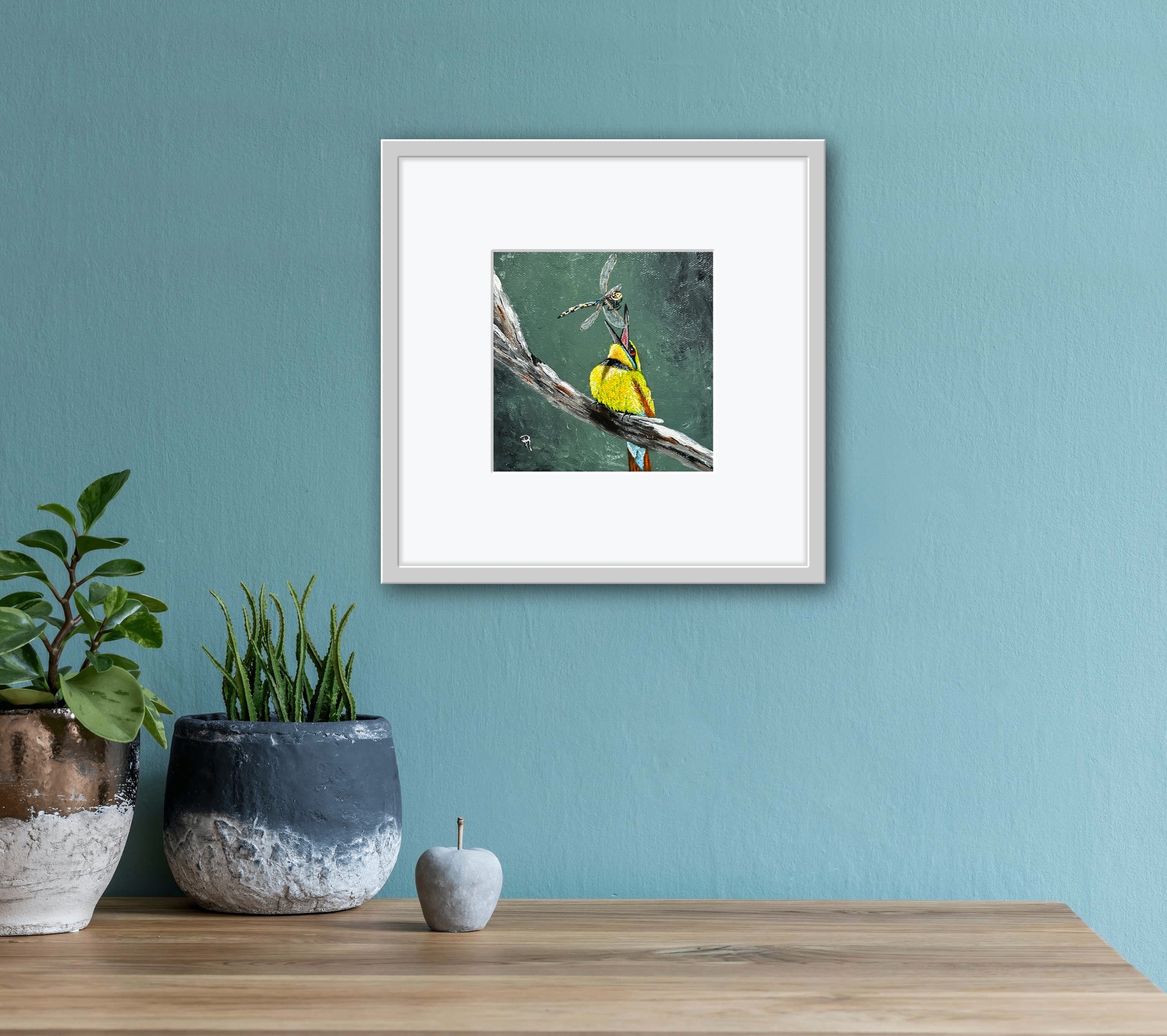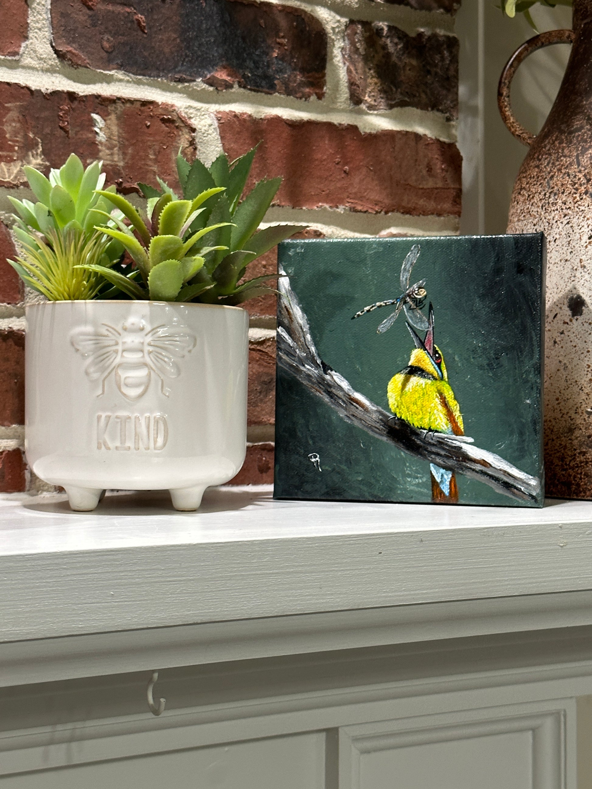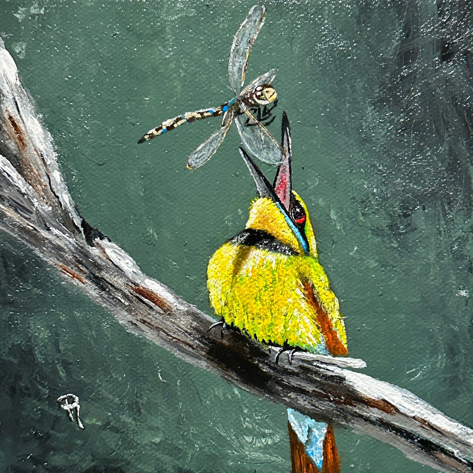 This exquisite, one-of-a-kind acrylic painting depicts a majestic, Rainbow Bee Eater bird, mid-catch of its savory dinner, a dragonfly, frozen in time atop a verdant branch. Rainbow Bee Eaters dine on bees, dragonflies and other small insects and often toss them around before filling its tummy. The artful composition and sublime color palette of hues of green, create a stunning display of natural balance and beauty in a compact 6 x 6 inch size canvas.