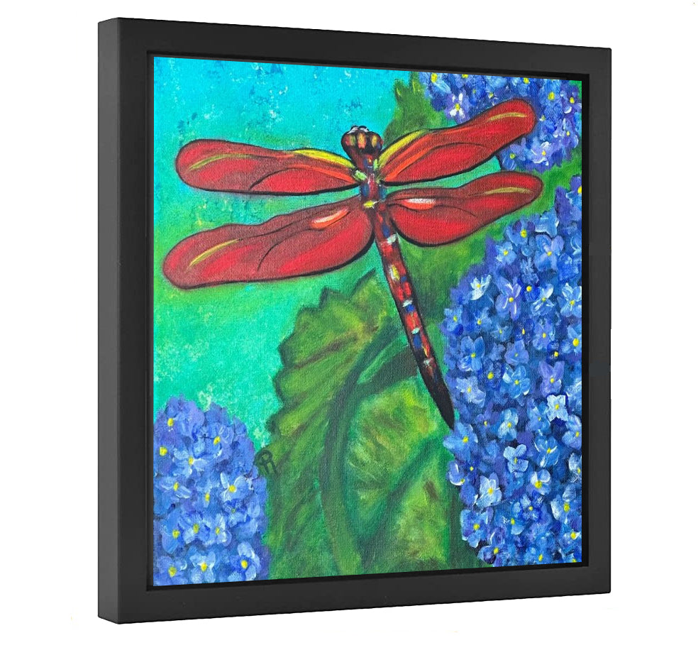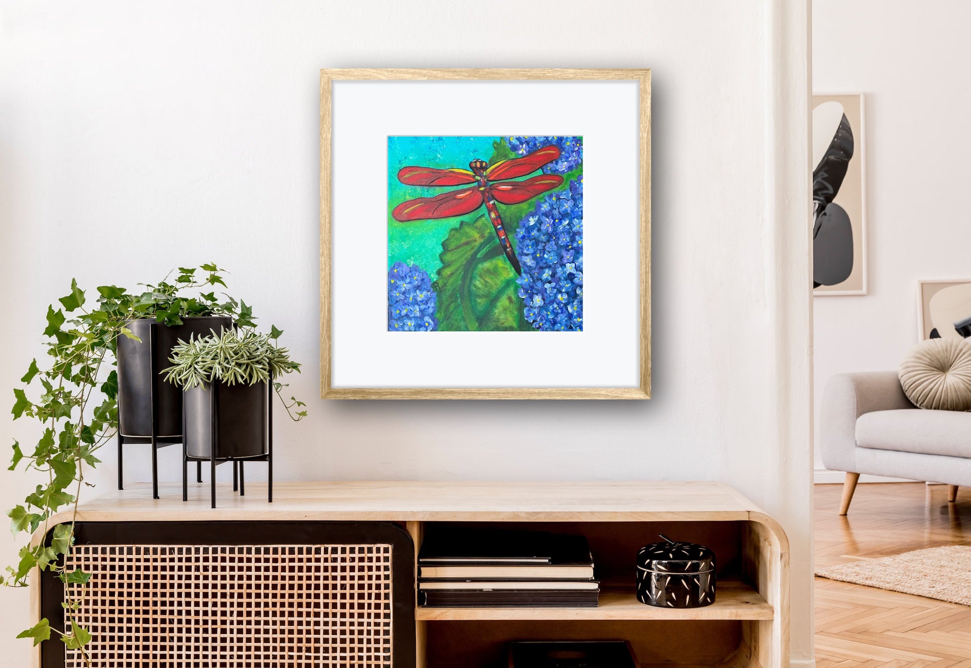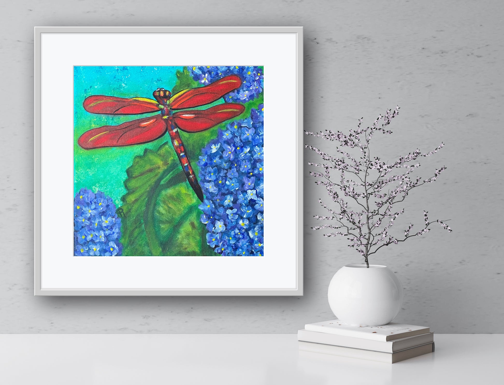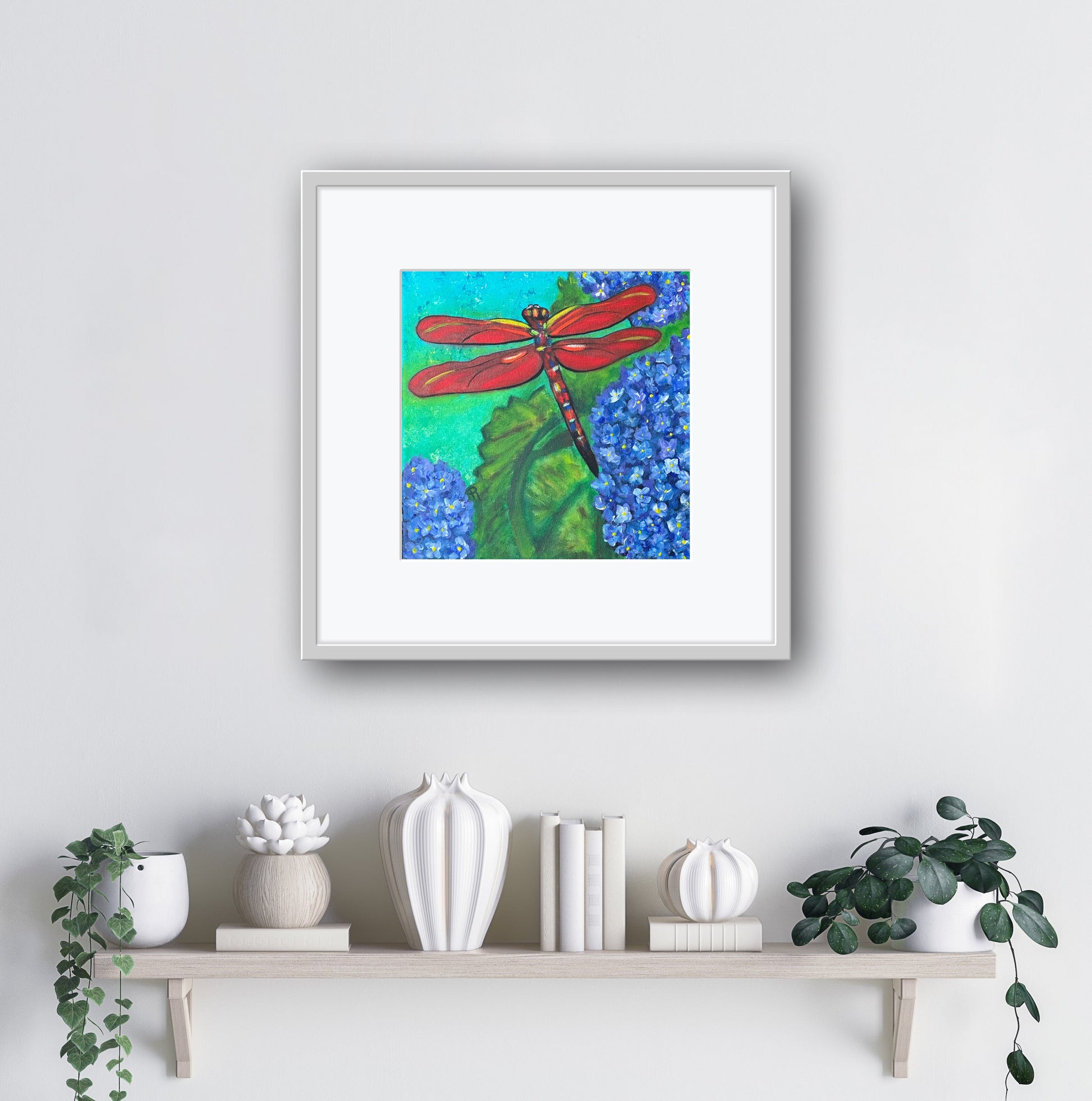 Add a bit of color to your home with this eye-catching Red Dragonfly Acrylic Painting! Featuring a vibrant red dragonfly and a dreamy background of lavender/blue hydrangea flowers, this original hand-painted artwork is sure to bring a little extra luck to your home.