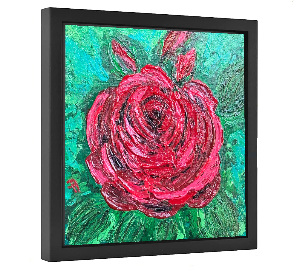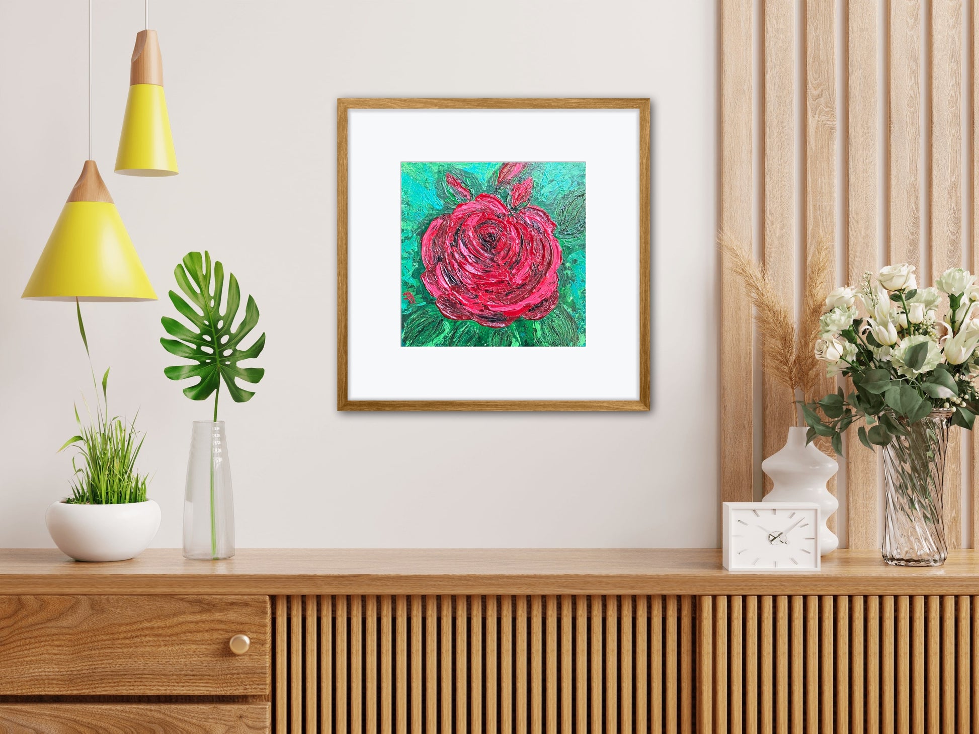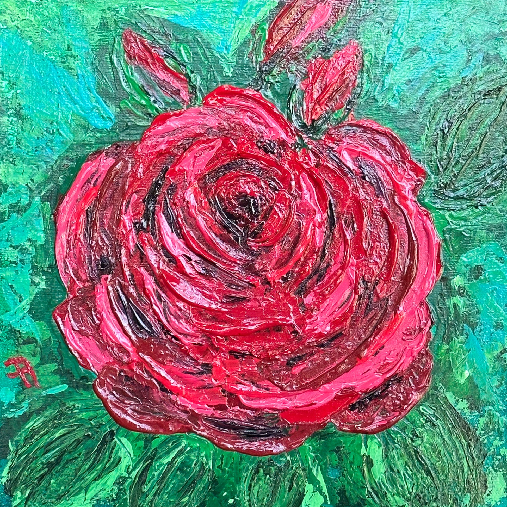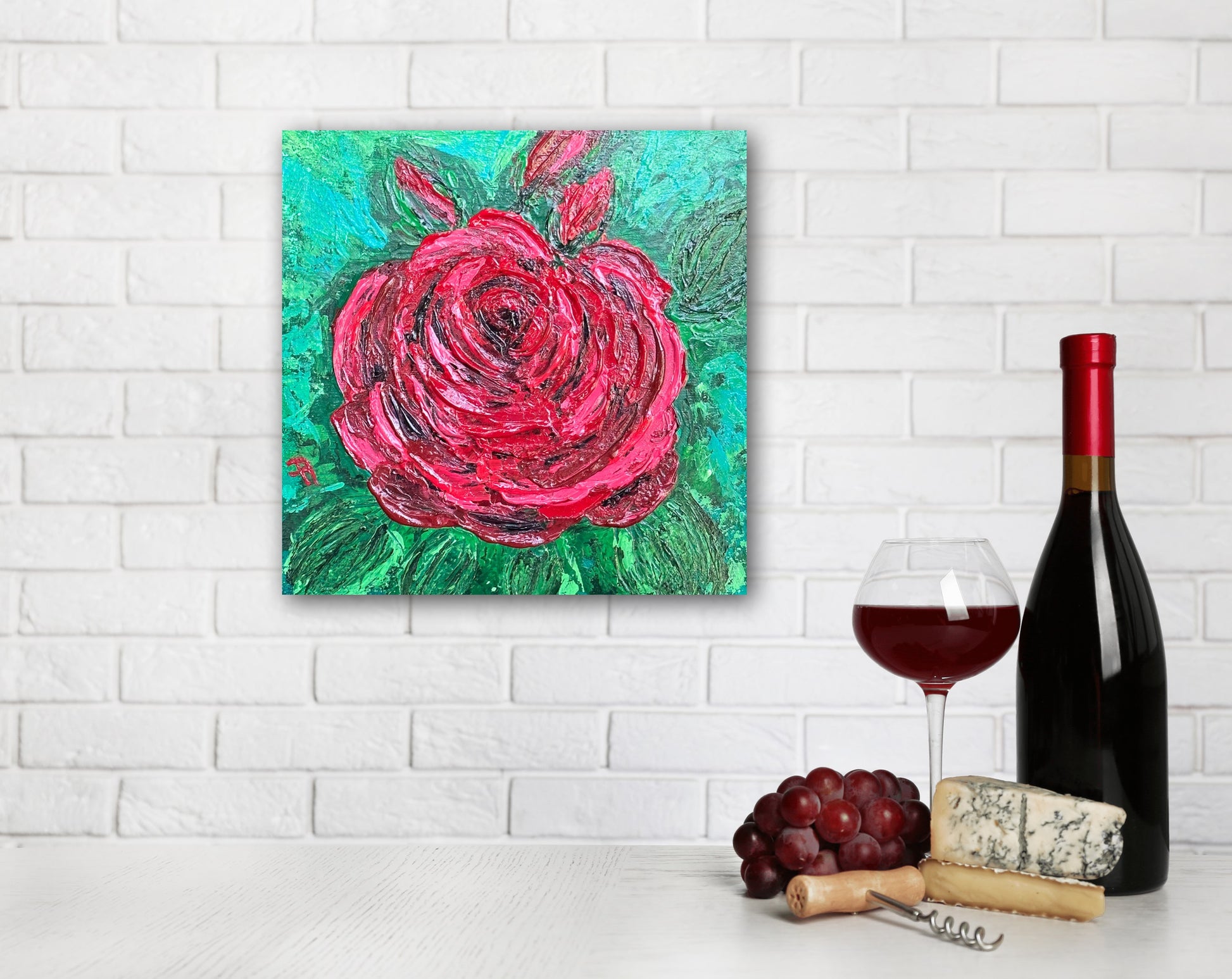 This stunning, palette knife acrylic painting features a red rose in full bloom, contrasted with dark complementary greens. The textured background adds depth and interest to the piece. A beautiful artwork that is sure to catch the eye of admirers.