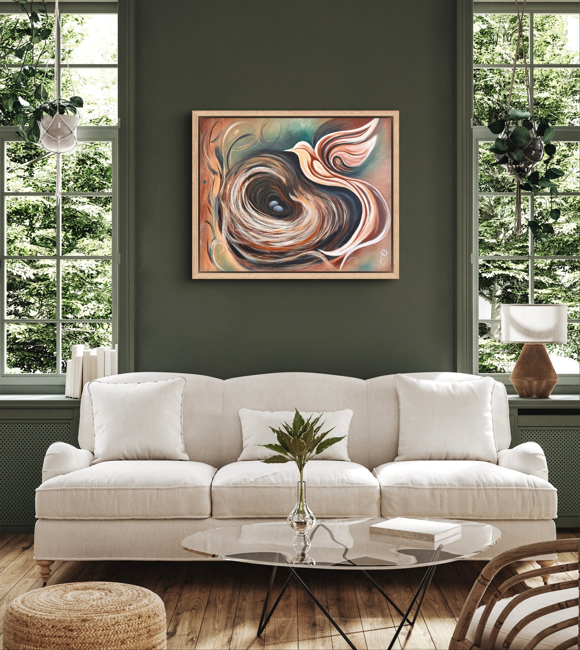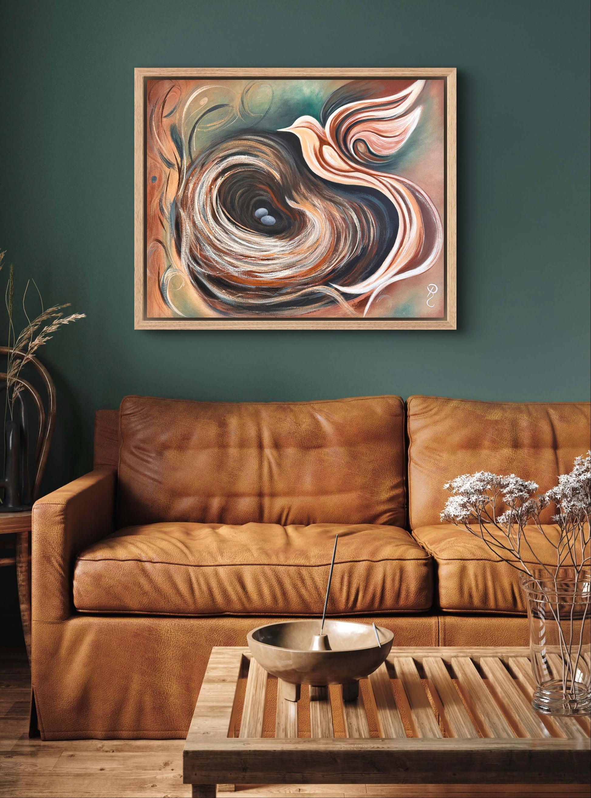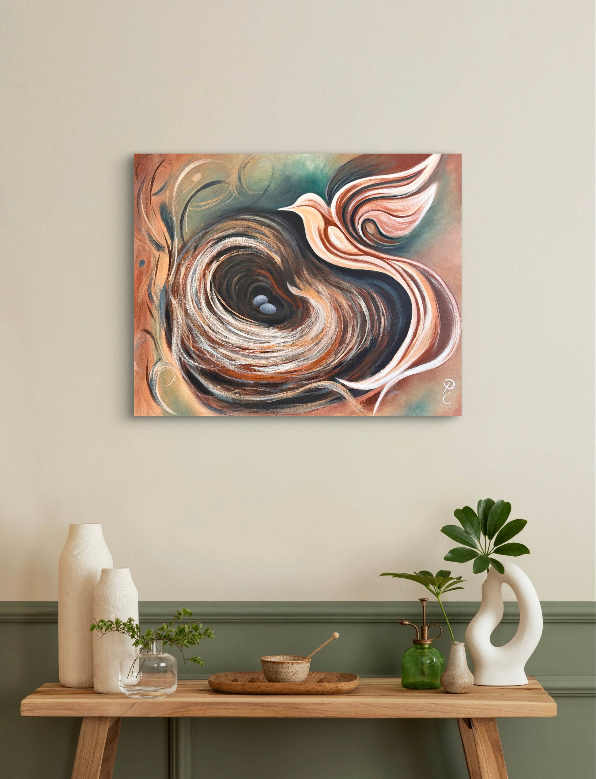 Safe Haven is a captivating piece that portrays the soothing and protective nature of a bird’s nest. Painted with intricate swirls and soft, flowing lines, this artwork evokes a sense of warmth and tranquility, making it the perfect reminder of the comfort and security found at home. The earthy tones and graceful movements of the bird symbolize the nurturing essence of a place to rest and feel at peace.