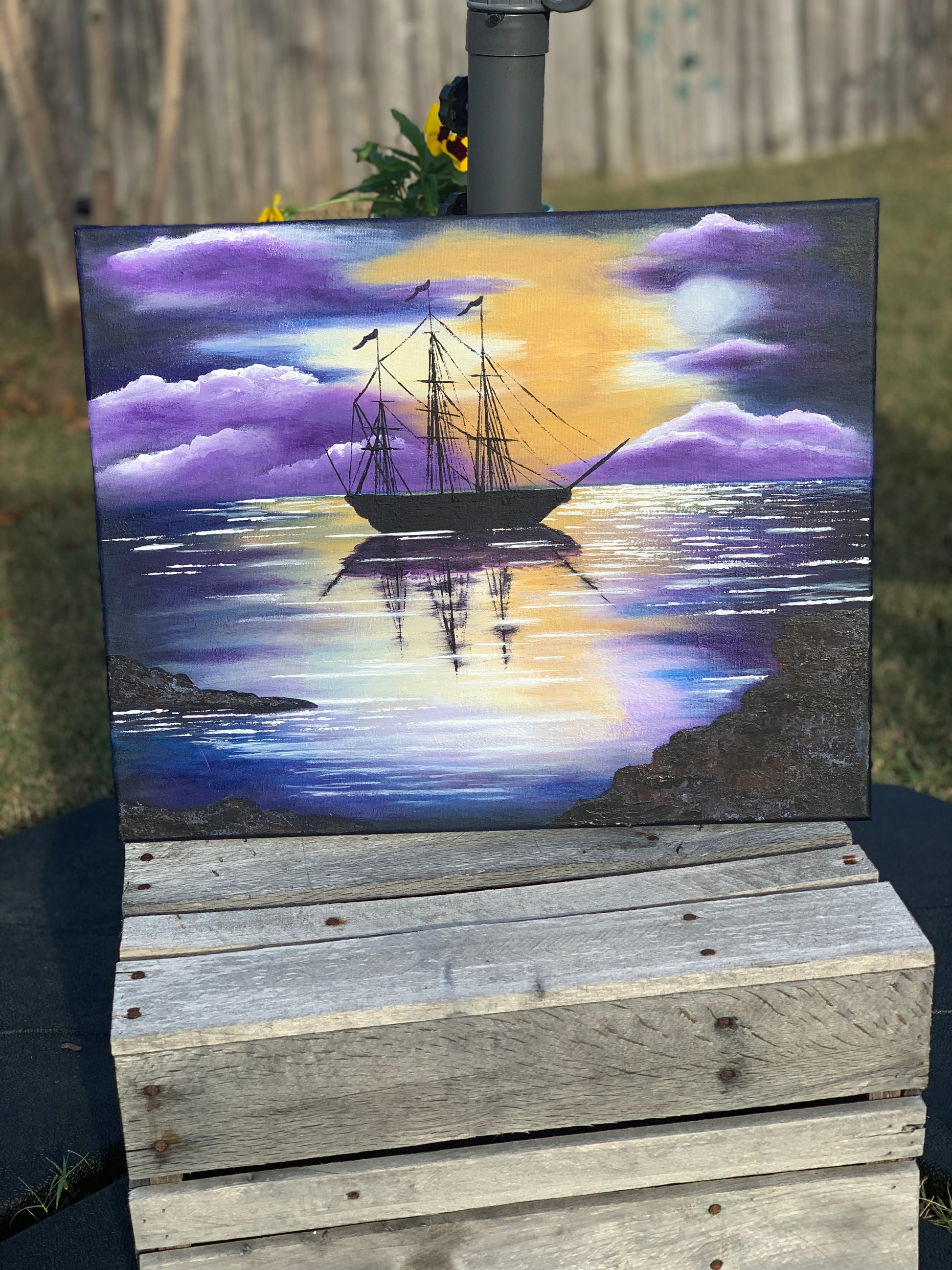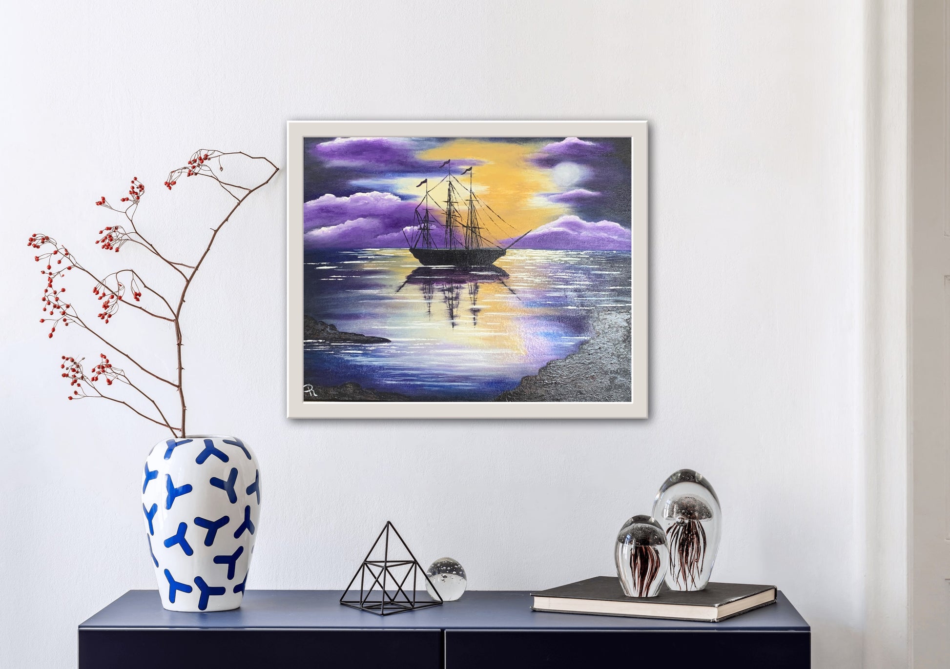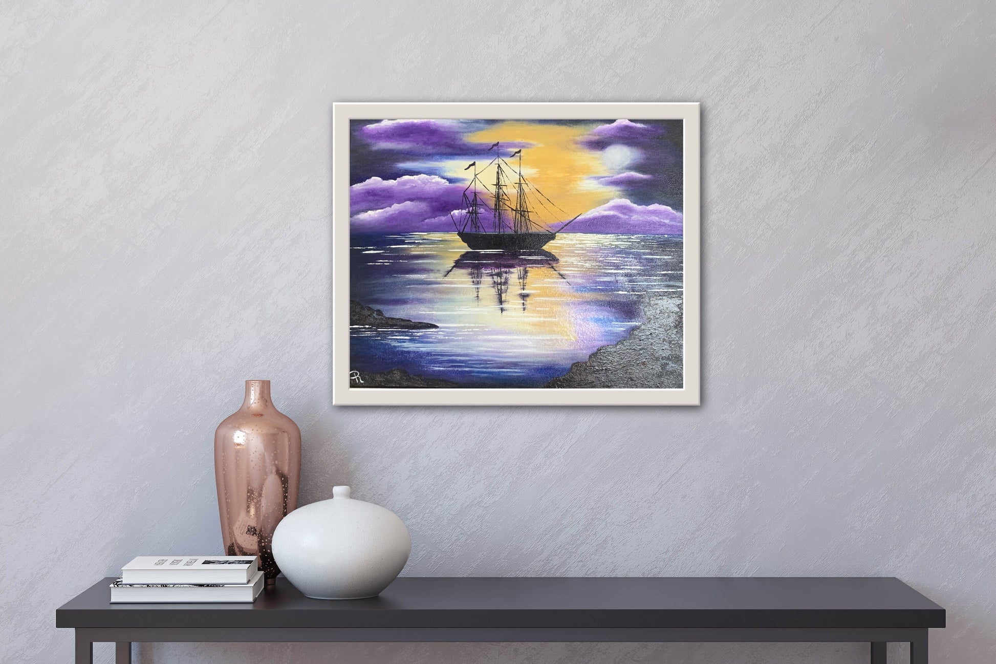 Do you love sailboats? This sailboat painting shows a ship with its sails down gently gliding across the sea at night. Dark blues, purples and yellows light up the sky and reflect in the water. You can almost see it moving past the rock formations in the foreground.