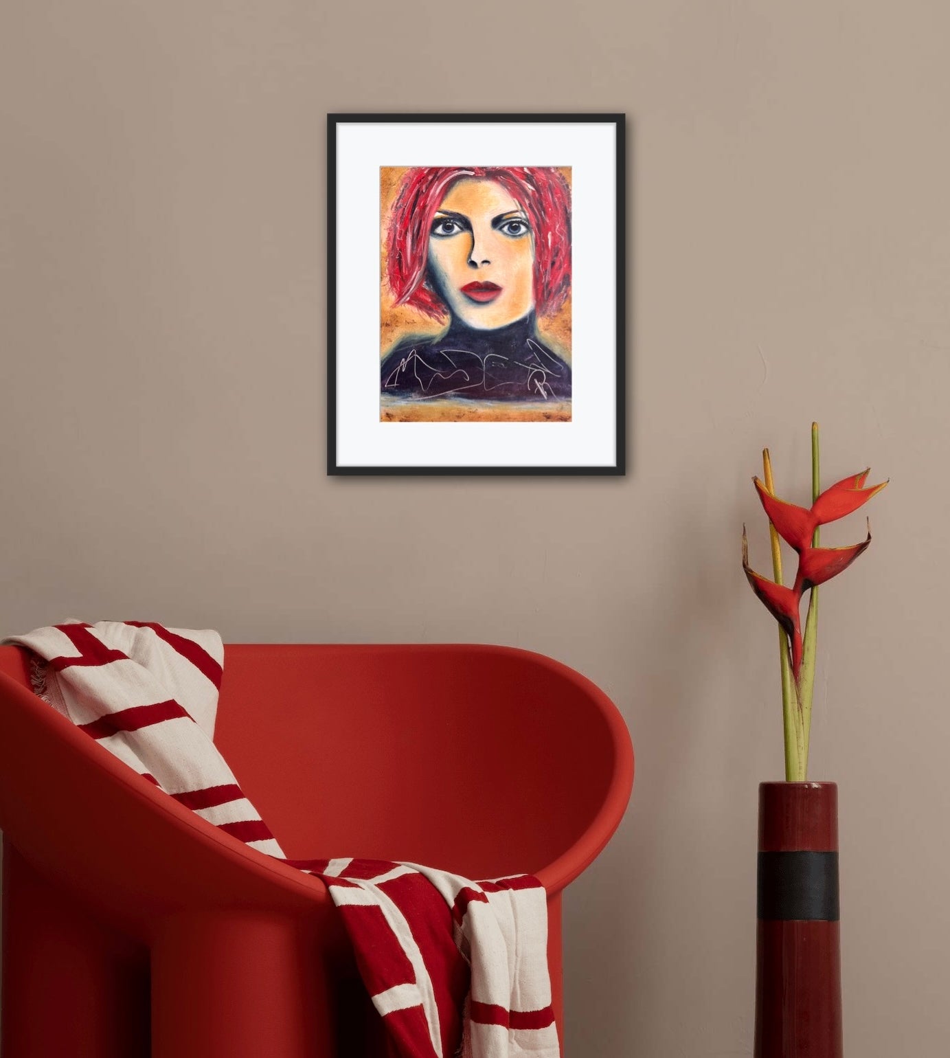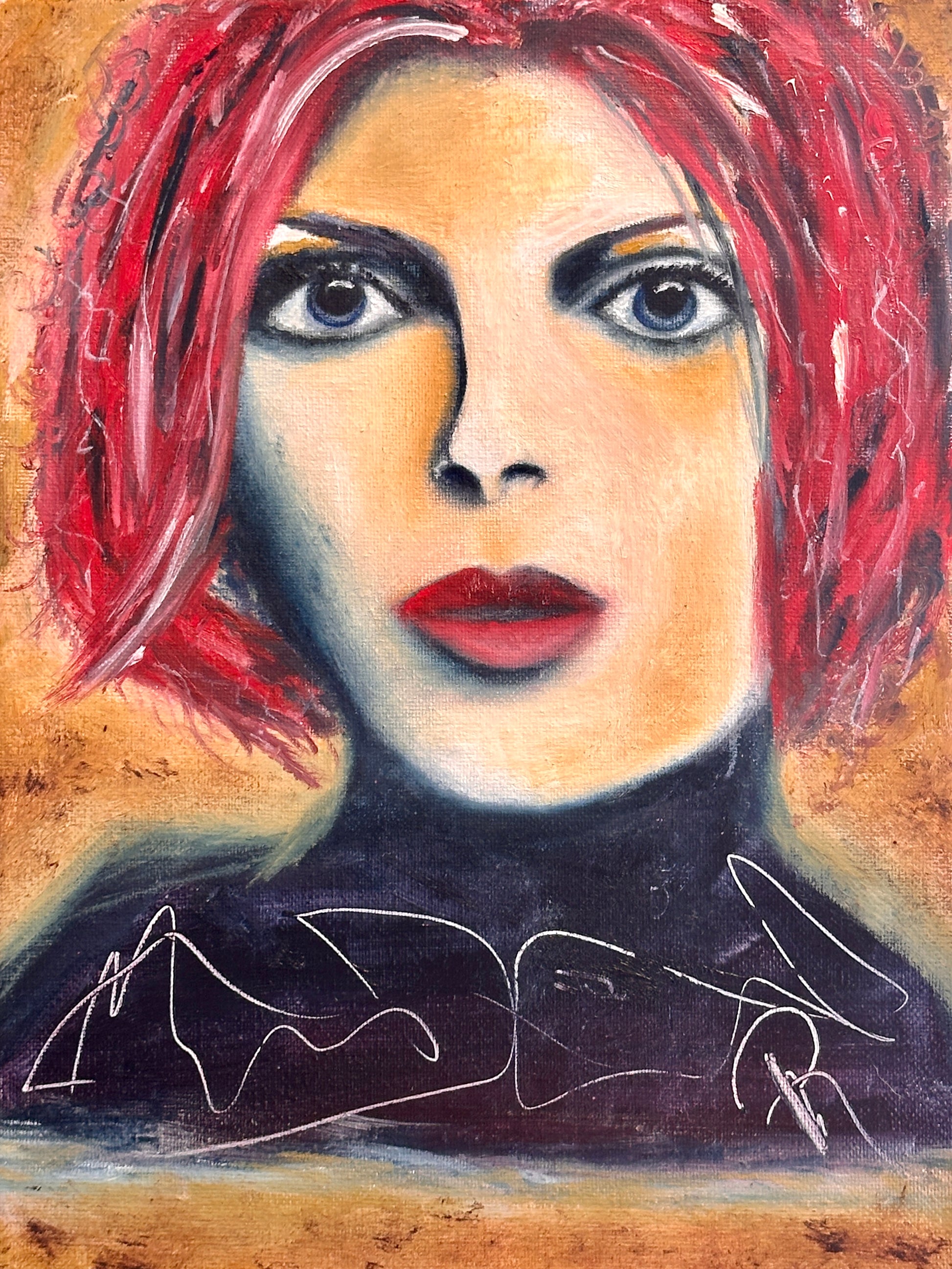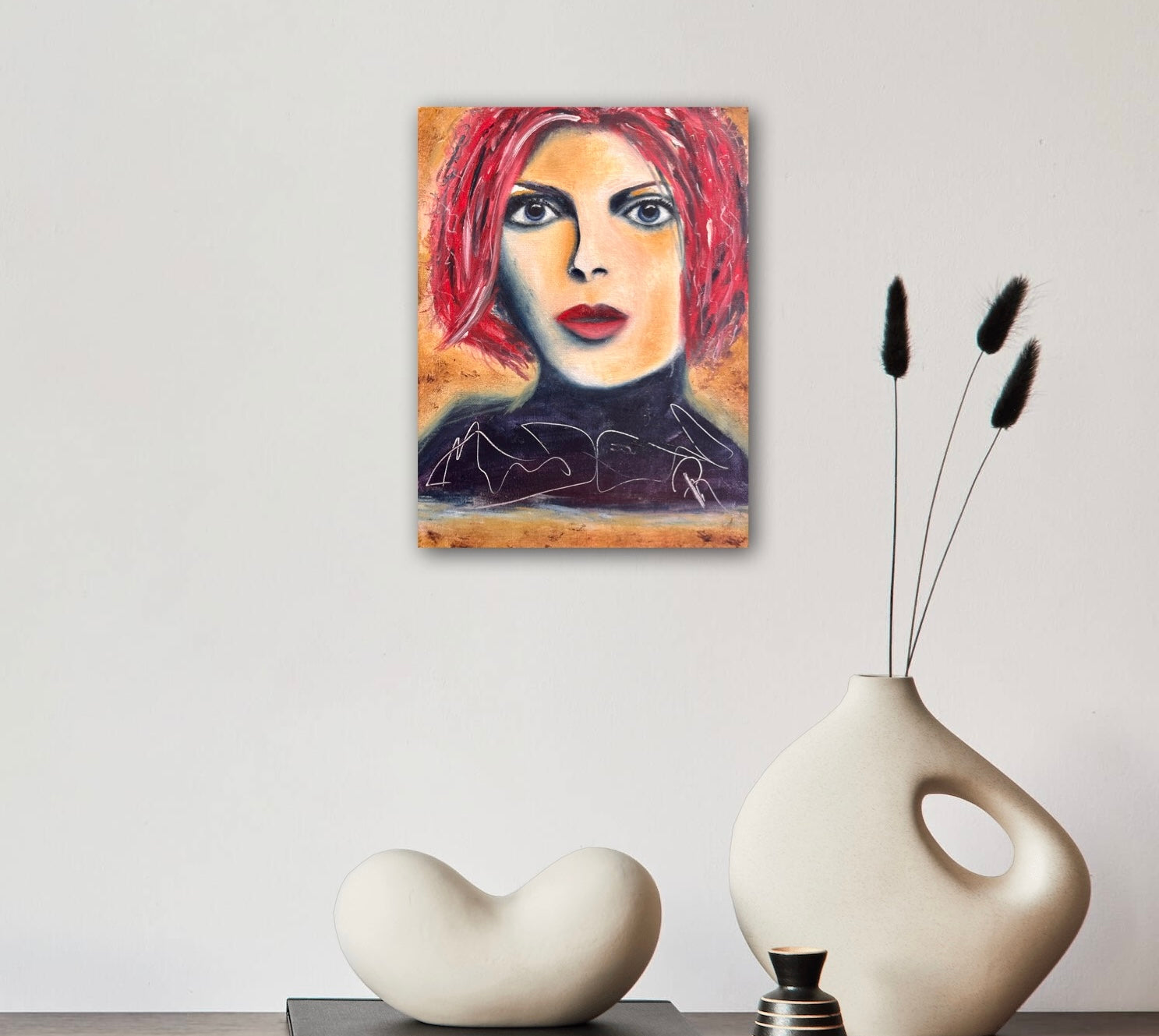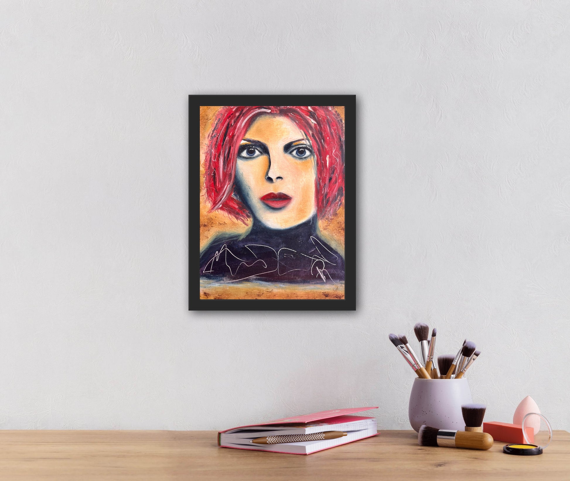 Add a touch of quirk to your art collection with Scarlet Steele, an oil painting of an abstract portrait of a woman with stunning red hair and piercing blue eyes. Referencing Ruby Fern another painting of her older sister, this playful piece adds a pop of color to any room and sparks the imagination with its unique story.