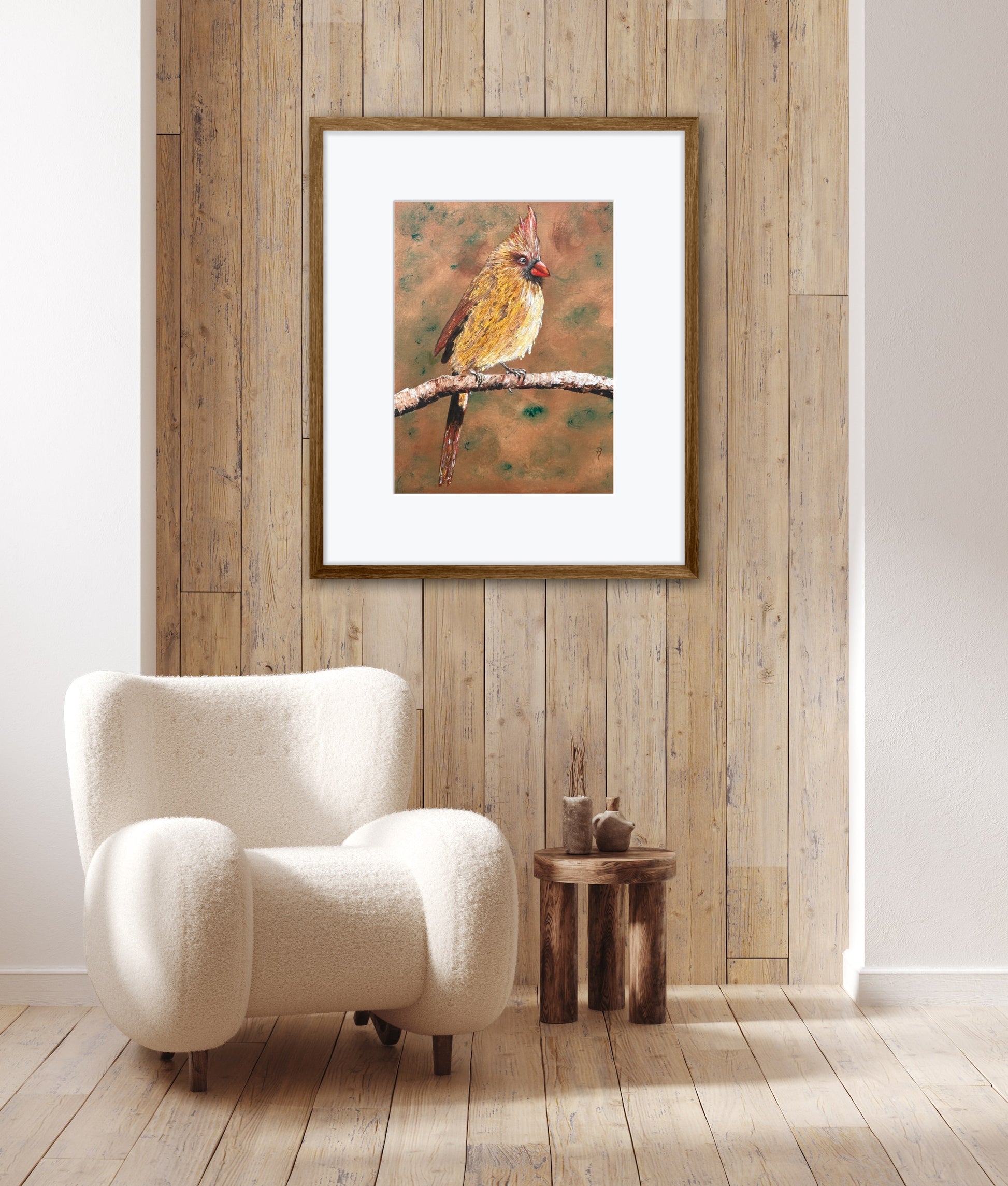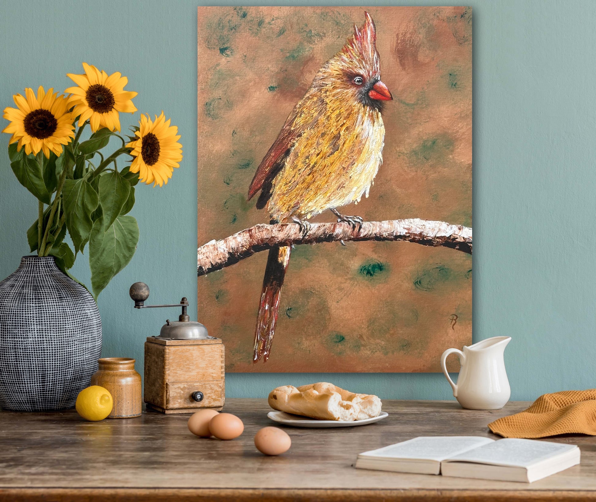 Say hello to this "Sitting Pretty" female cardinal! This acrylic painting features the beauty of a female cardinal perched on a branch, contrasted against a soft background of brown and green. This stunning piece of art is sure to add a bit of color to any room!