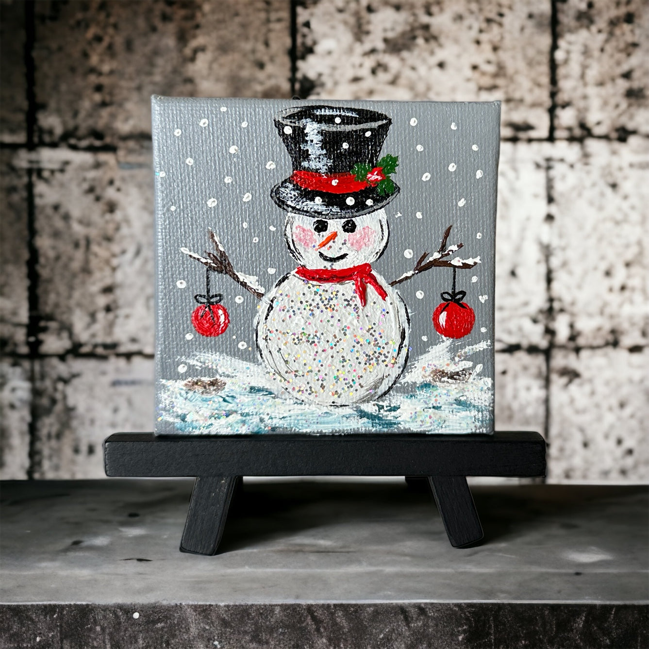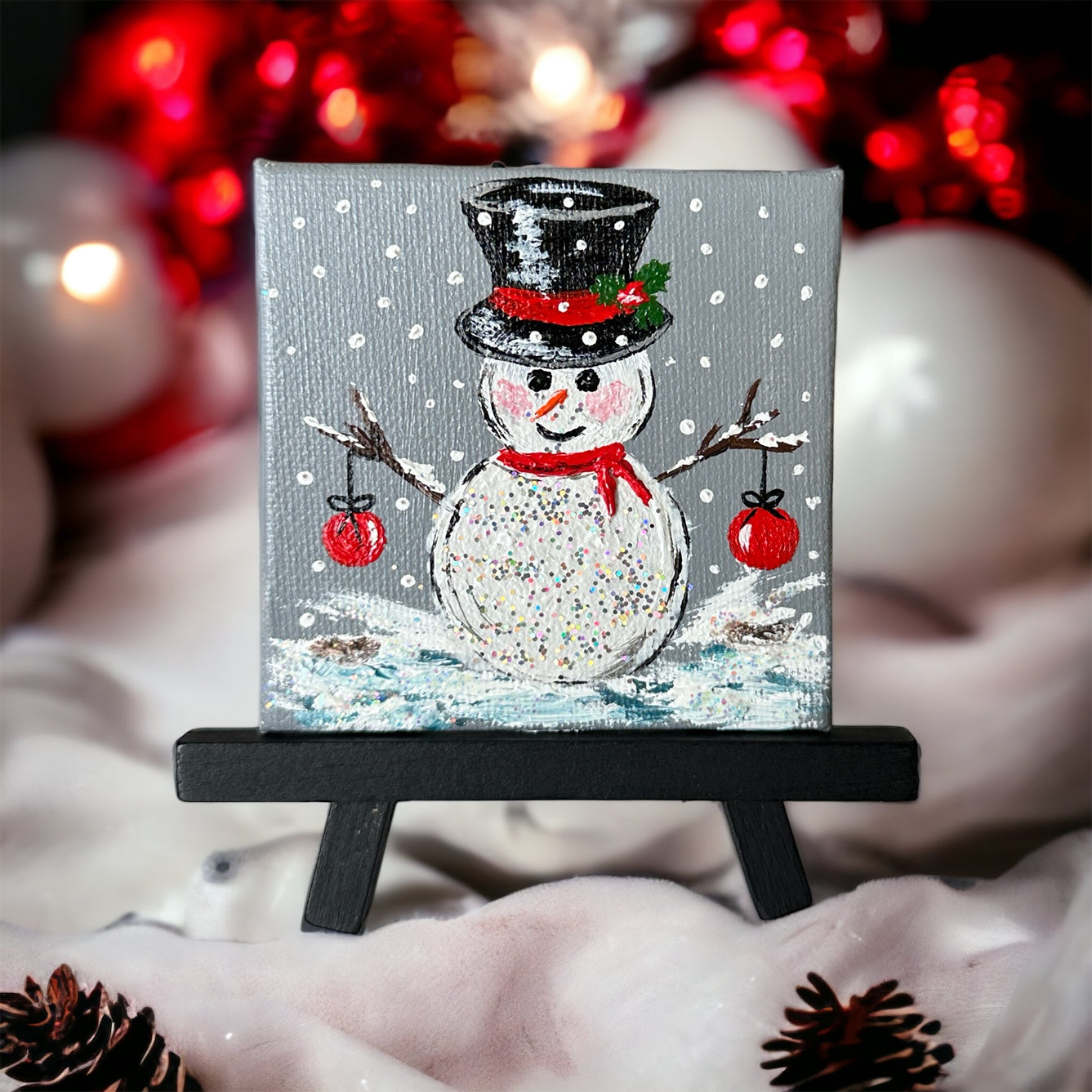 Bring a bit of winter wonderland to your home with this charming miniature 3" x 3" painting of a jolly snowman standing in the snow with two adorable ornaments. Perfect for spreading winter cheer!