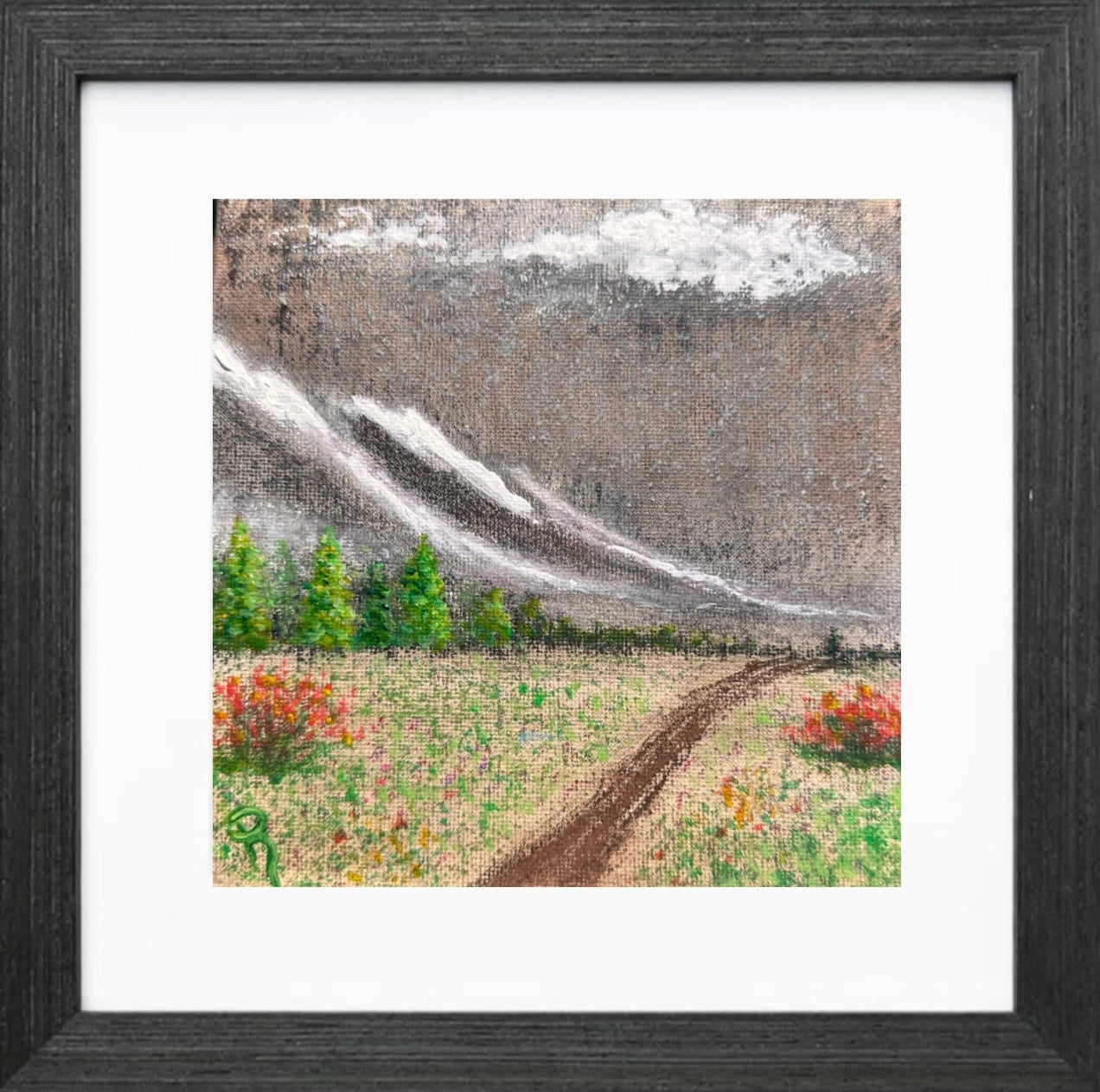 Discover the breathtaking beauty of nature in this Snowy Spring Summit Mixed Media Painting. With a mixture of charcoal, soft pastels, and acrylic paint, this small painting captures the stunning contrast between a snow capped mountain and a lively spring meadow with wildflowers. Bring a touch of the great outdoors into your home with this one-of-a-kind work of art.