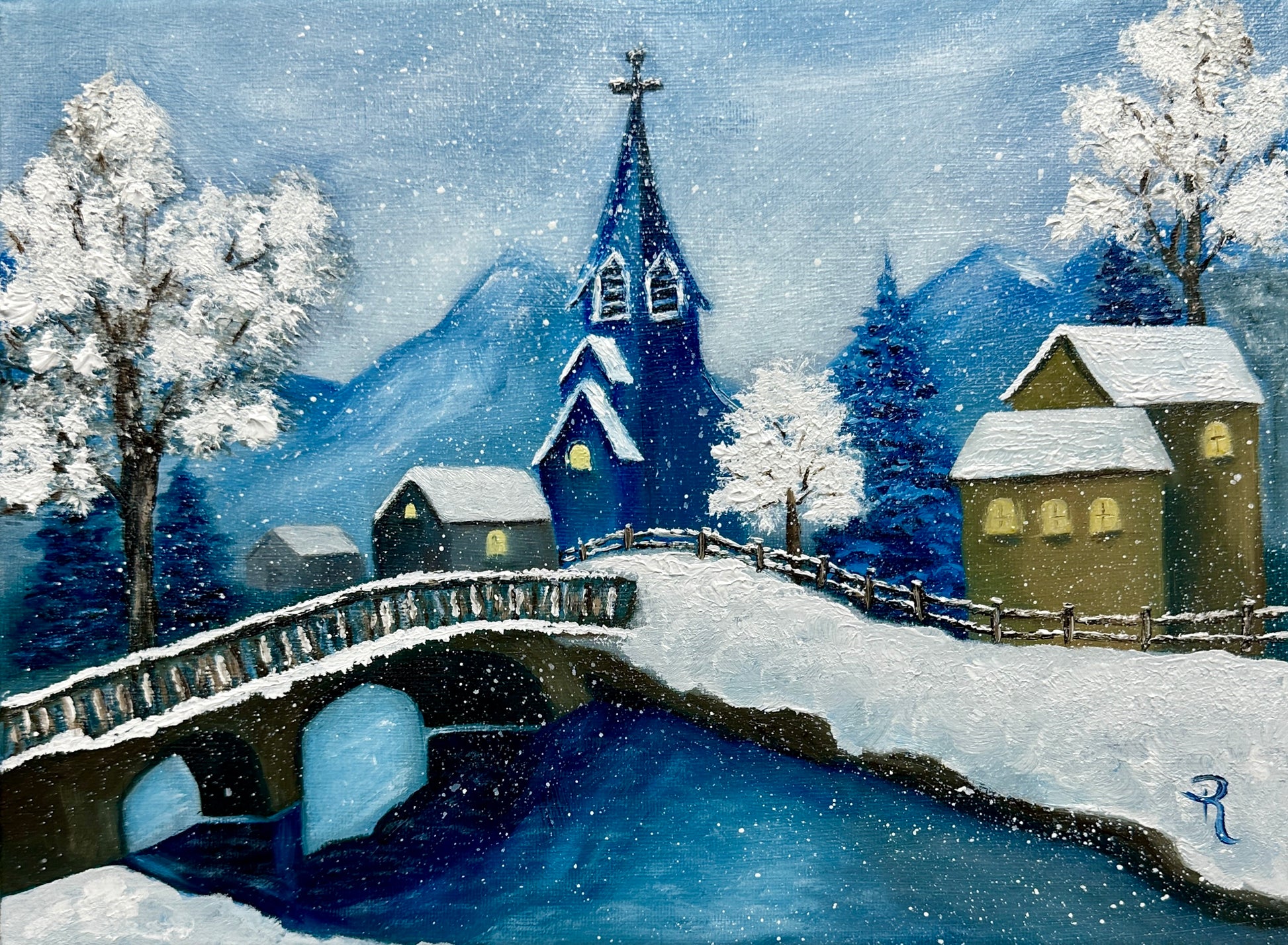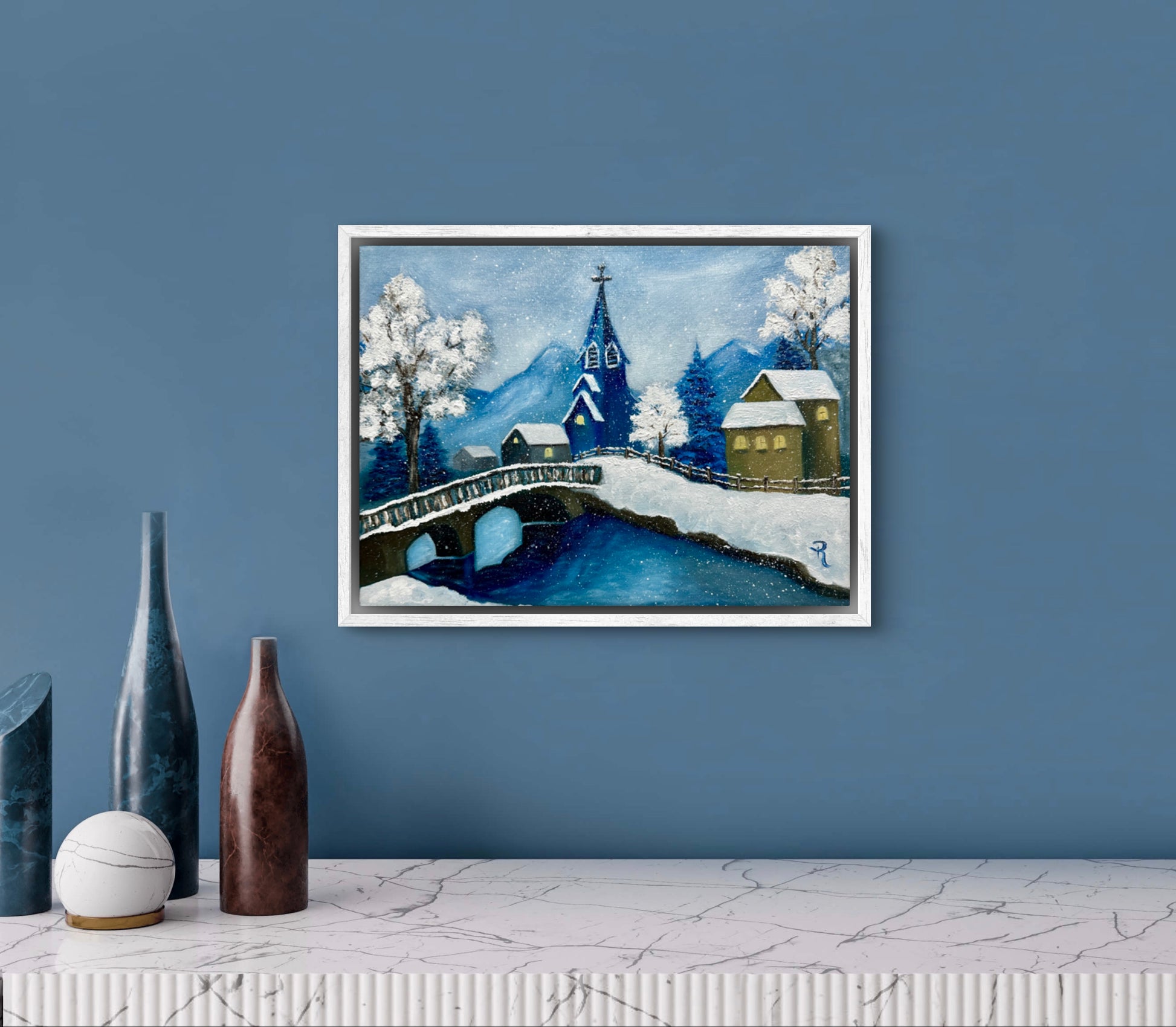 Take a stroll through a whimsical winter world with this snowy oil painting. A charming church and walking bridge set the scene as snowflakes fall gracefully onto blue and white-topped trees. With majestic mountains in the background, this landscape painting captures the tranquil beauty of the winter season.