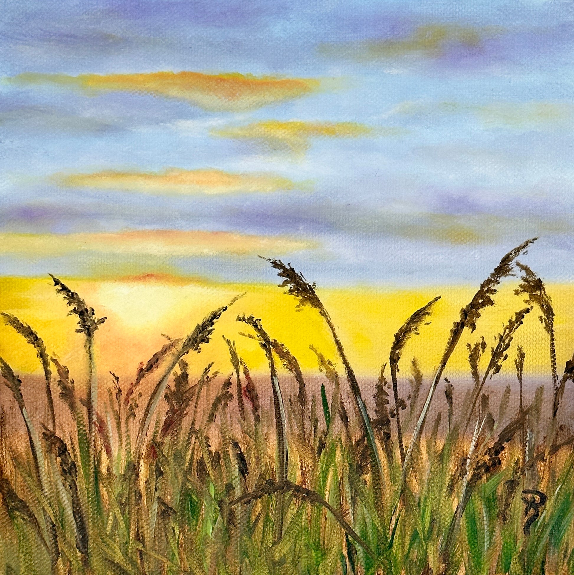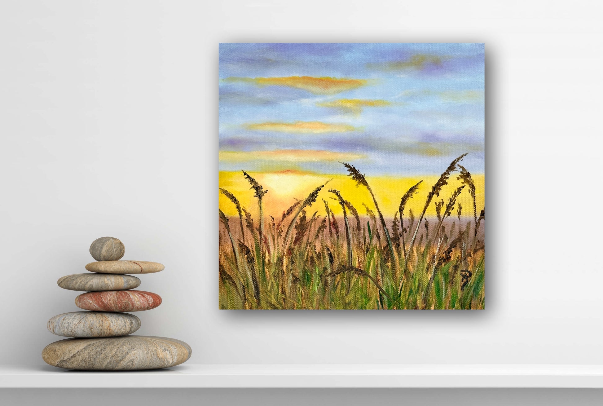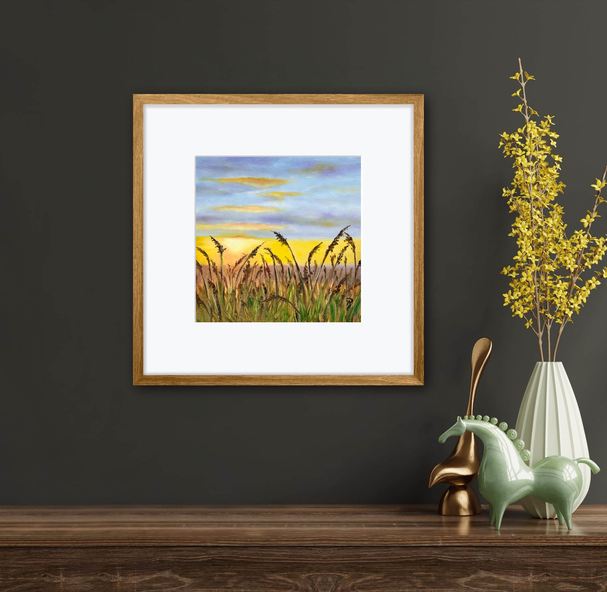 This beautiful Sunset Fields Painting is a stunning representation of a breathtaking sunset over a lush wheat field. Crafted with oil paints, the vivid colors and lifelike texture make this painting a perfect seasonal fall choice for your home. Let it bring a peaceful, tranquil atmosphere to your space.