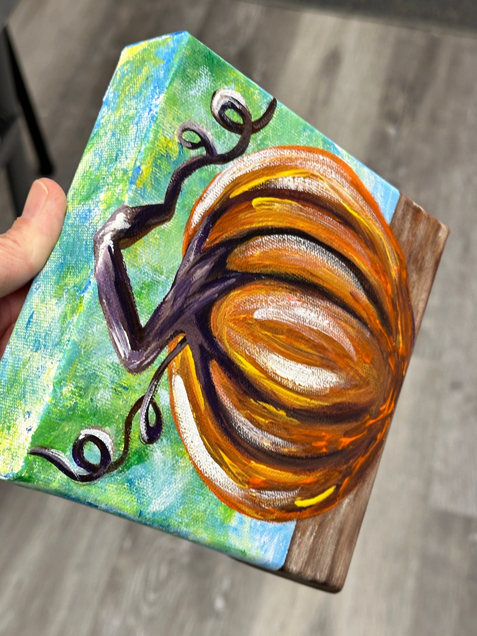 Add a touch of whimsy to your home with our Tabletop Pumpkin Acrylic Painting. Featuring a small pumpkin on a tabletop with a charming backdrop of trees, clouds and sunlight. Perfect for bringing a playful and lighthearted vibe to any room.