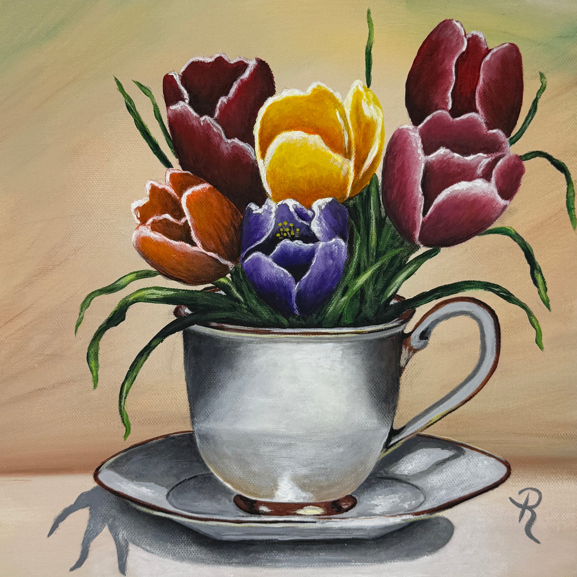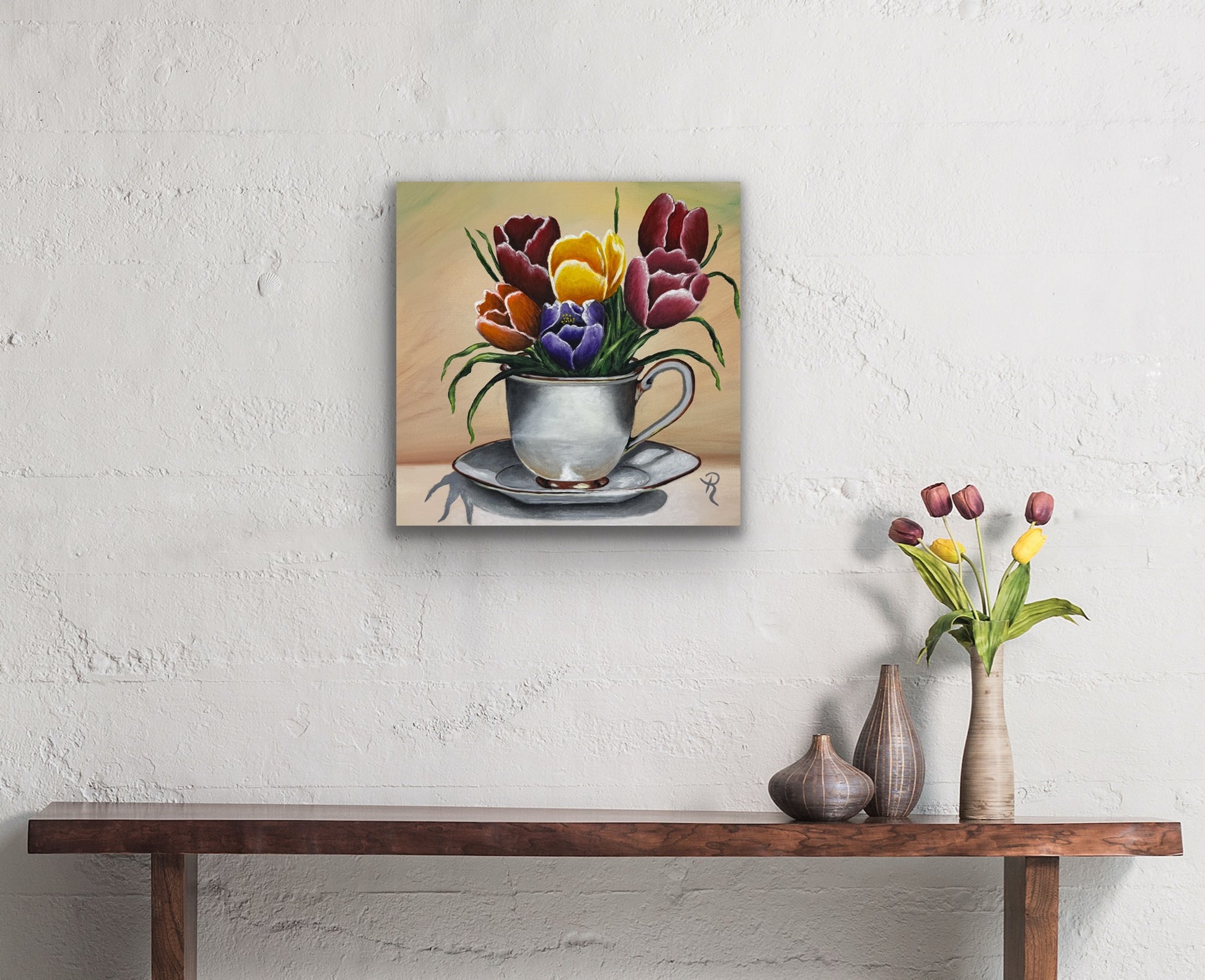 Brighten up your space with this charming Teacup Tulips acrylic painting. Featuring a vibrant teacup overflowing with colorful tulips, this painting is sure to bring a cheerful and inviting vibe to any room. Made with high-quality acrylics, this piece will add a touch of joy to your home décor.