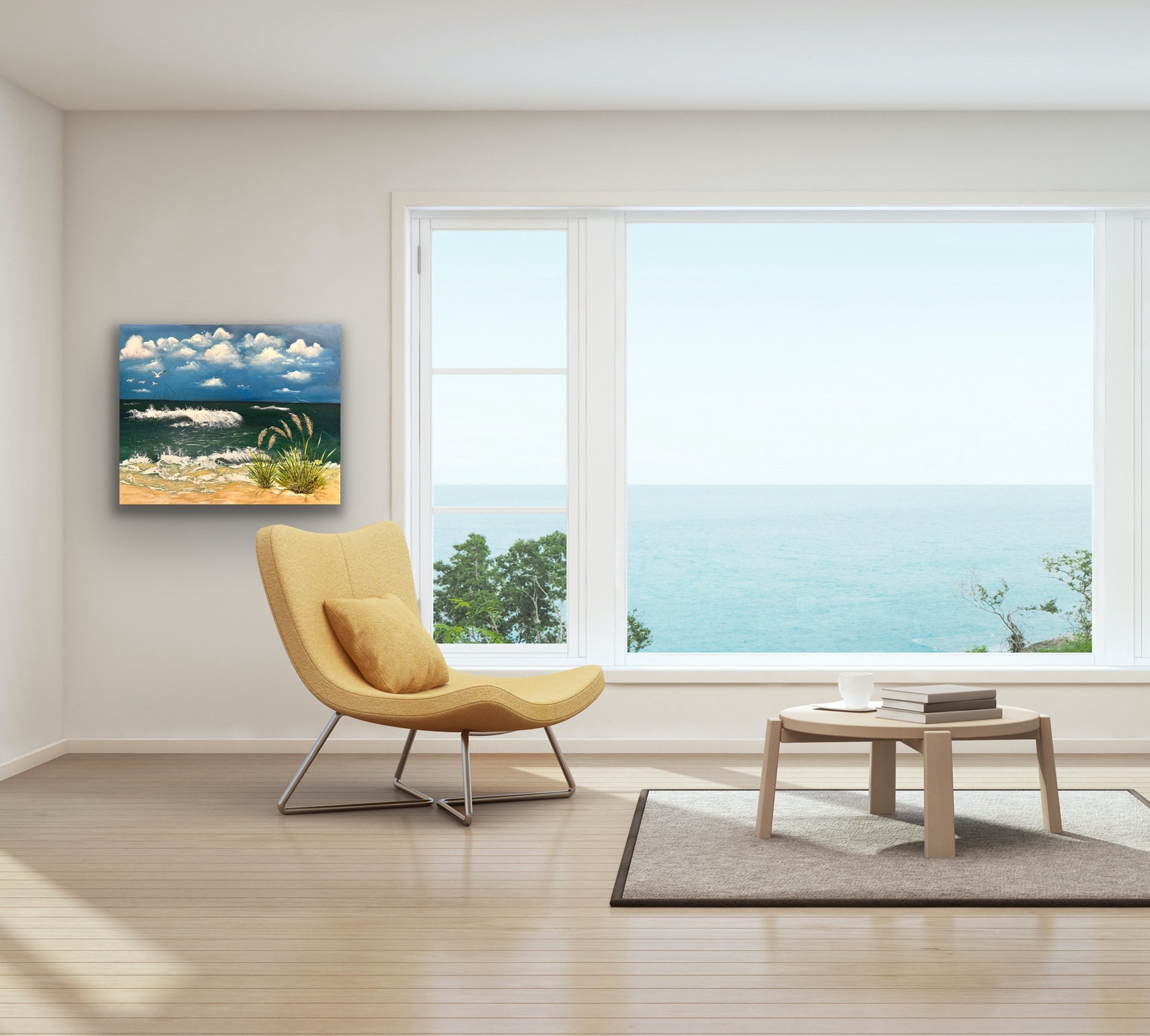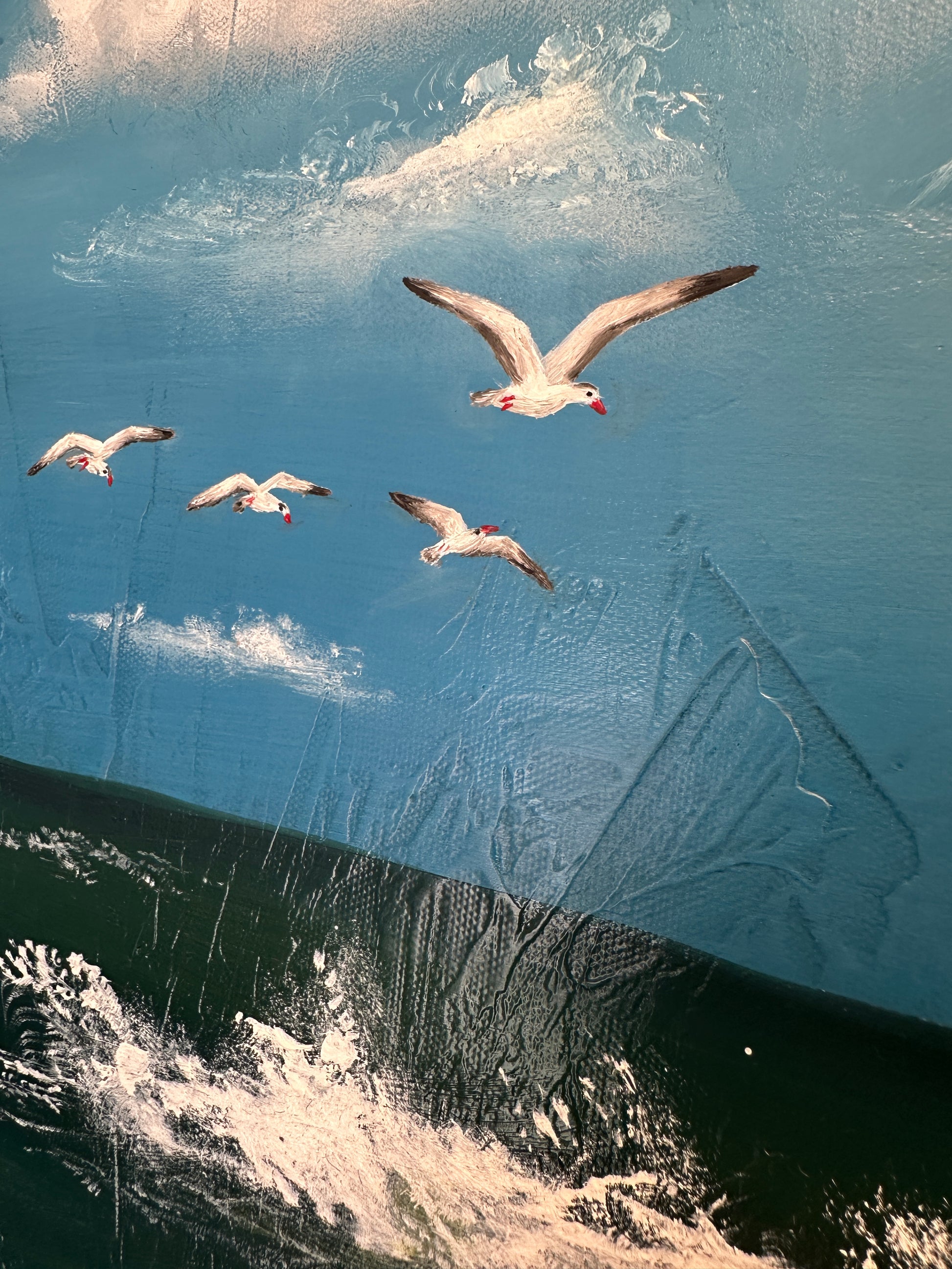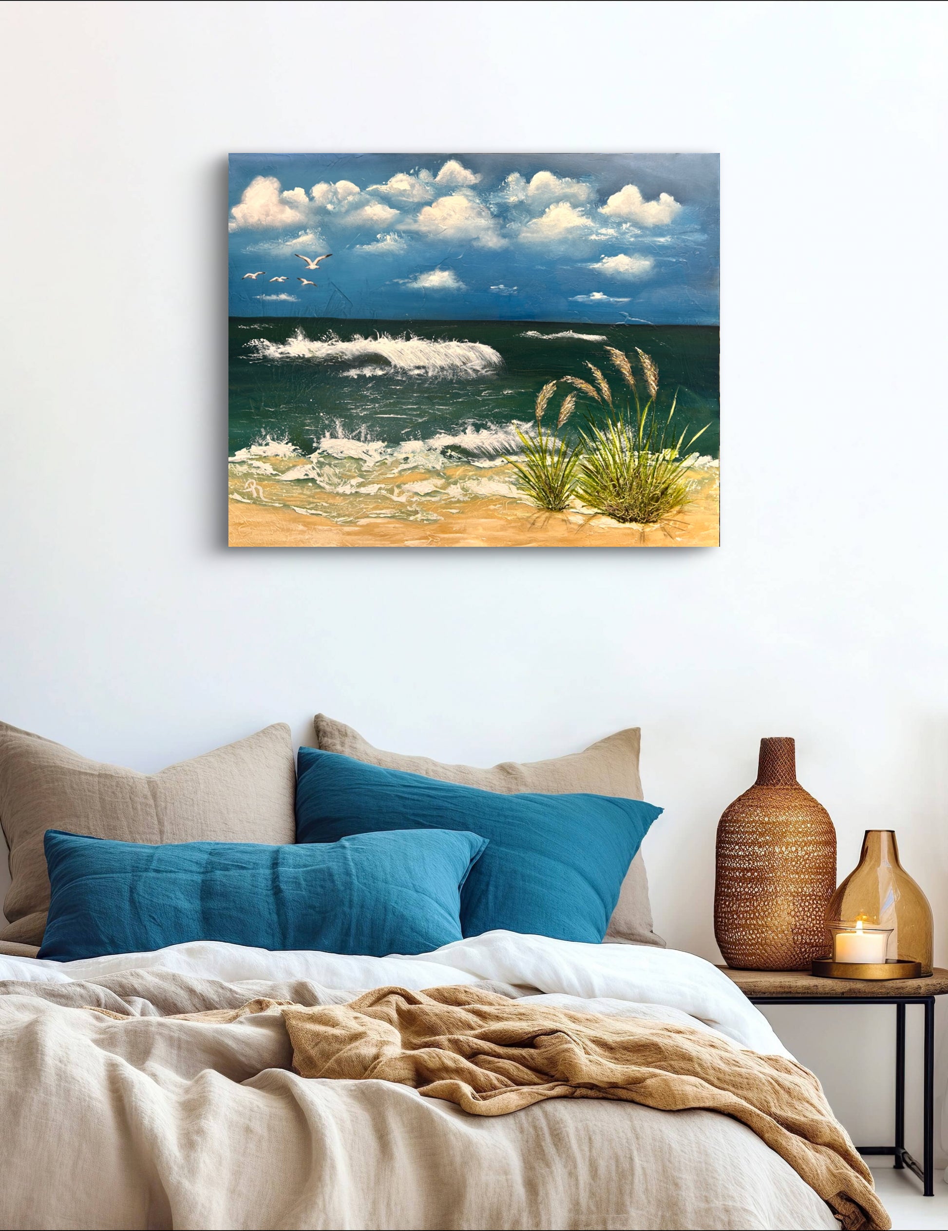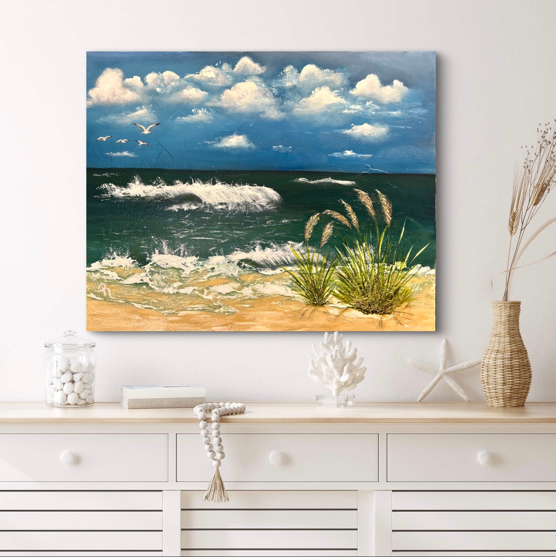 Indulge in the mesmerizing charm of The Emerald Sea Oil Painting. This textured piece depicts a tranquil ocean with a vibrant blue sky and graceful white clouds, accompanied by the soothing sound of crashing waves and the gentle breeze of seagulls. Adorn your space with this luxurious artwork and escape to the serene world of the sea.